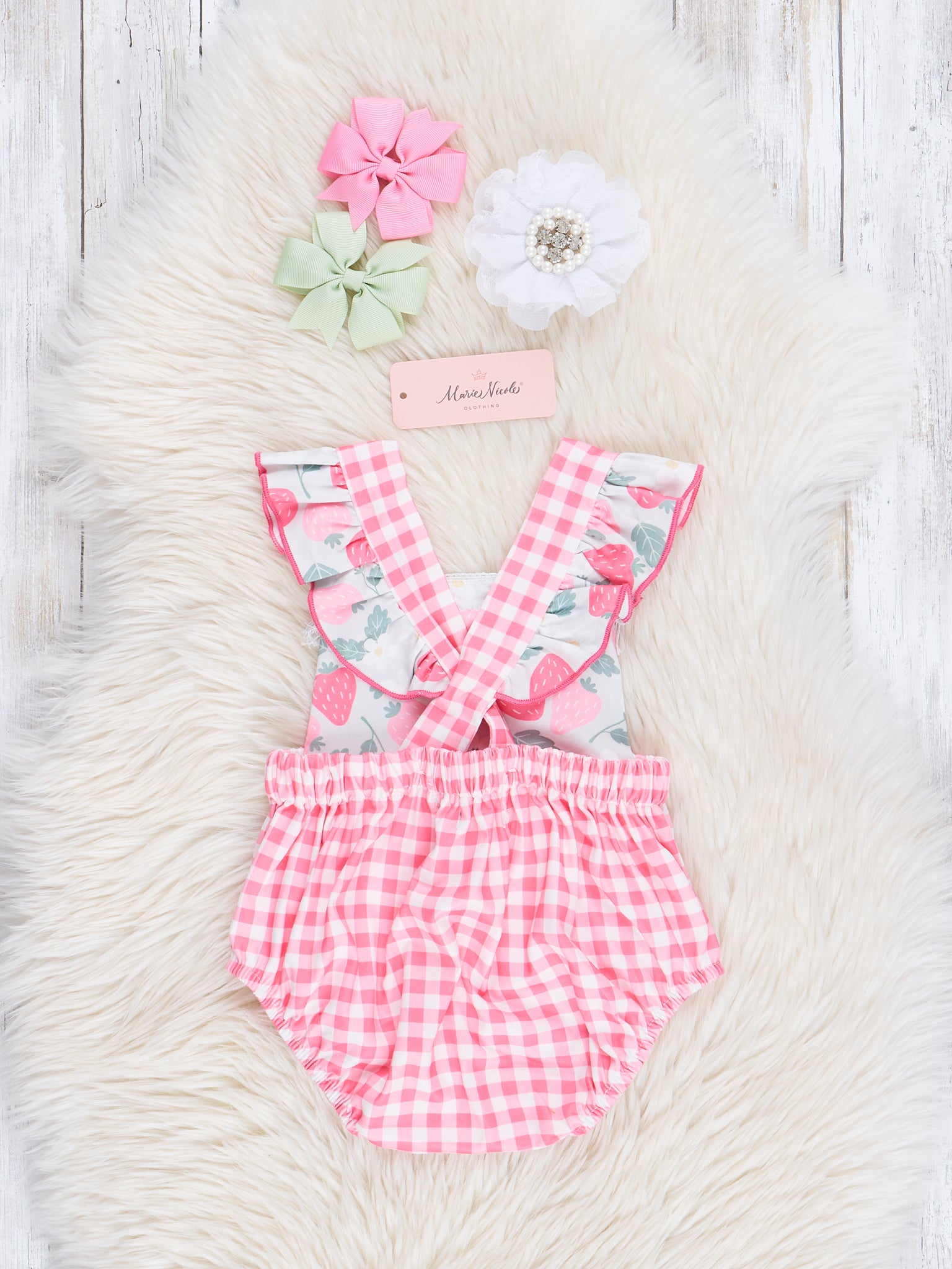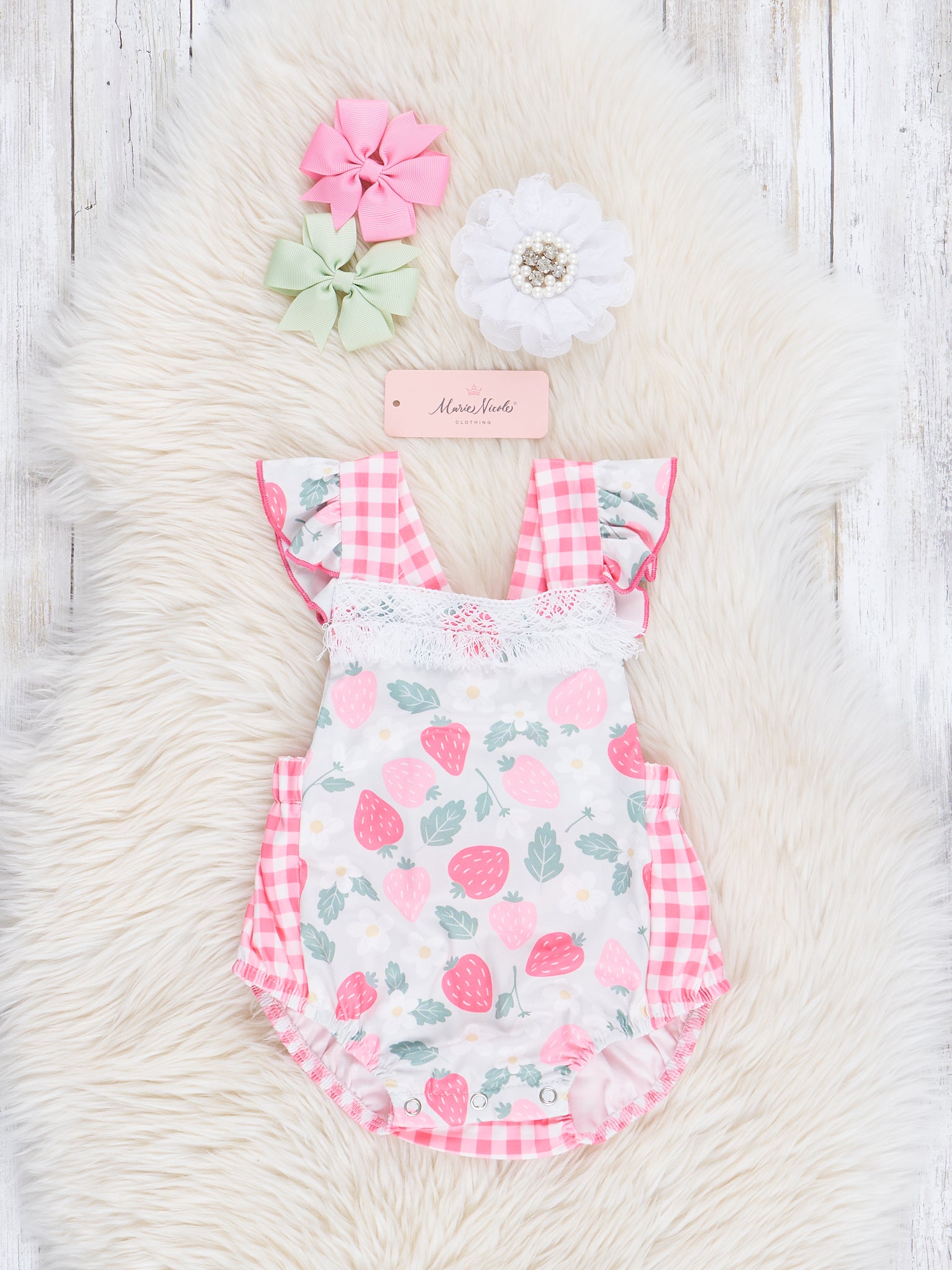 Head out to the strawberry patch with this sister set! Your little will stand out with this bubble featuring gingham and strawberry prints accented with lace trim!