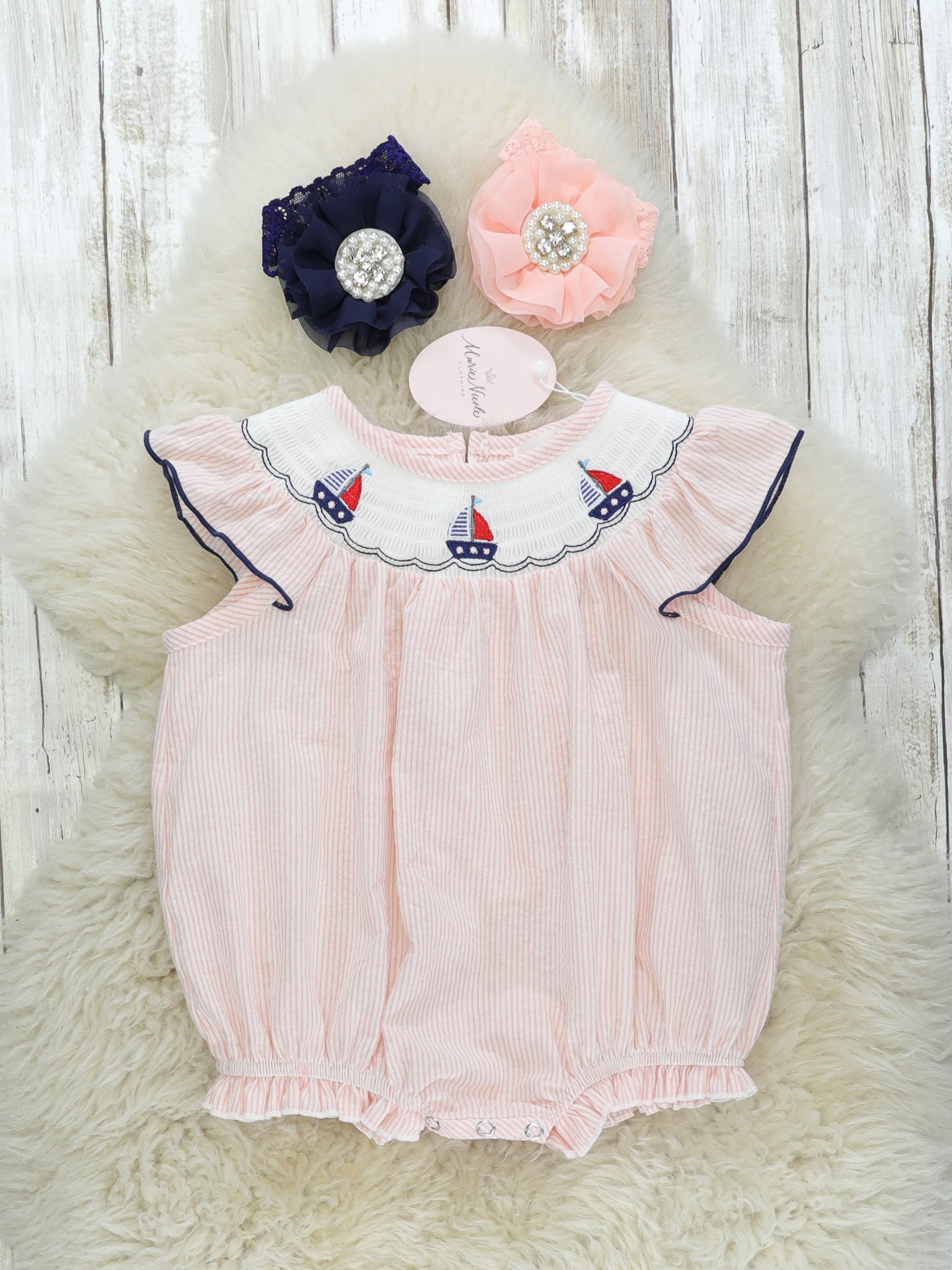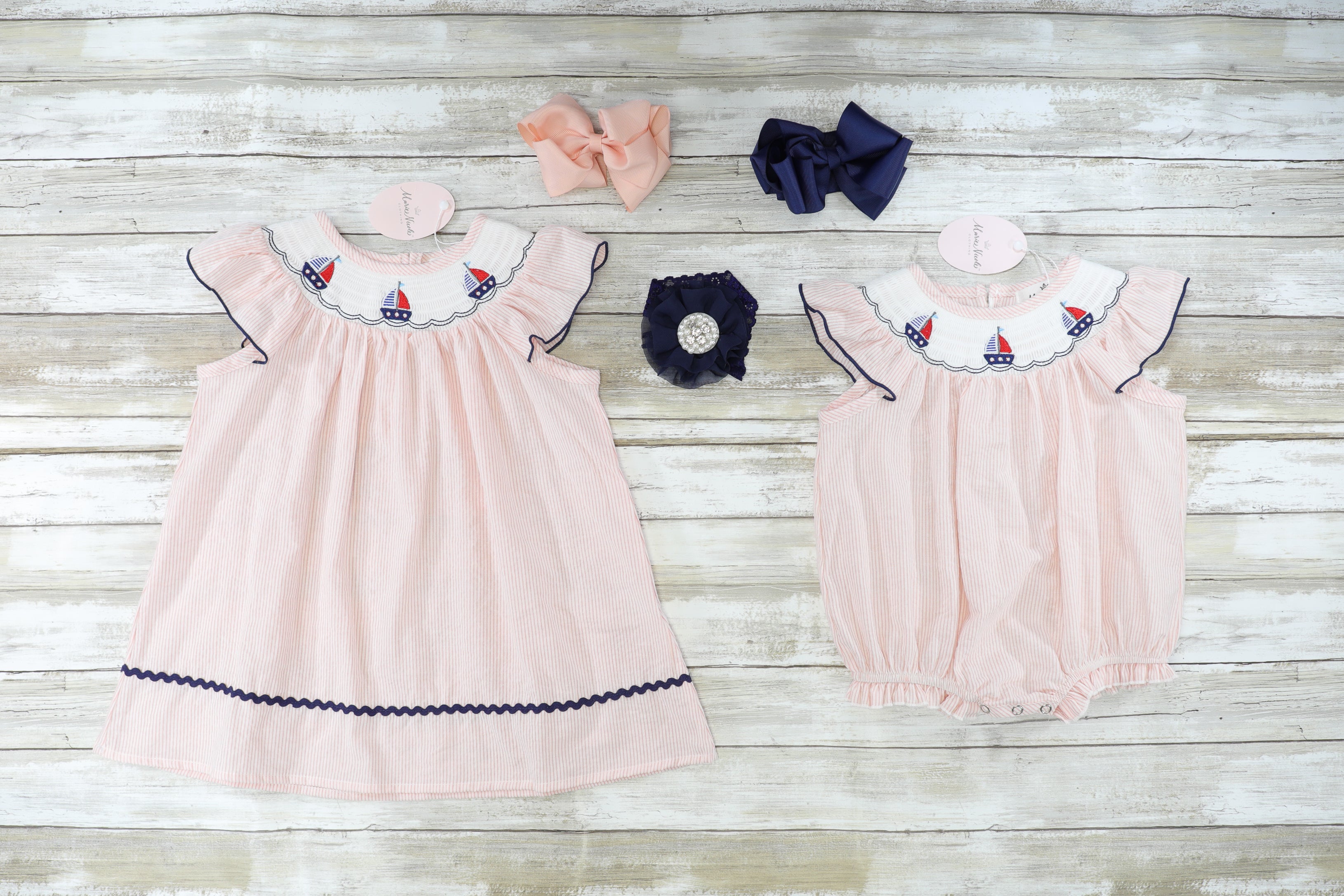 Time to saaaail away in this sibling set! This coral & white pinstriped bubble romper features a smocked neckline with sailboat appliqués, cinching on the legs, & snap buttons making for easy diaper changes.