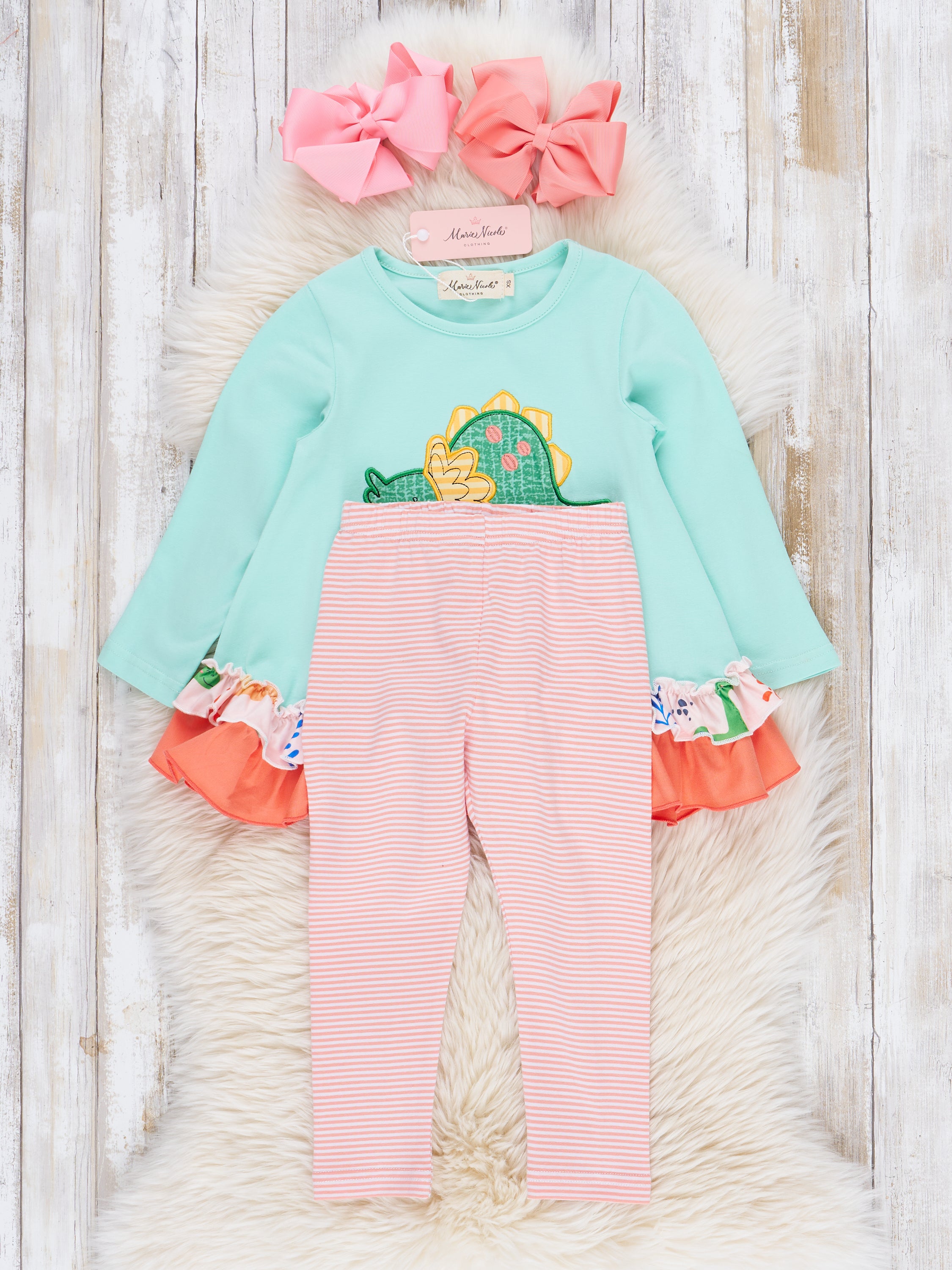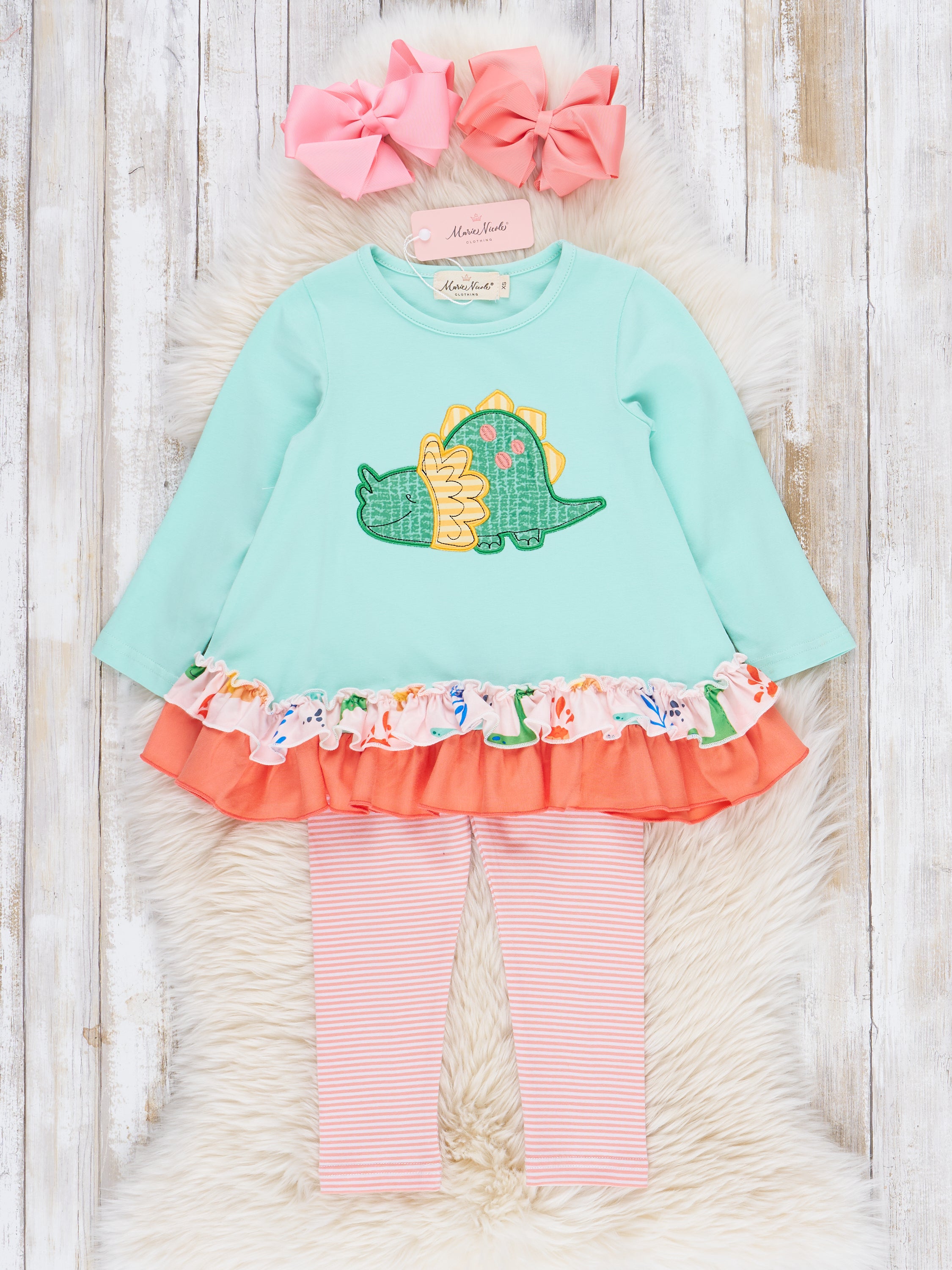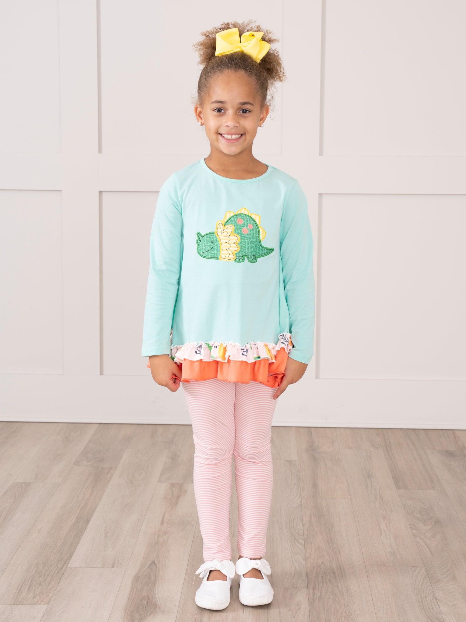 Roar into style with this playful Coral & Teal Embroidered Triceratops Ruffle Outfit for girls! Featuring a long-sleeve teal top with a cute embroidered triceratops and a fun ruffle hem, paired with comfortable coral leggings. This quirky set is a perfect sibling match!