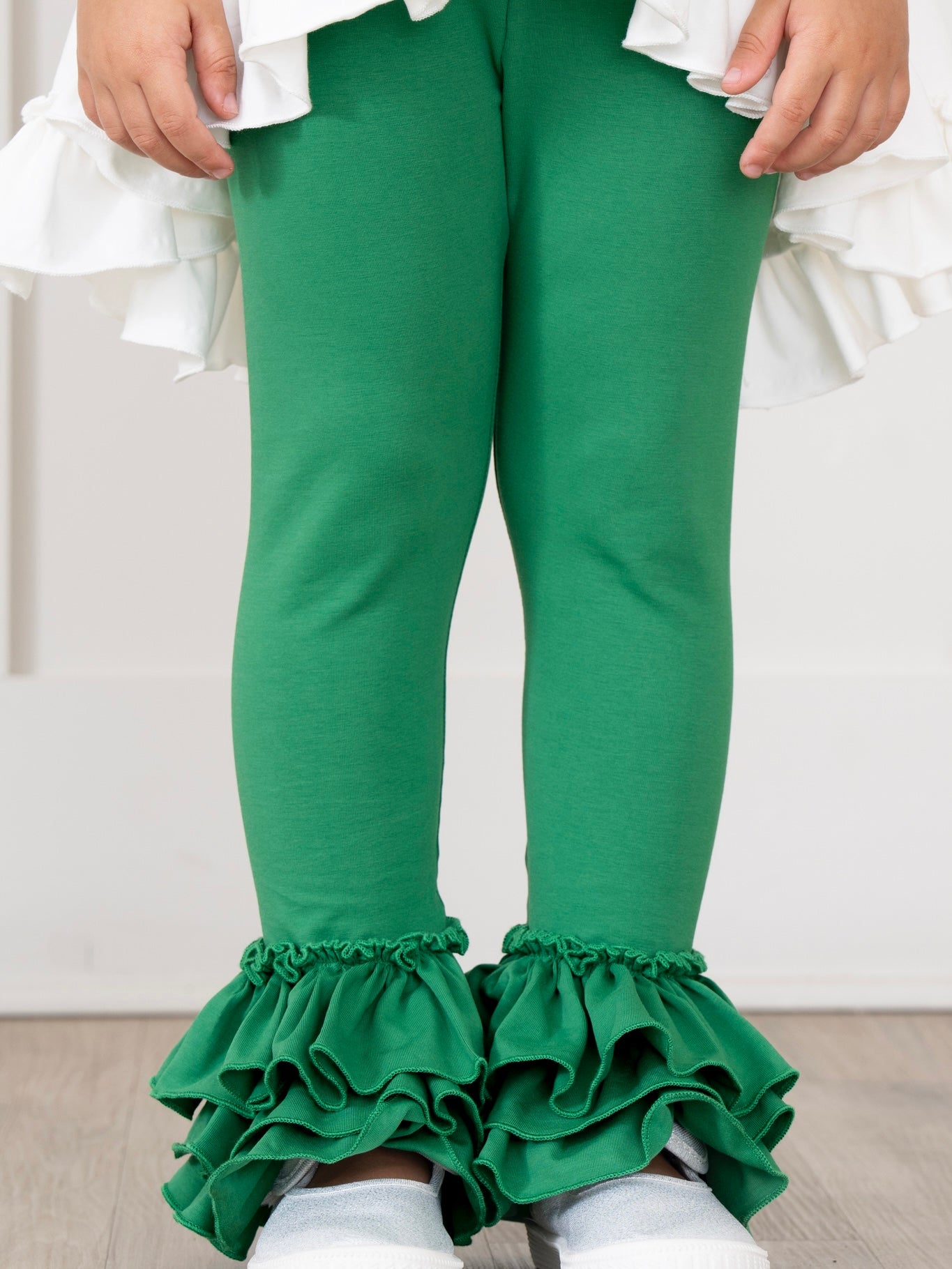 The Cotton Bell Ruffle Leggings in Christmas Green are the perfect closet staple for the winter holidays. This pair of leggings from Marie Nicole Clothing features tiered ruffle bottoms. Crafted with soft, comfortable cotton, your girl can look and feel great all day, and you can match them with any of our MNC-exclusive swing tops and tunics. Shop all MNCxBASICS here!
