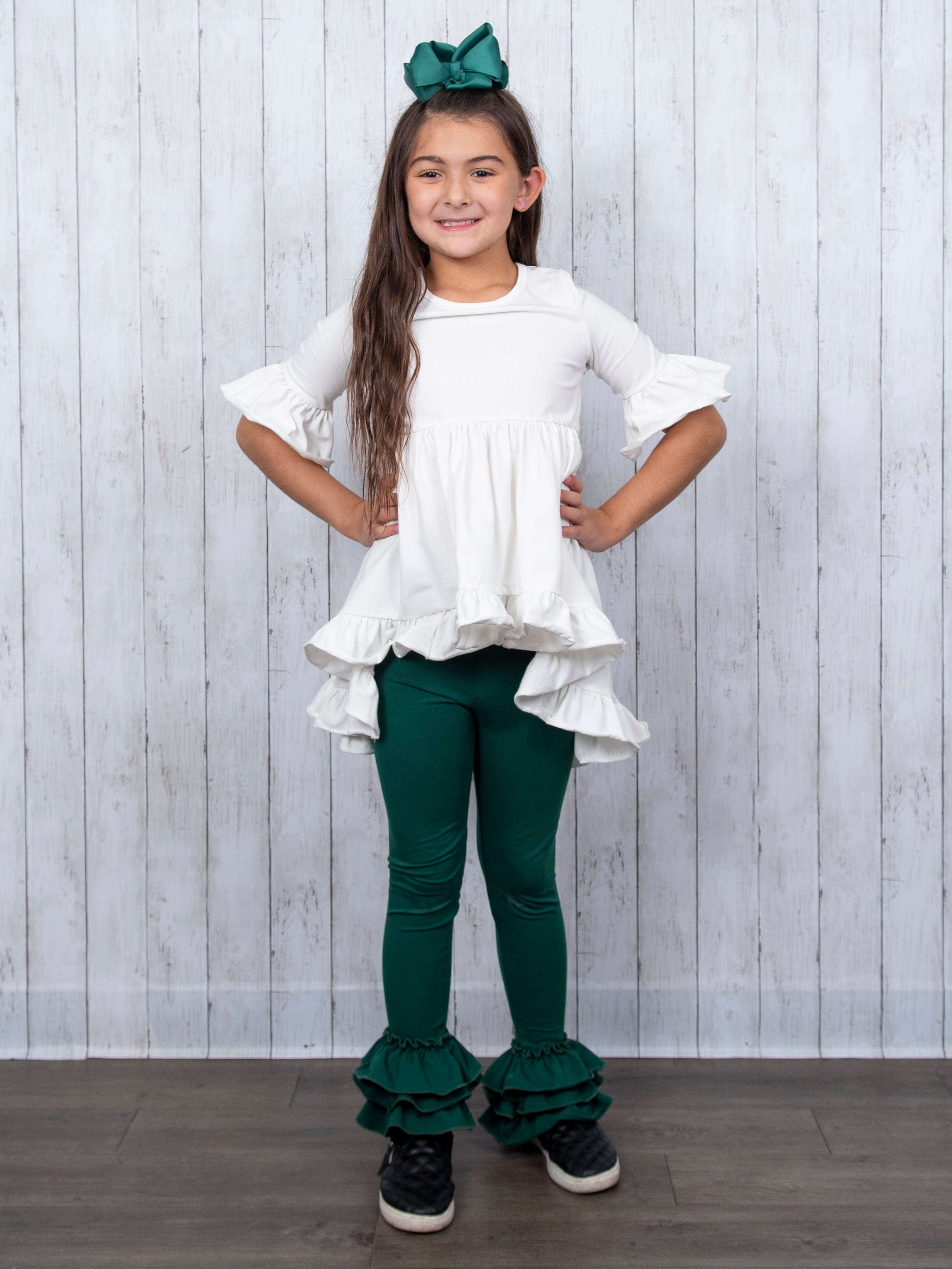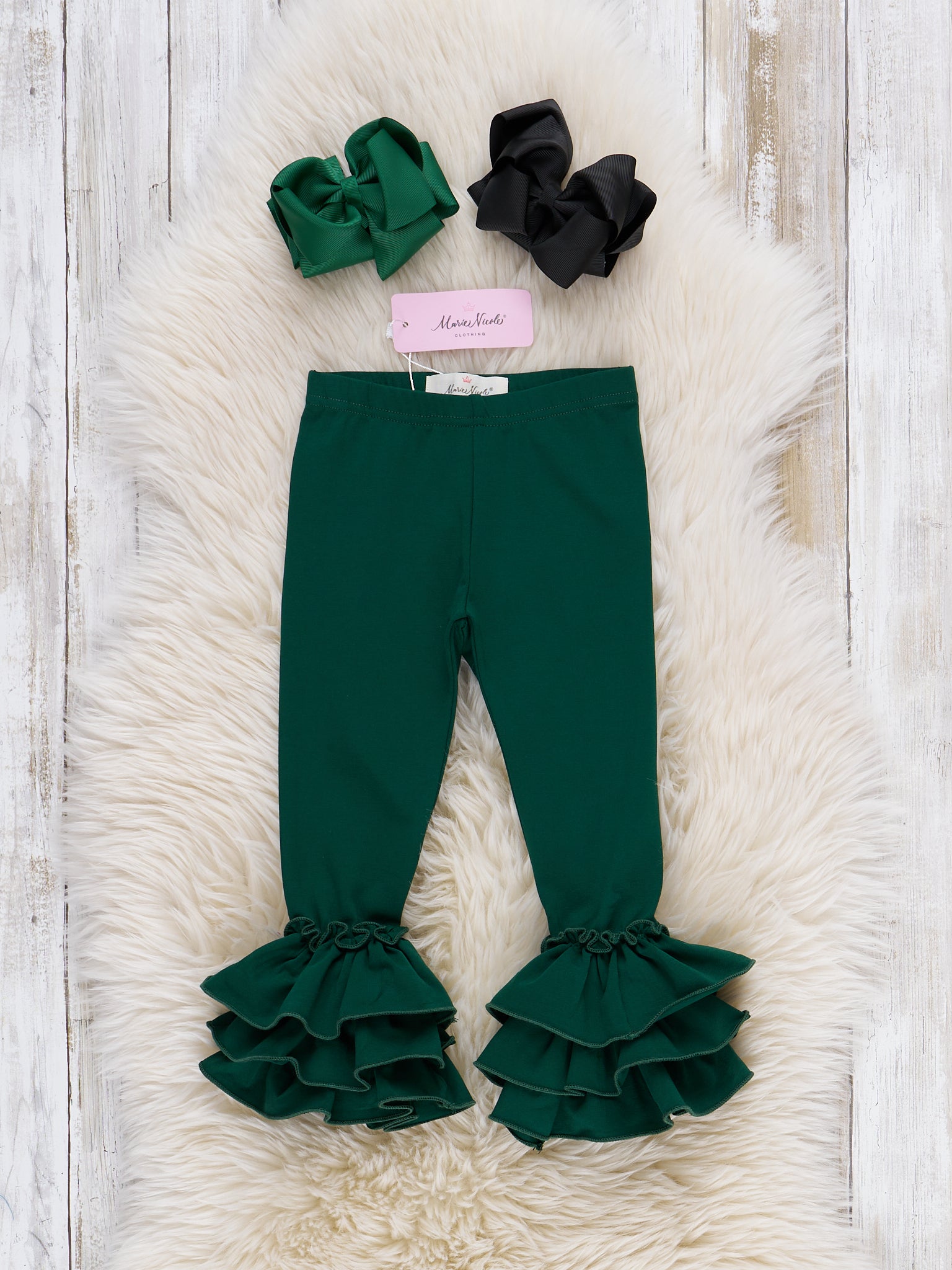 The Cotton Bell Ruffle Leggings in Hunter Green are the perfect closet staple. This pair of leggings from Marie Nicole Clothing features tiered ruffle bottoms. Crafted with soft, comfortable cotton, your girl can look and feel great all day, and you can match them with any of our MNC-exclusive swing tops and tunics. Shop all MNCxBASICS here!