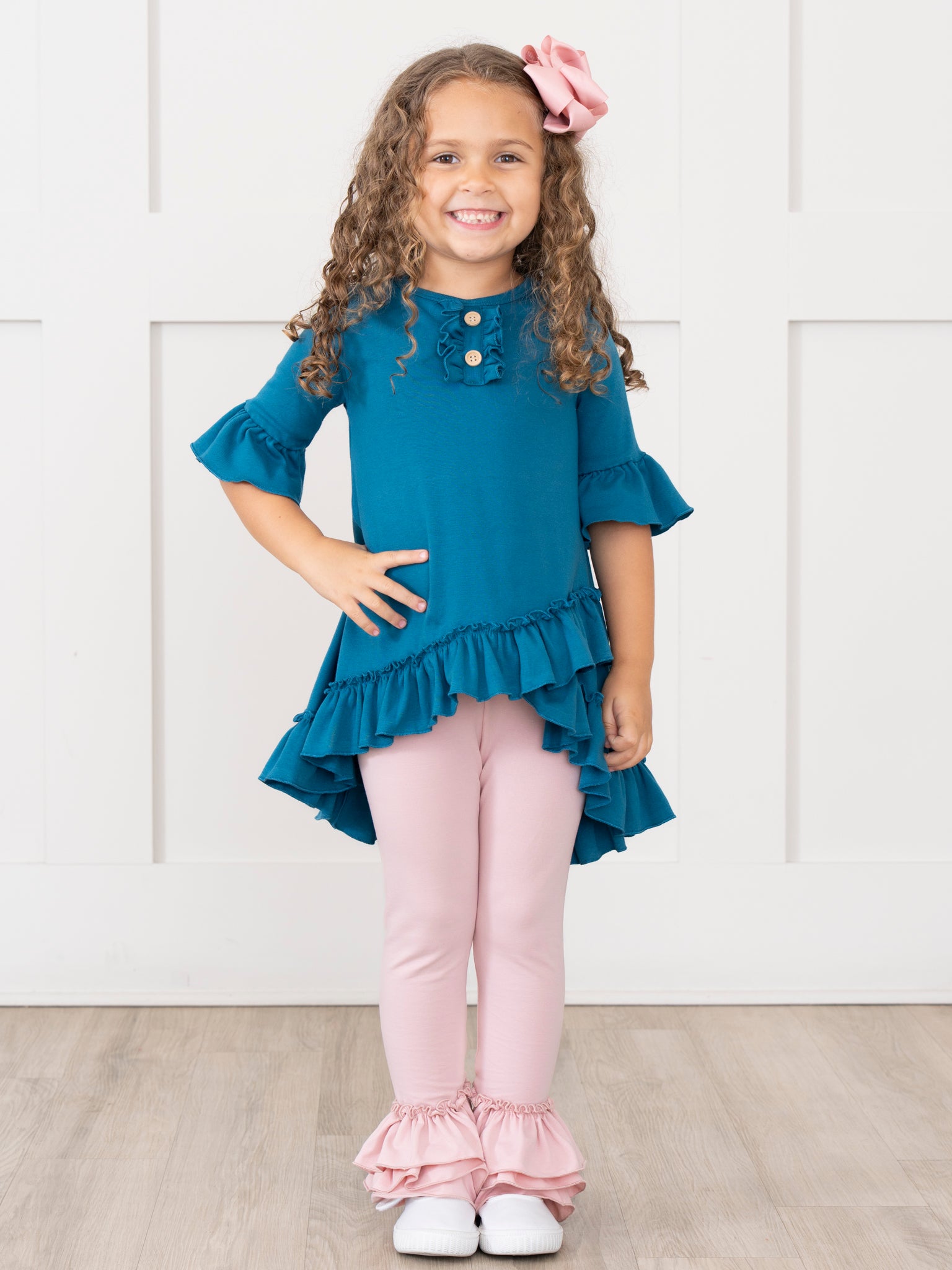 The Cotton Bell Ruffle Leggings in Mauve Pink are the perfect closet staple. This pair of leggings from Marie Nicole Clothing features tiered ruffle bottoms. Crafted with soft, comfortable cotton, your girl can look and feel great all day, and you can match them with any of our MNC-exclusive swing tops and tunics. Shop all MNCxBASICS here!
