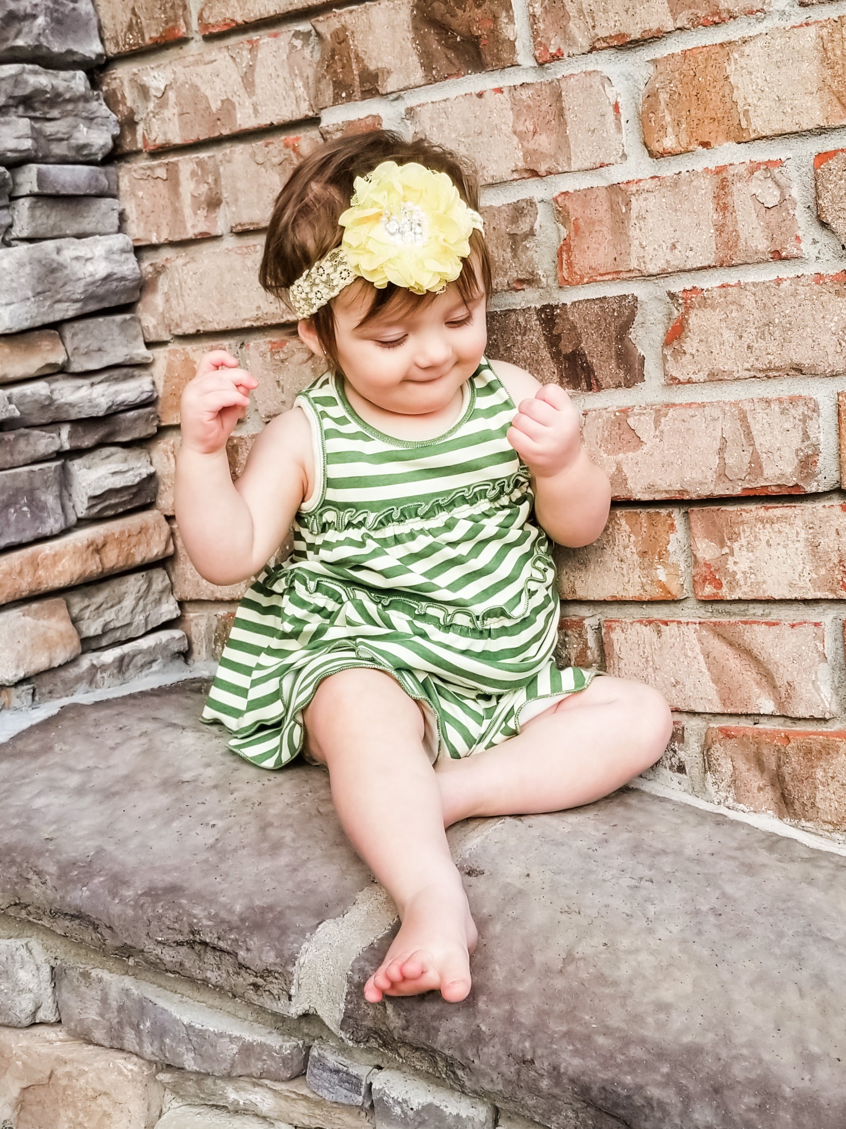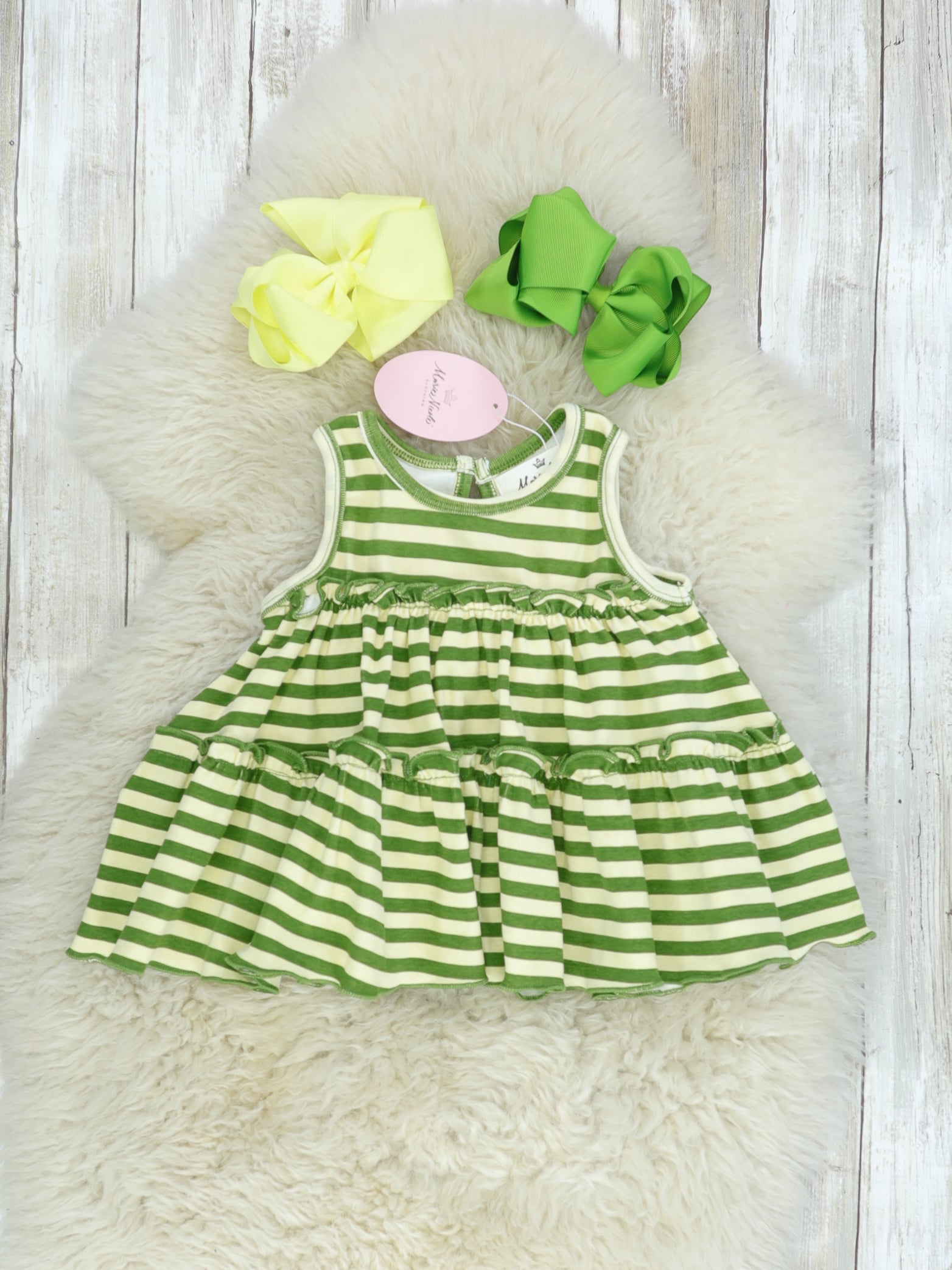 MNC's cotton swing ruffle tank in olive and cream striped! This tank features the prettiest ruffles and a functional button on the nape of the neck for easy on and off.