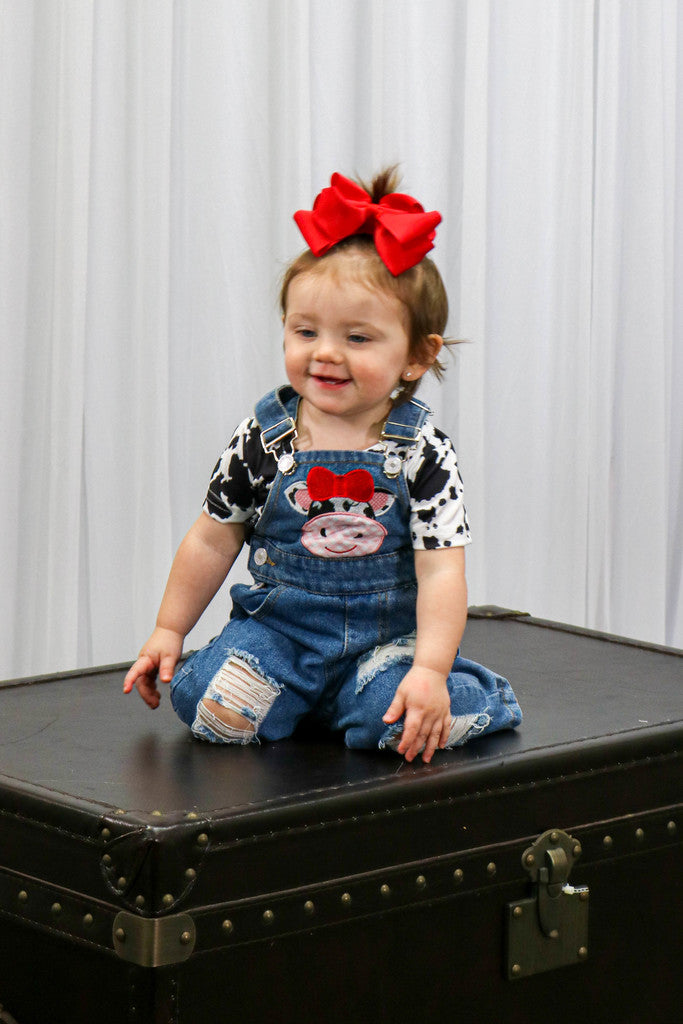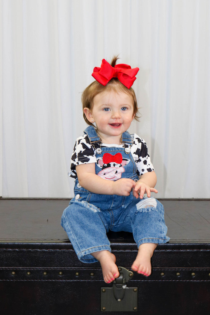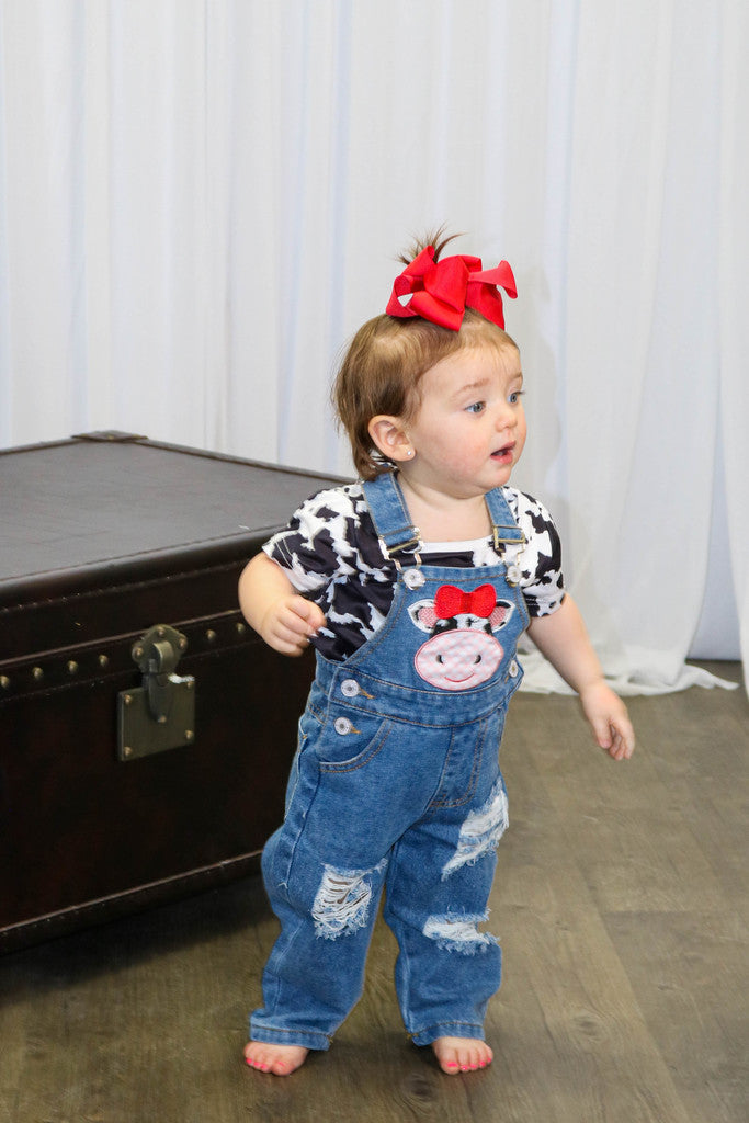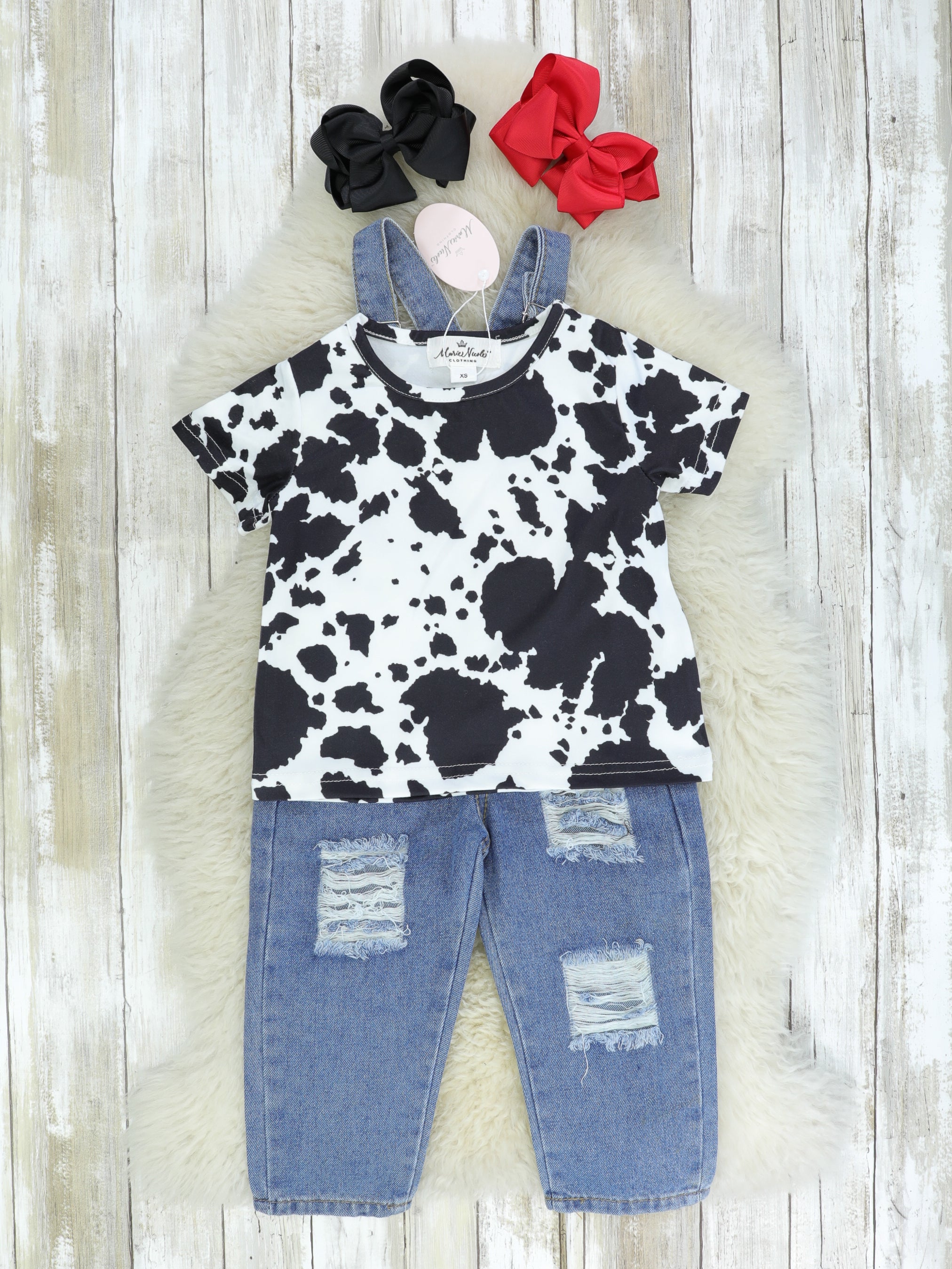 MOOOOOve out of the way! This adorable denim overall set is embroidered with a sweet little cow and comes with a cow print t-shirt.