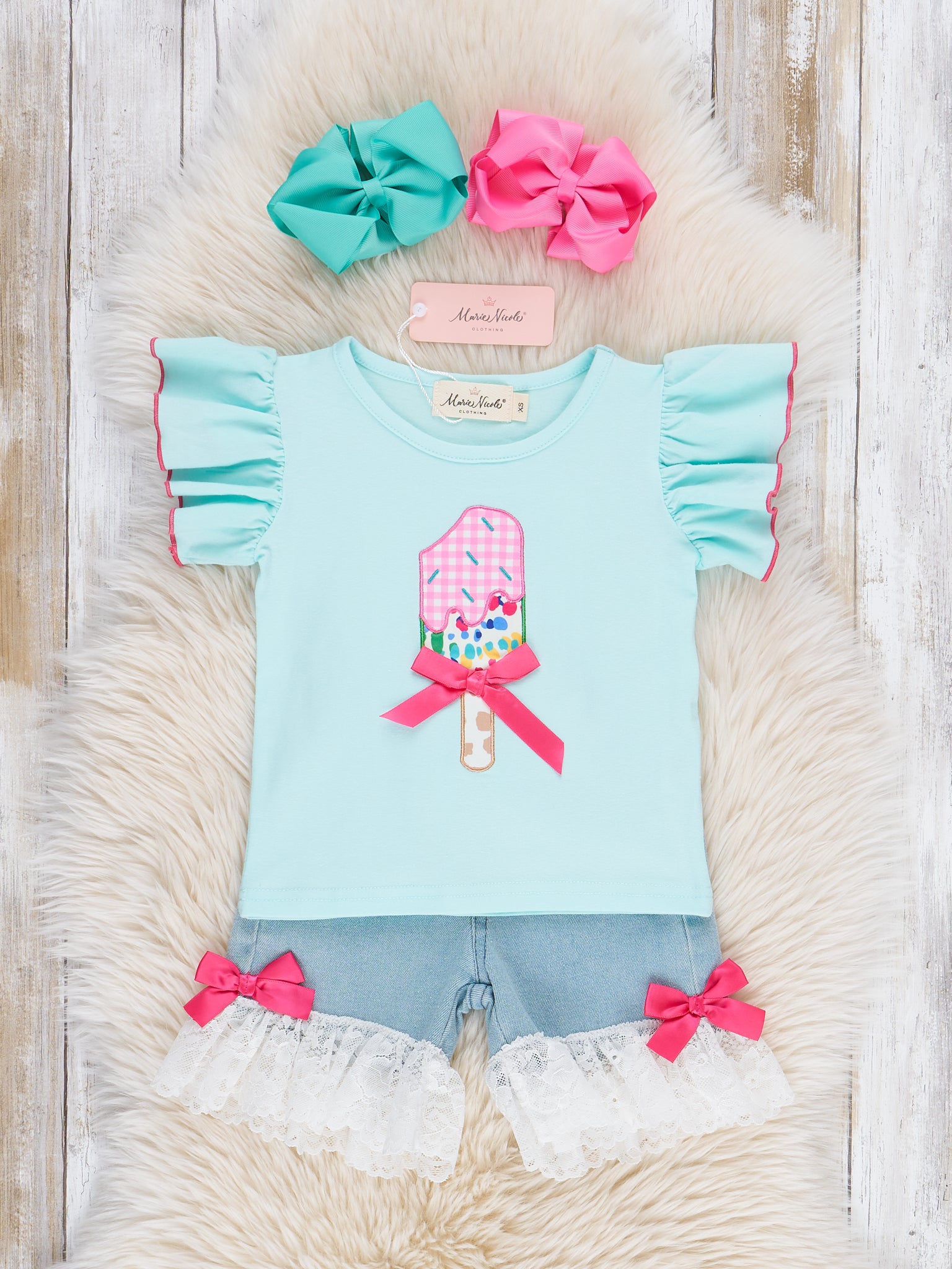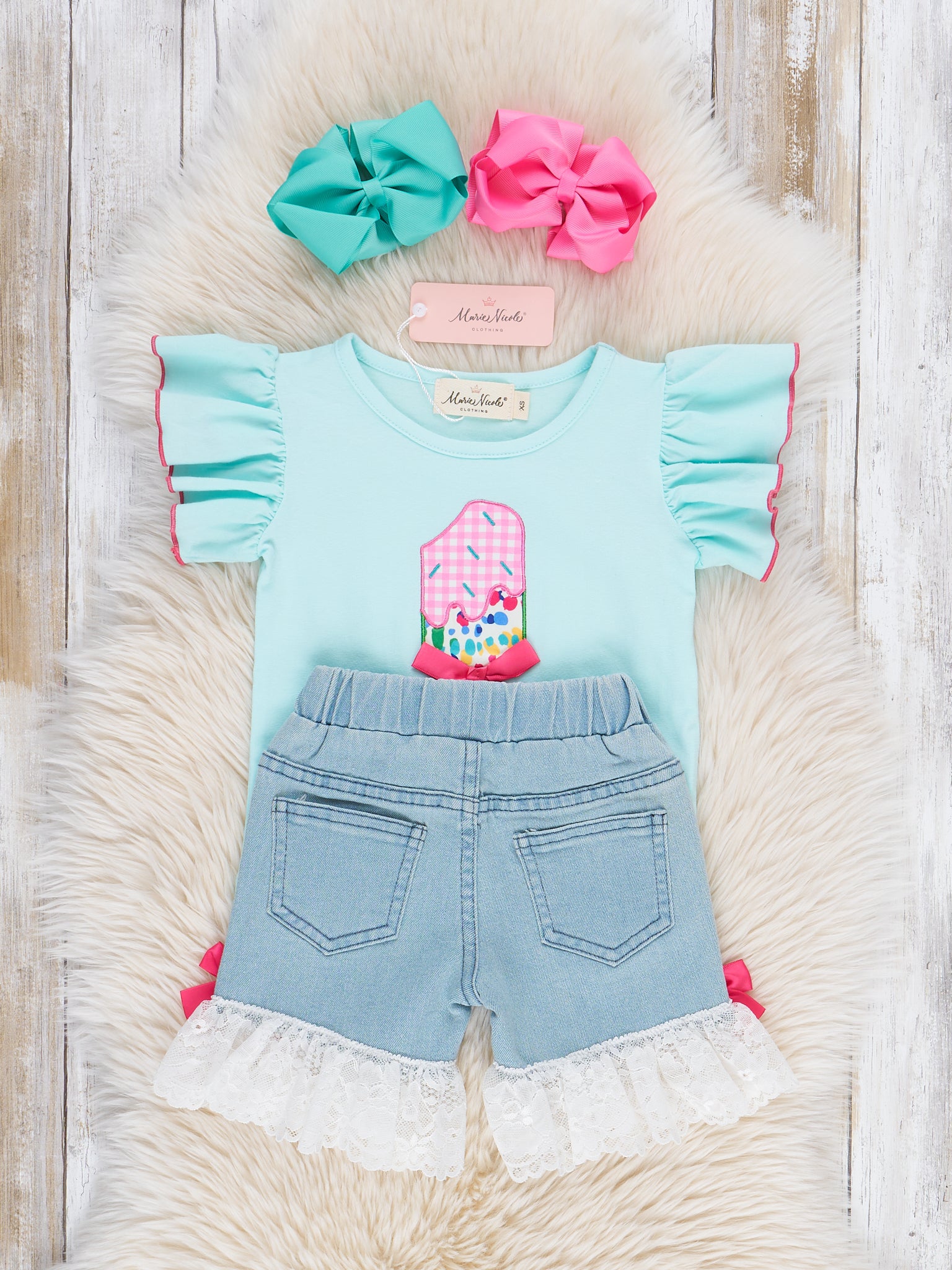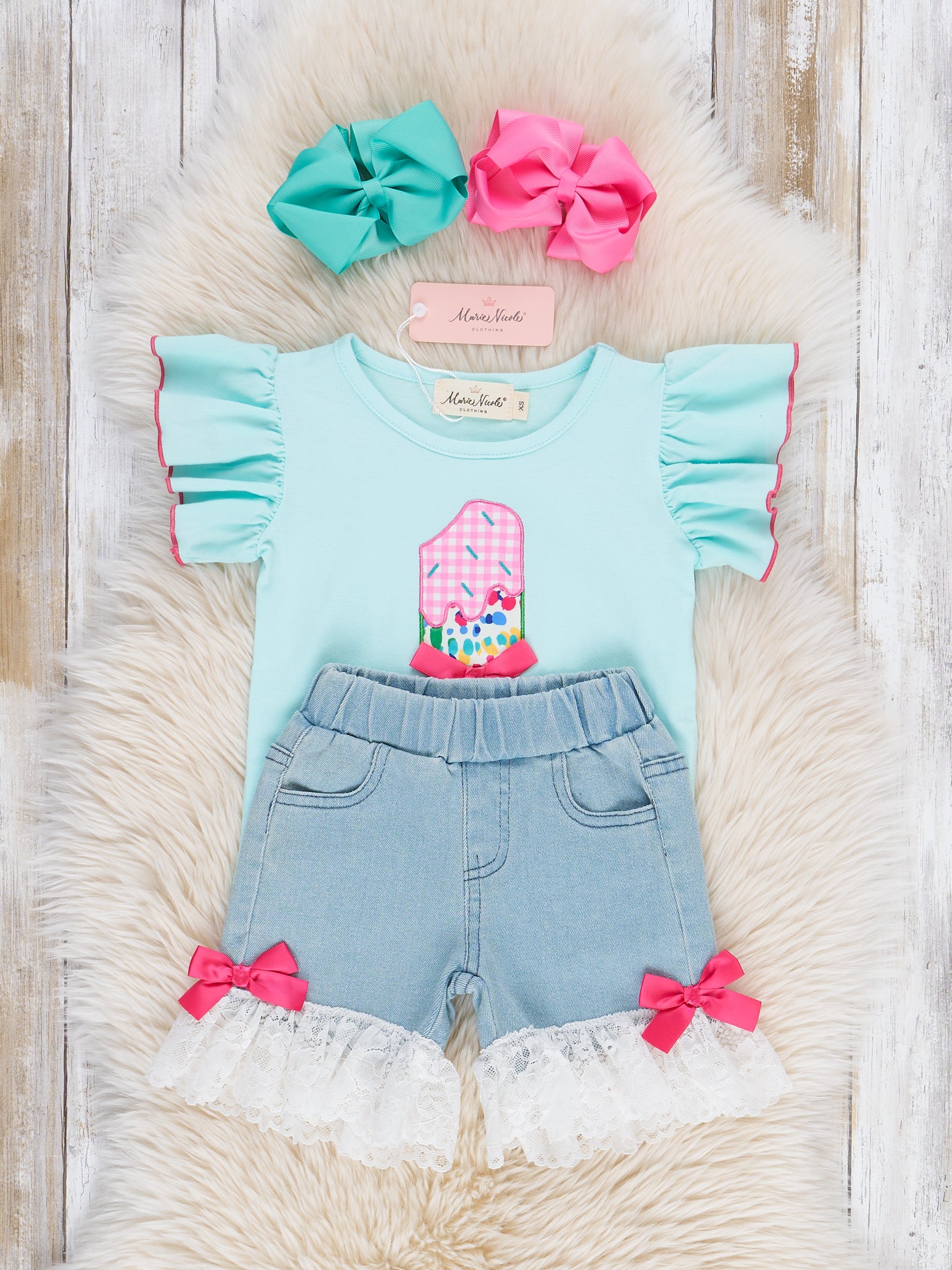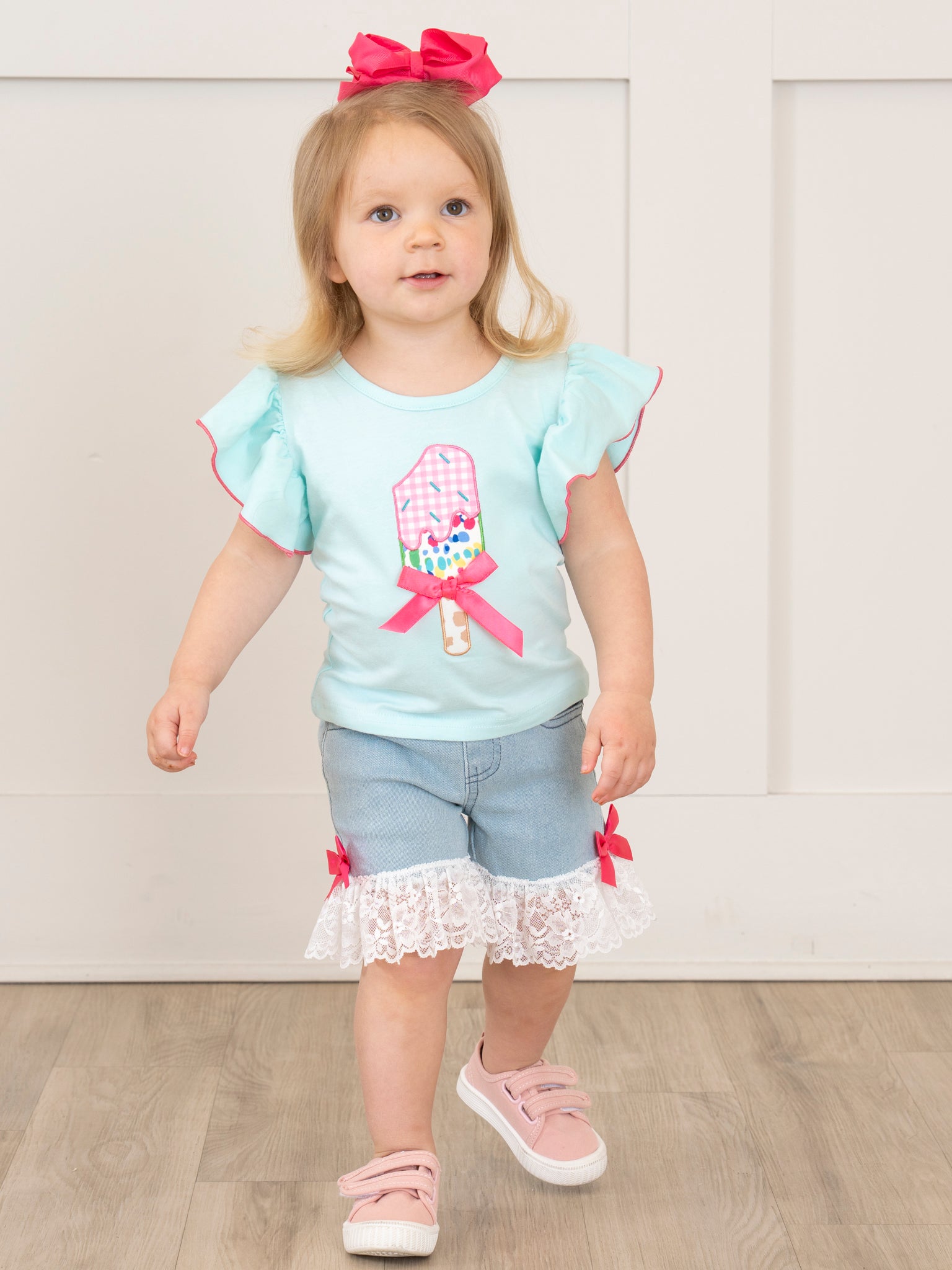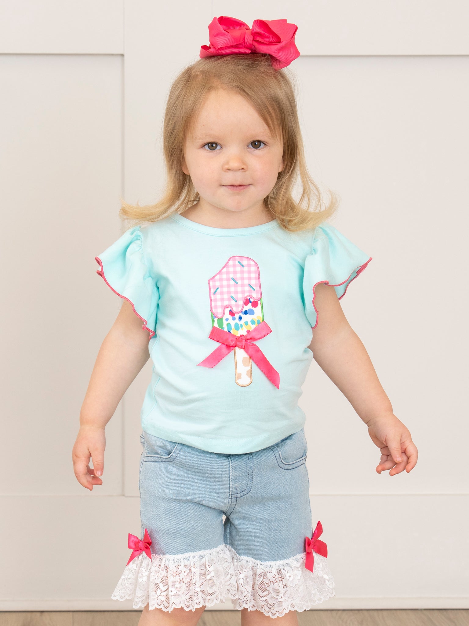 Yeehaw! This Cowgirl Popsicle Ruffle Denim Outfit from Marie Nicole Clothing is the perfect summer outfit for your little cowgirl. The light blue top features a playful embroidered popsicle and the denim shorts have a cute lace hem and bright pink bow accents. Get your daughter a matching sister set for double the cuteness!