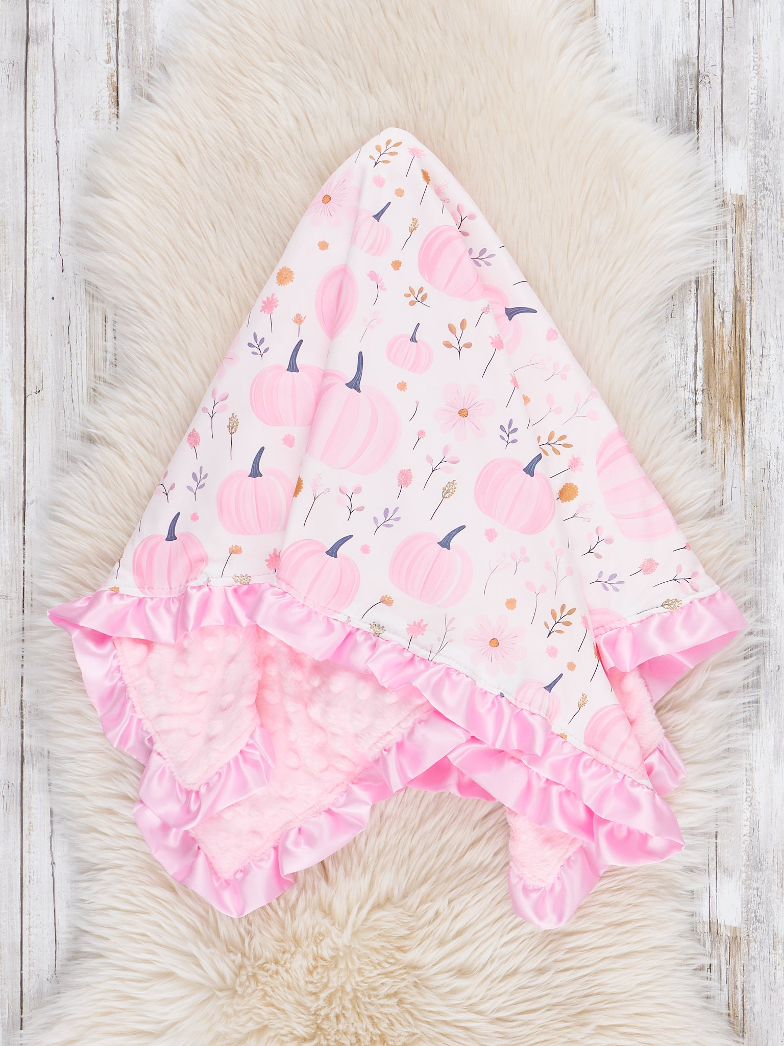 The Cozy in the Patch Minky Blanket is a comfortable and cute sleepwear accessory for your baby. With ruffled embellishments and pumpkin patterns, this blanket from Marie Nicole Clothing charms with pink, autumn abundance. It is designed with soft, comfortable fabric, so your child can be ready for fall days, seasonal photos, and all their pleasant sleep-time dreams.