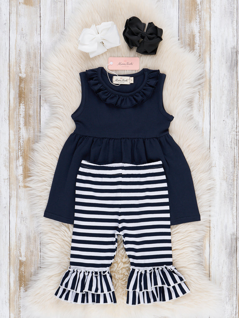 Get back to school in style with our Crayons & Stripes Ruffle Outfit! This adorable girls' outfit features playful striped ruffle capris paired with a fun ruffle top with crayon design. Perfect for your little one who loves to express their creativity.