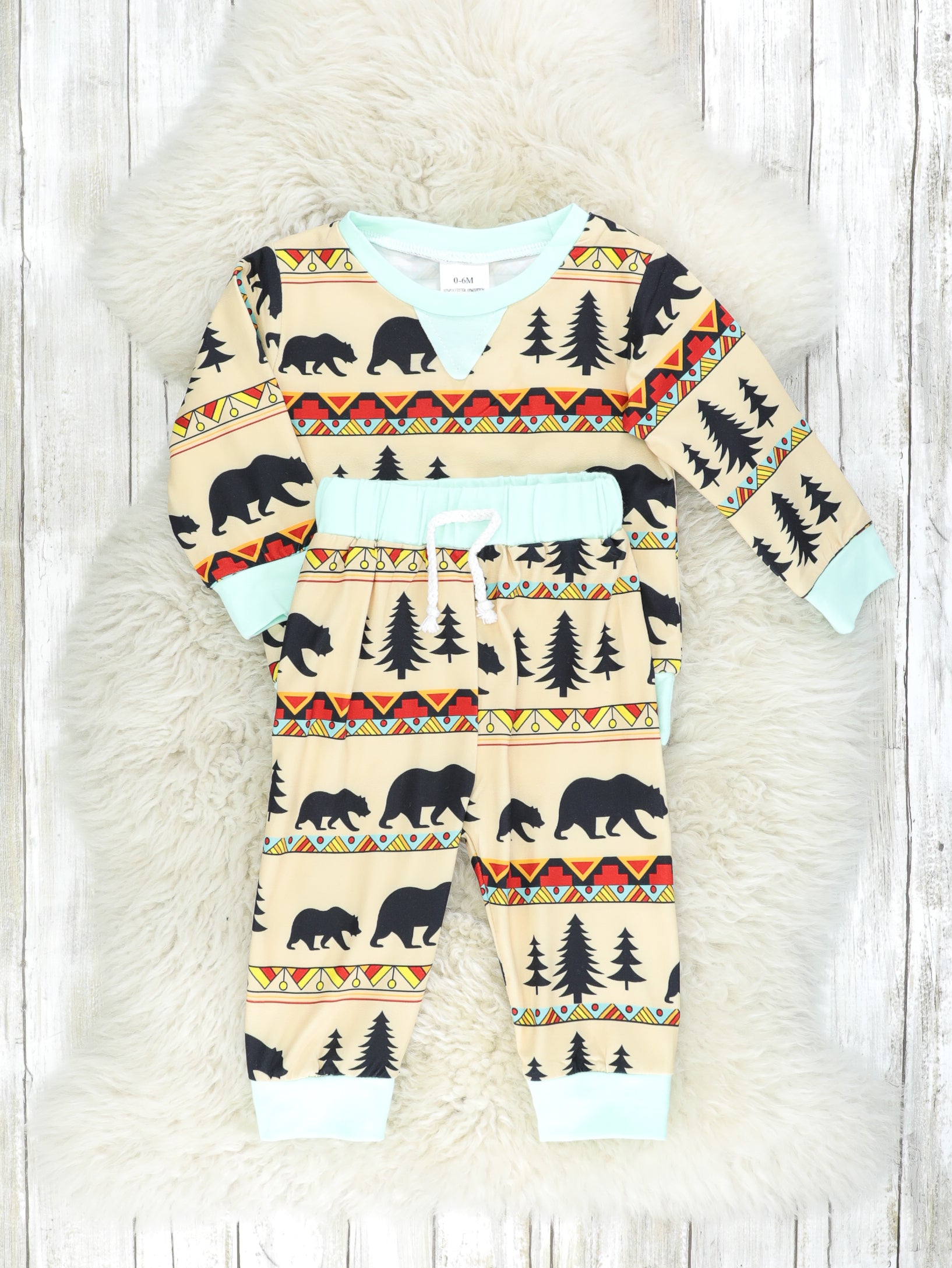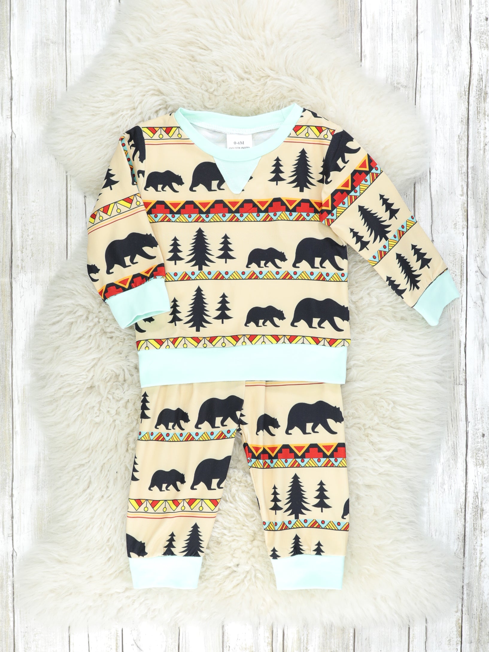 These darling outfits are so beary cute! This cream outfit features a bear print with mint trim & is so soft and cozy!