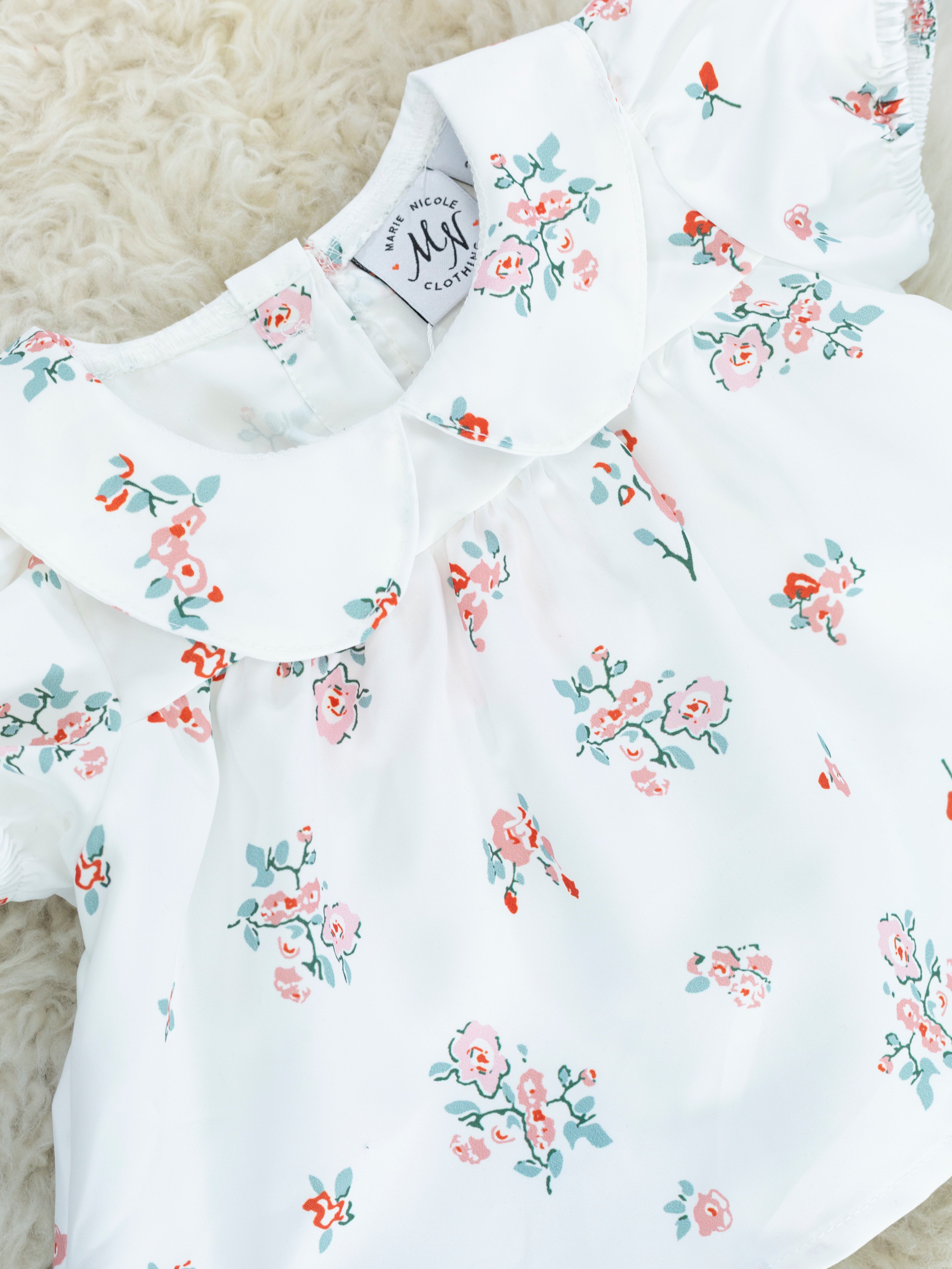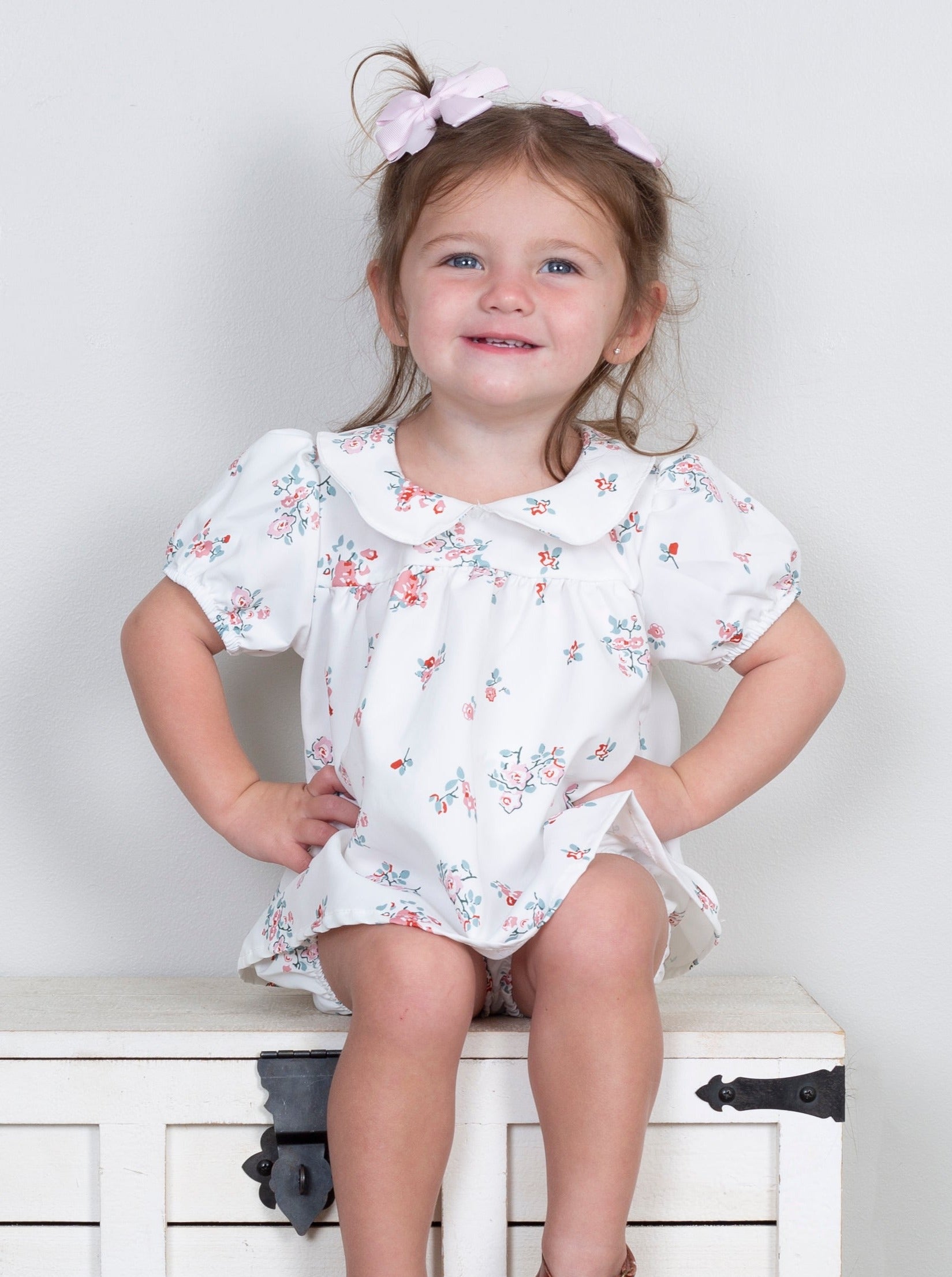 The sweetest bloomer set for your little flower! This outfit features a peplum top with smocking, a peter pan collar, stunning florals, & matching bloomers.