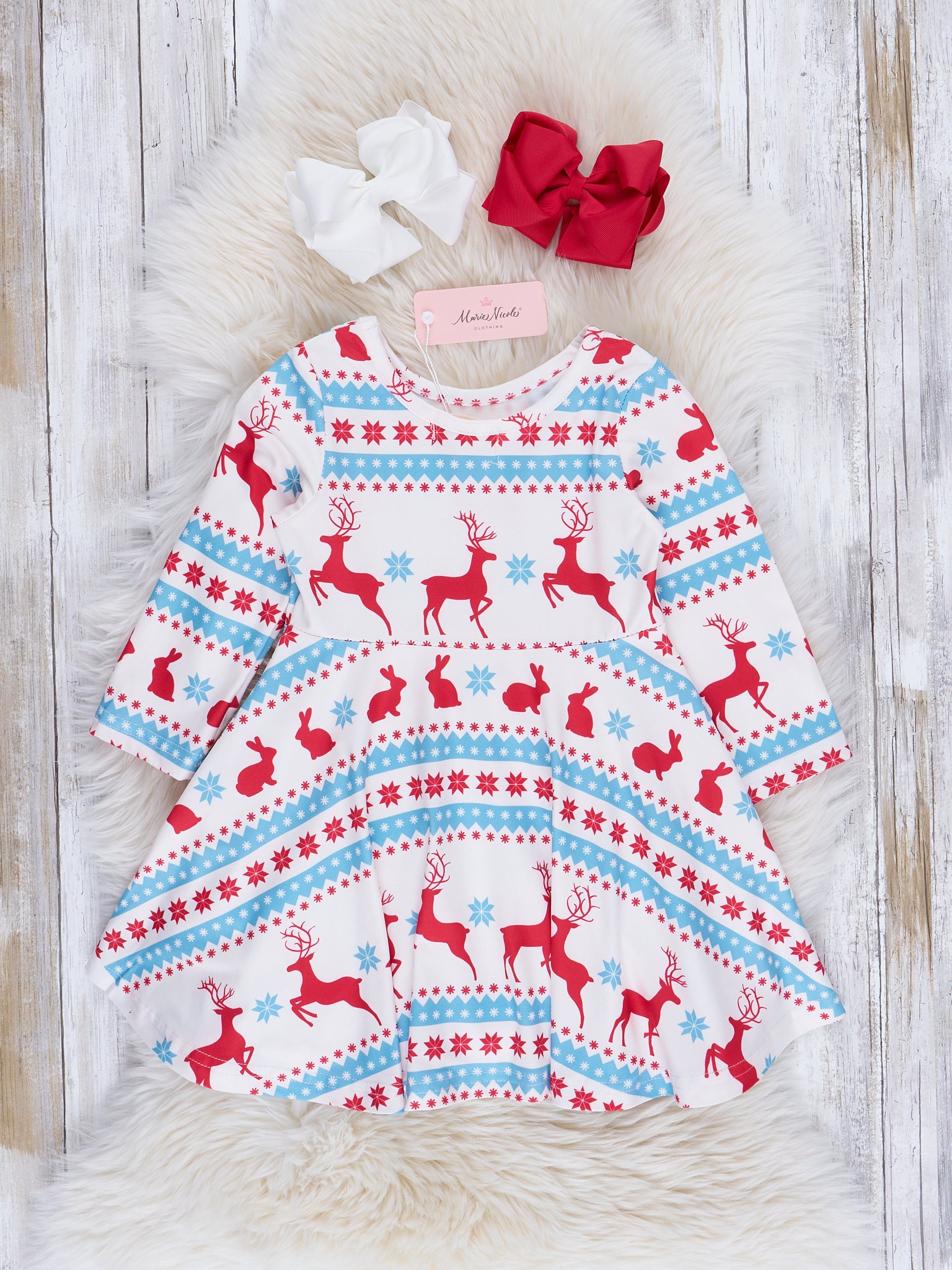 Everyone's favorite swing dress is back with the most adorable holiday print! Outfit your mini every day of the season with this comfy long-sleeved dress that cinches at the waist and has subtle pleats.