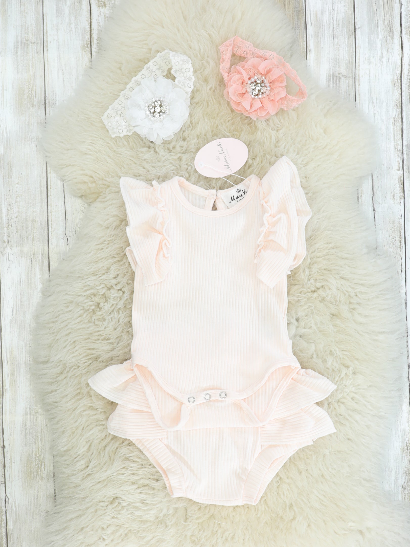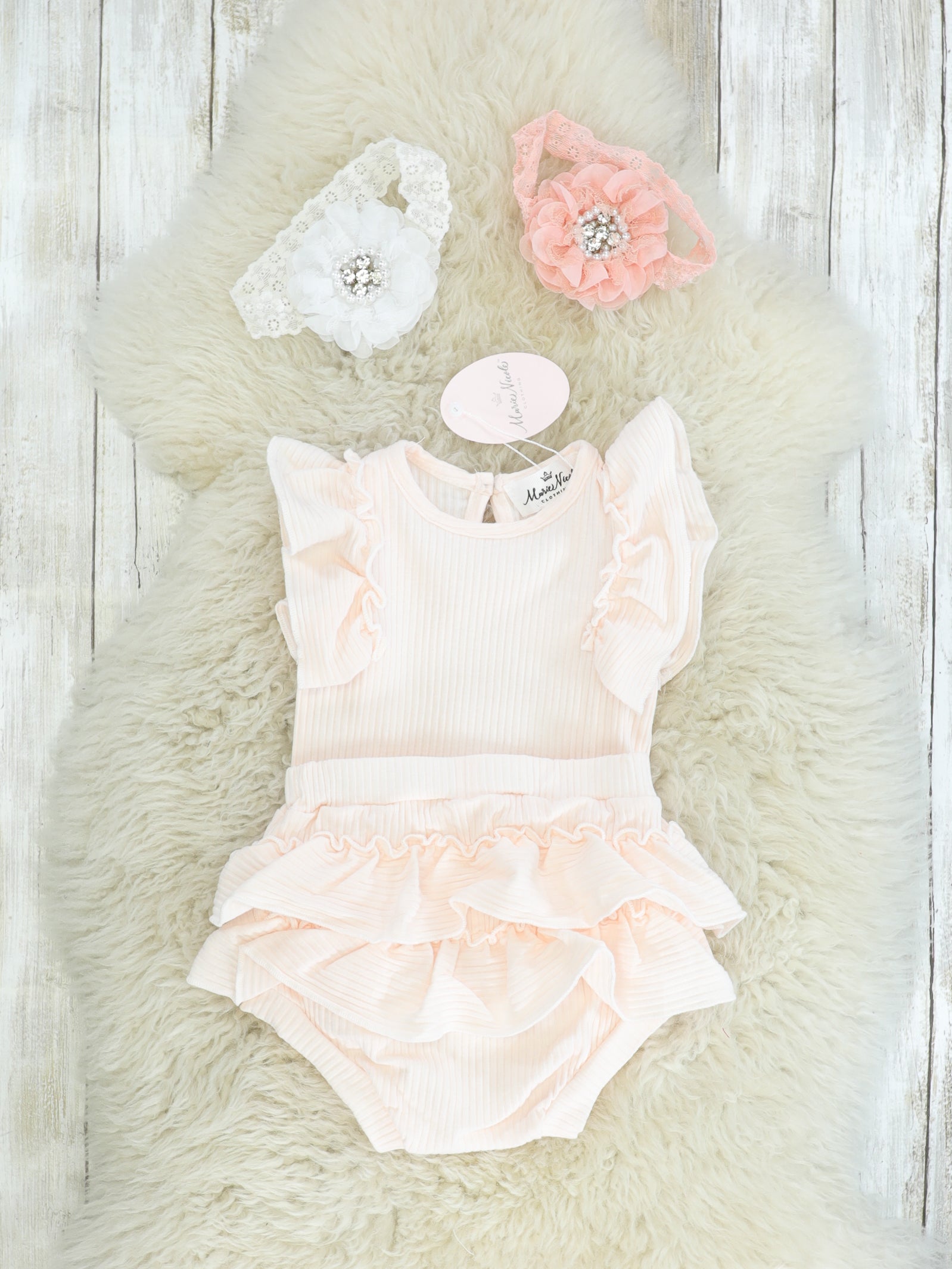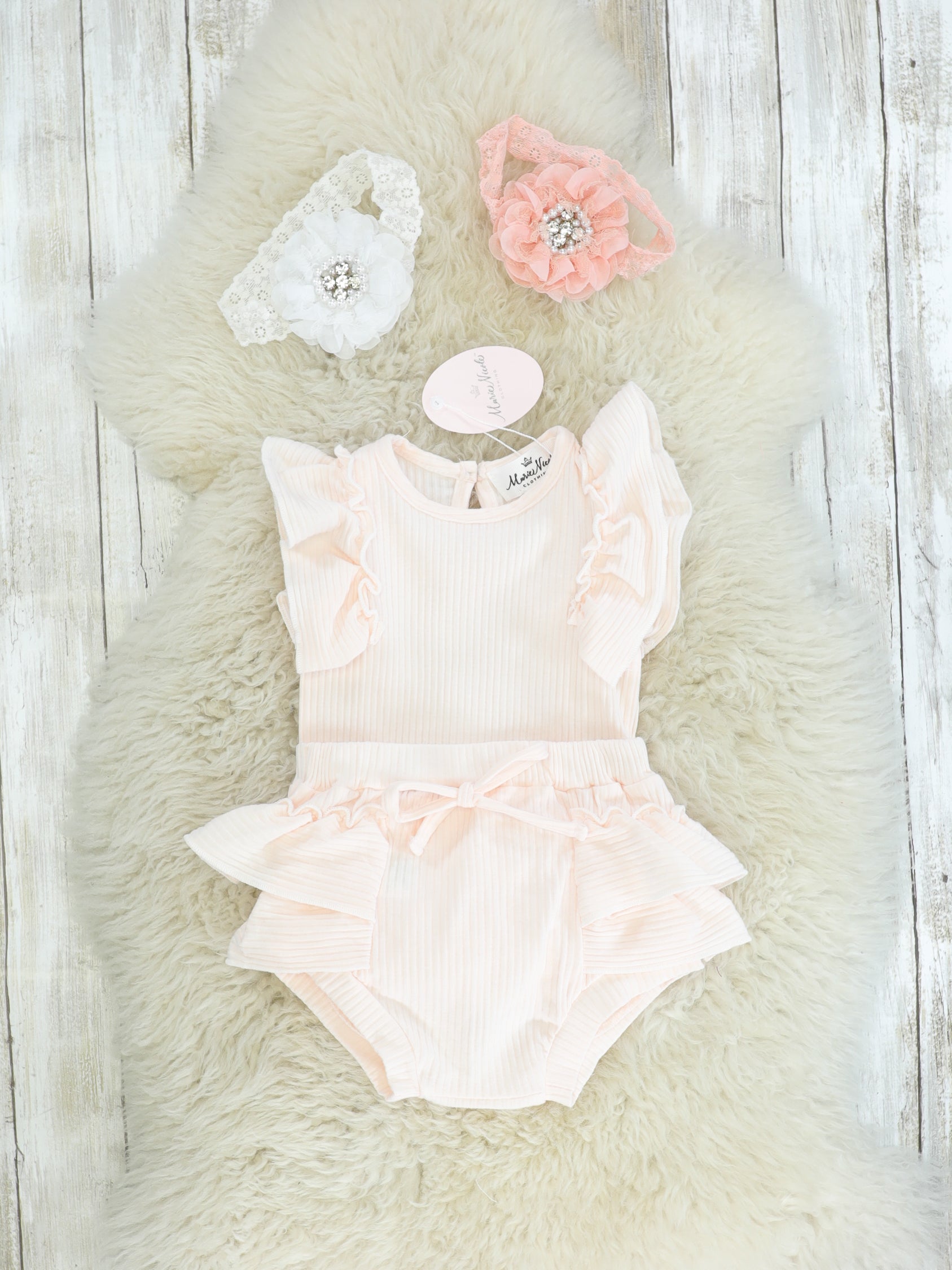 This classic ruffle top and bloomer set is perfect for days on the go. The top features a ruffle sleeve with a back button for easy on and off and matching front tie ruffle bloomers.