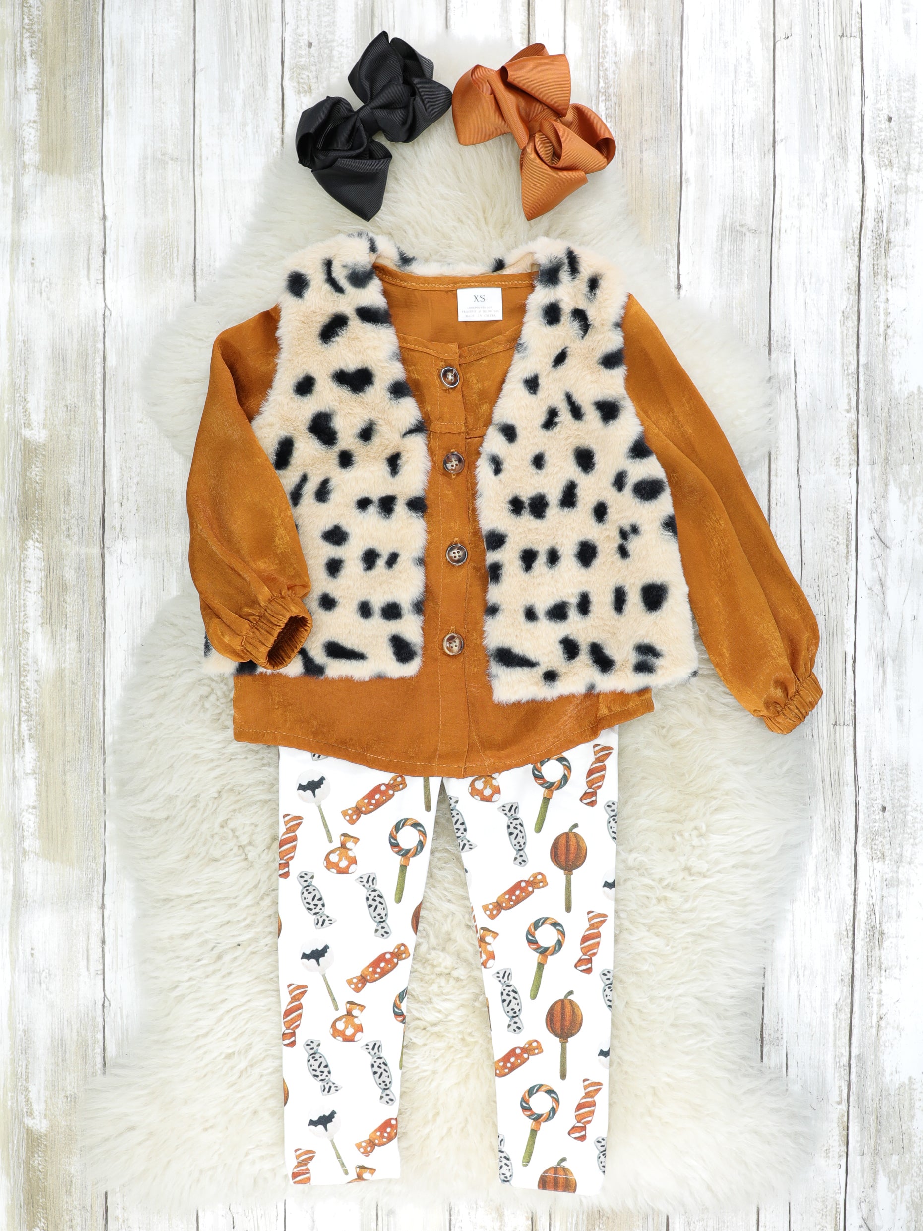 Orange your girls glad this set is eye candy? This outfit features a crushed velvet top with adorable candy leggings & a polka dot vest with a clasp.