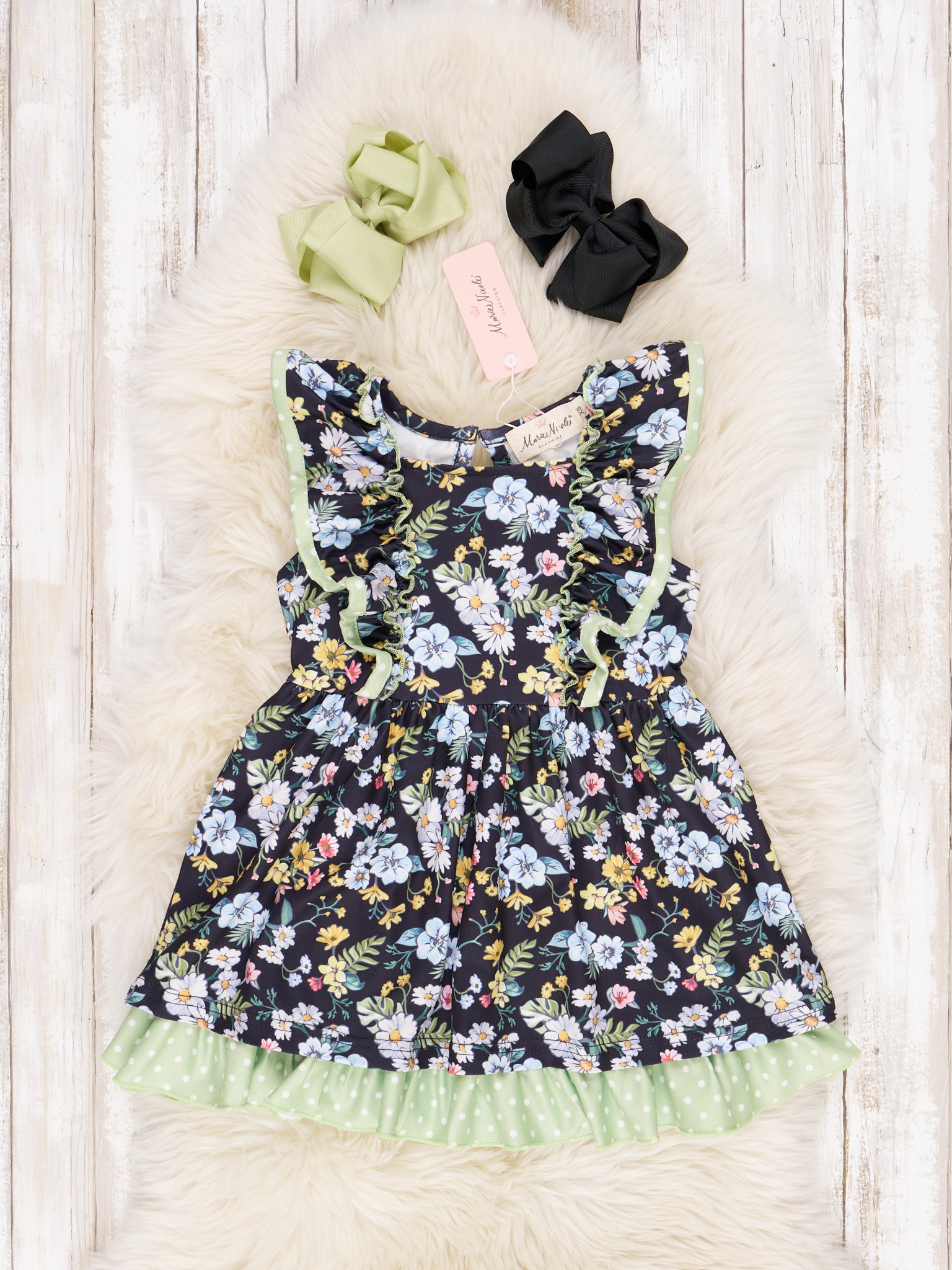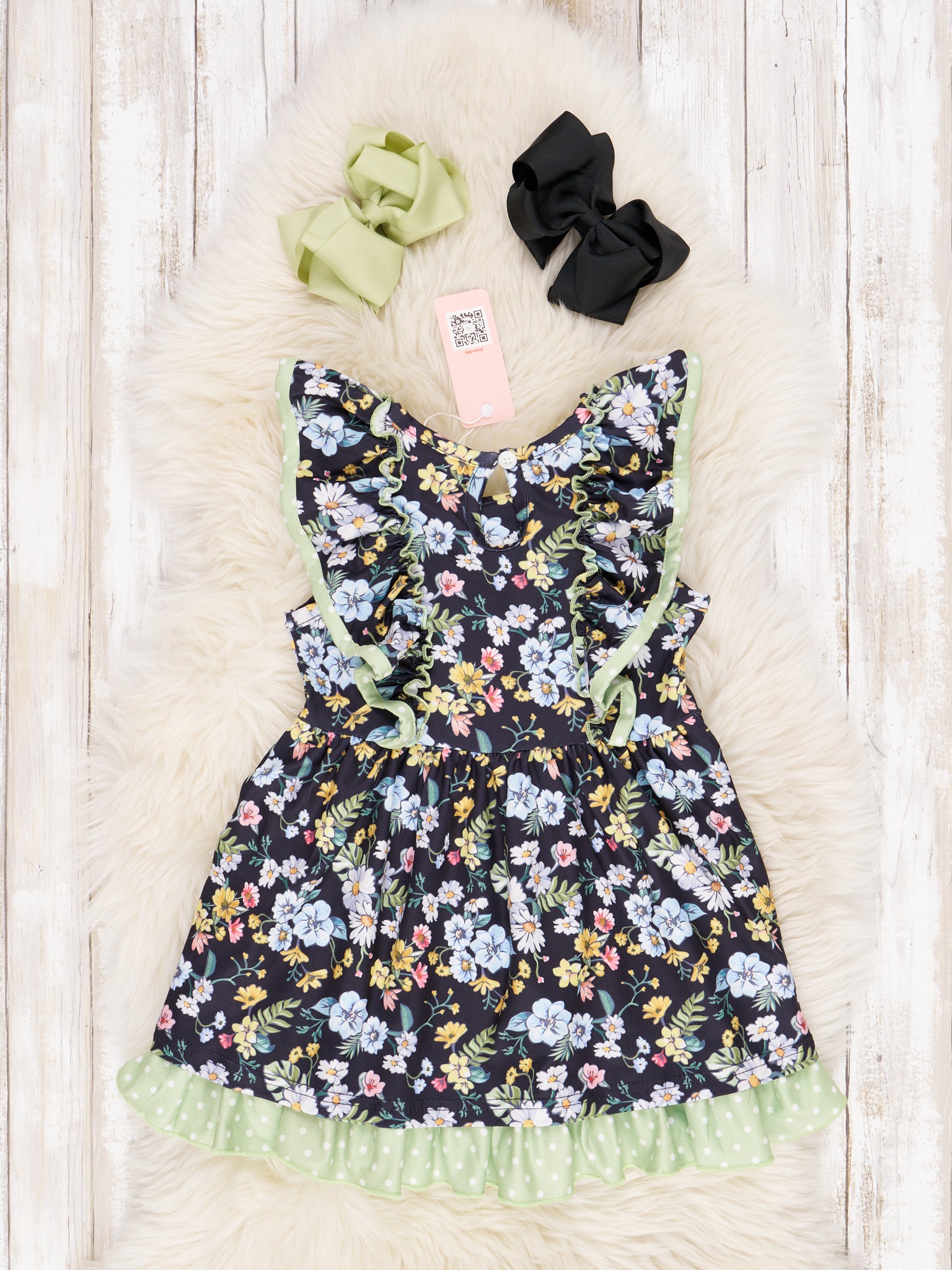 A perfect dress for a summer day! This one-of-a-kind daisy & cornflower design features flutter sleeves and a keyhole at the nape of the neck. Plus, the show-stopping green ruffles with polka dots will make her style stand out in the crowd! Don't be daisy-chained to classics - make a statement in this unique ruffle dress!