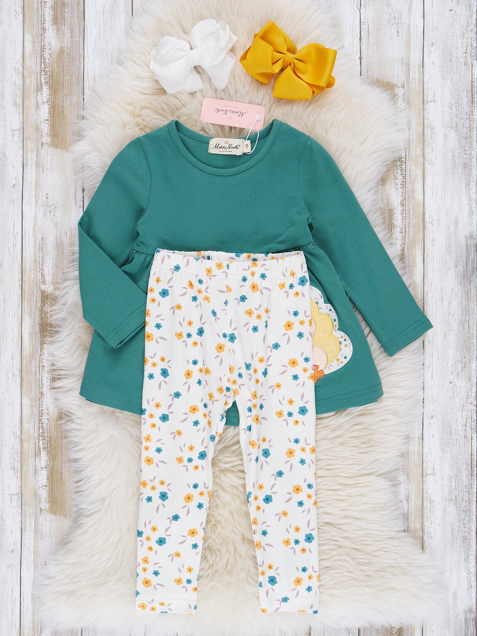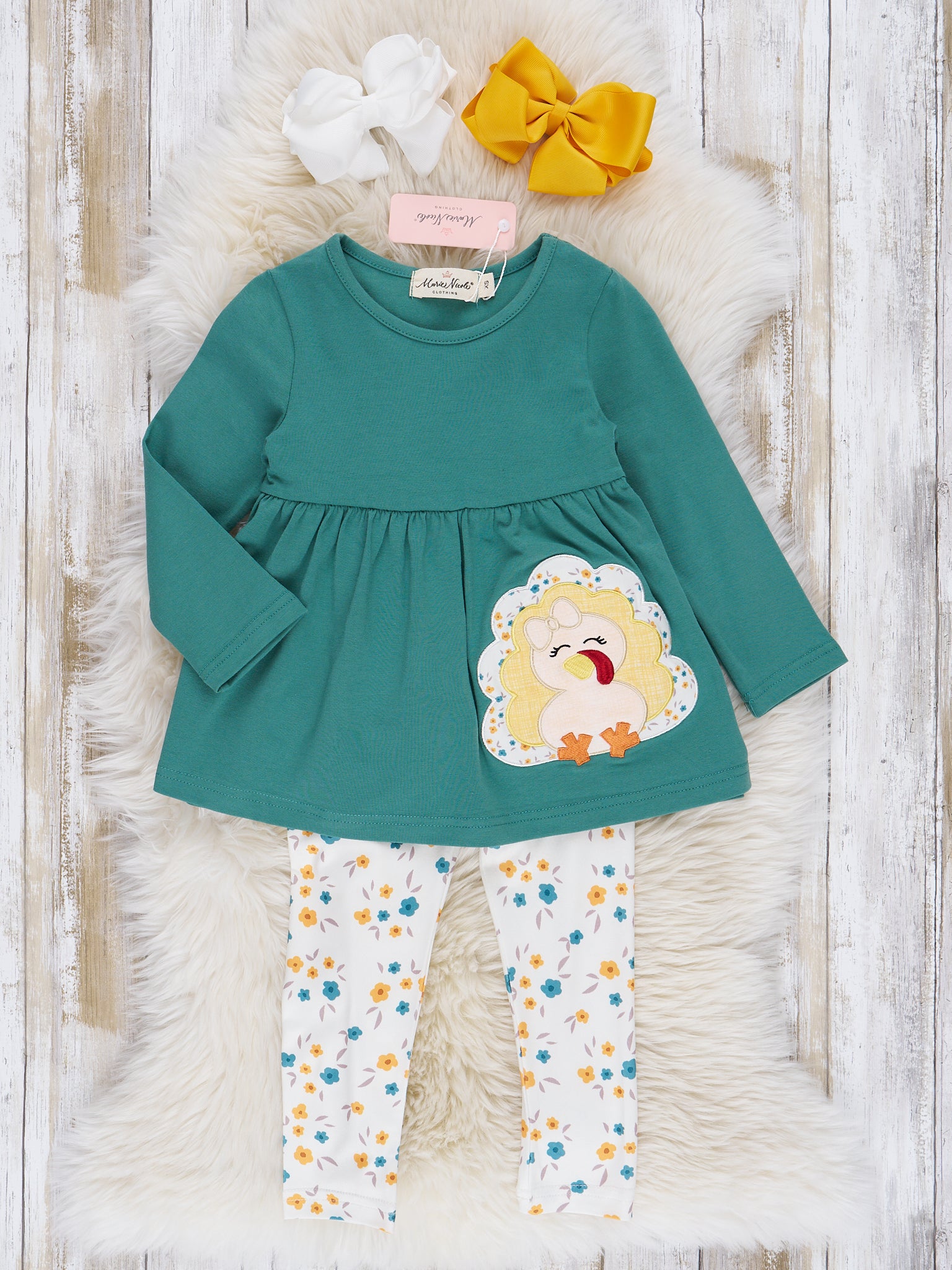 Let your little turkeys strut their stuff this Thanksgiving with this adorable sibling set! Our Deep Emerald Embroidered Turkey Outfit is perfect for any holiday gathering. The embroidered turkey on the tunic-style shirt pairs perfectly with the floral print leggings--talk about a gobble-rific look! Fabulous for family photos and holiday fun!