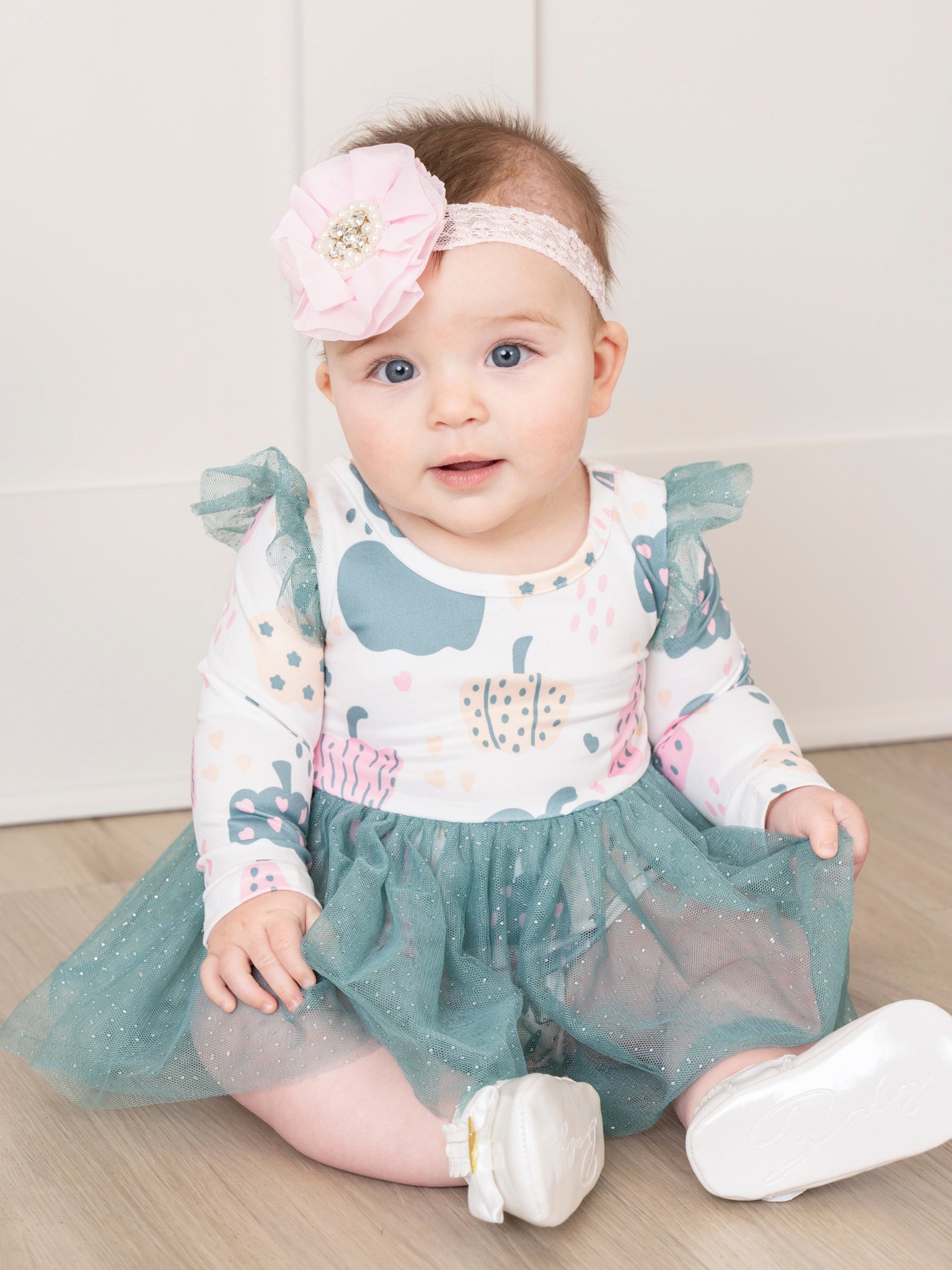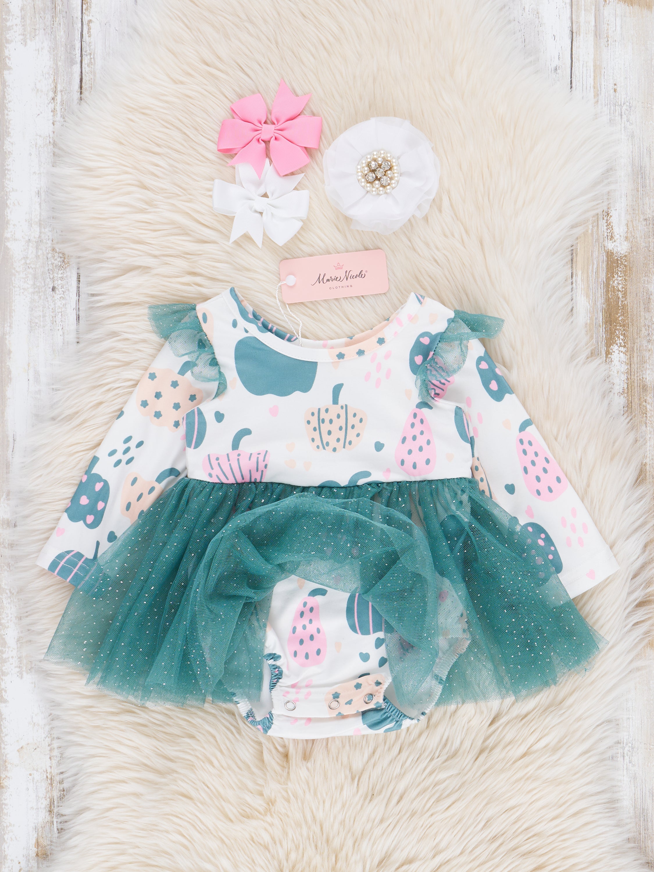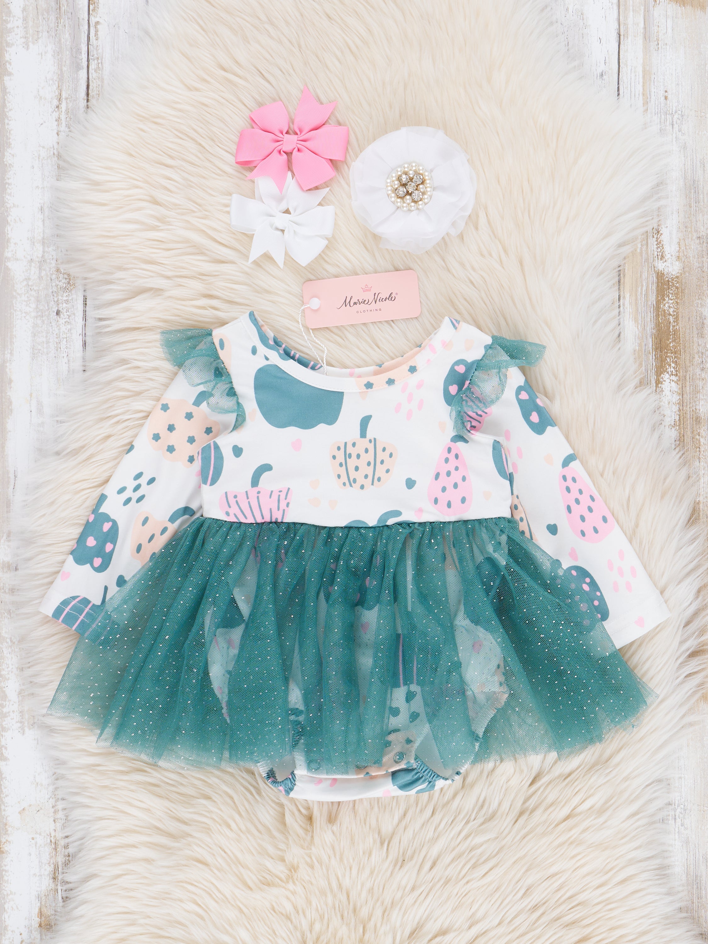 Get ready to fall in love with the Deep Teal Doodle Pumpkins Tulle Bubble! This adorable tulle bubble features a deep teal color, long sleeve bodice with a playful pumpkin print. Perfect for a fun day out, this outfit will have your little one looking stylish and comfortable all day long. Shop the matching sister set.