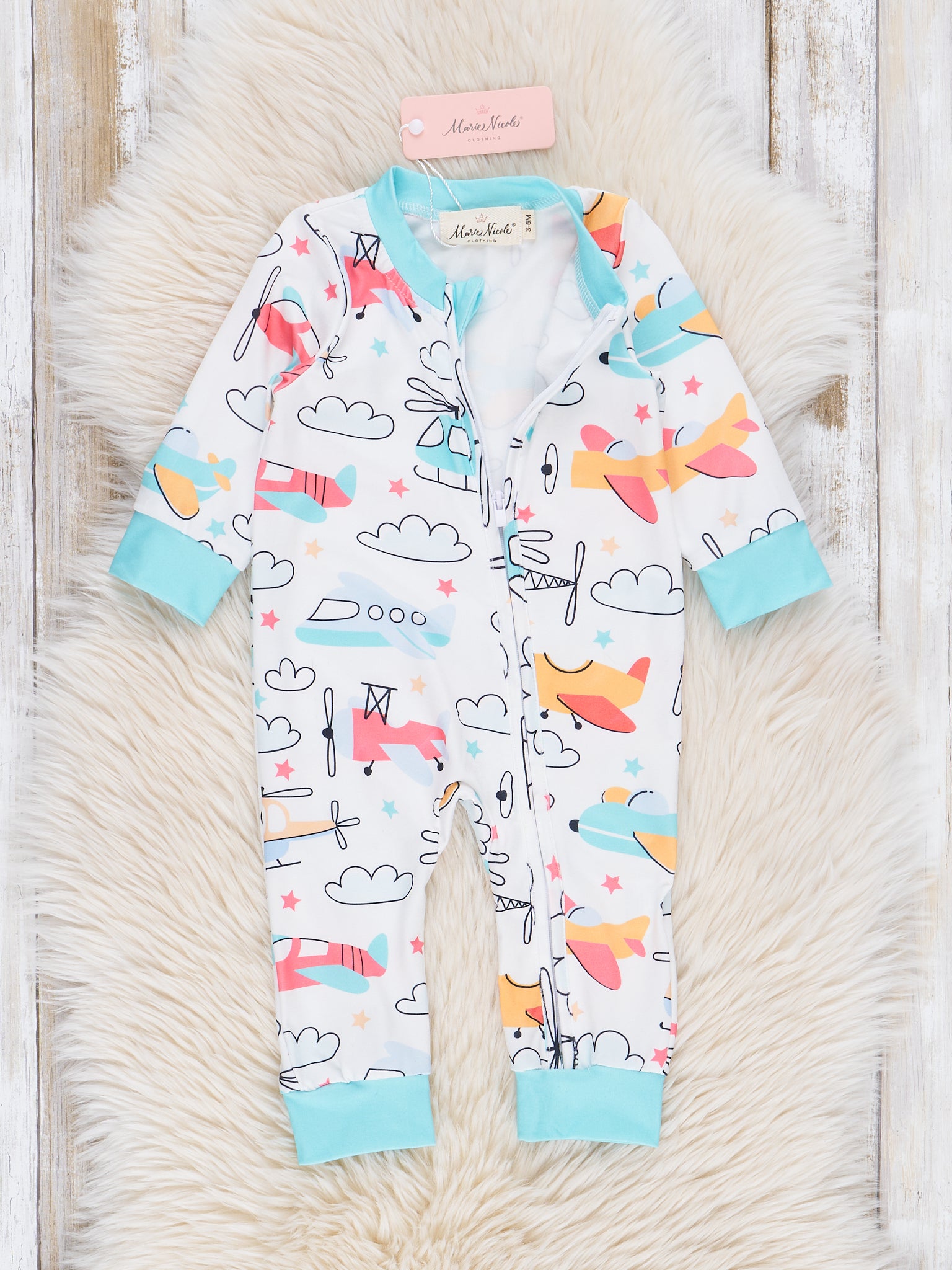 Float away on cloud nine with Cloud Nine Dreams Sleeper Pajamas by Marie Nicole Clothing! Made for baby's comfort, these boys sleeper pajamas features a unique asymmetrical zipper closure and a whimsical planes and clouds design. Complete the dreamy set with our coordinating sleep set.