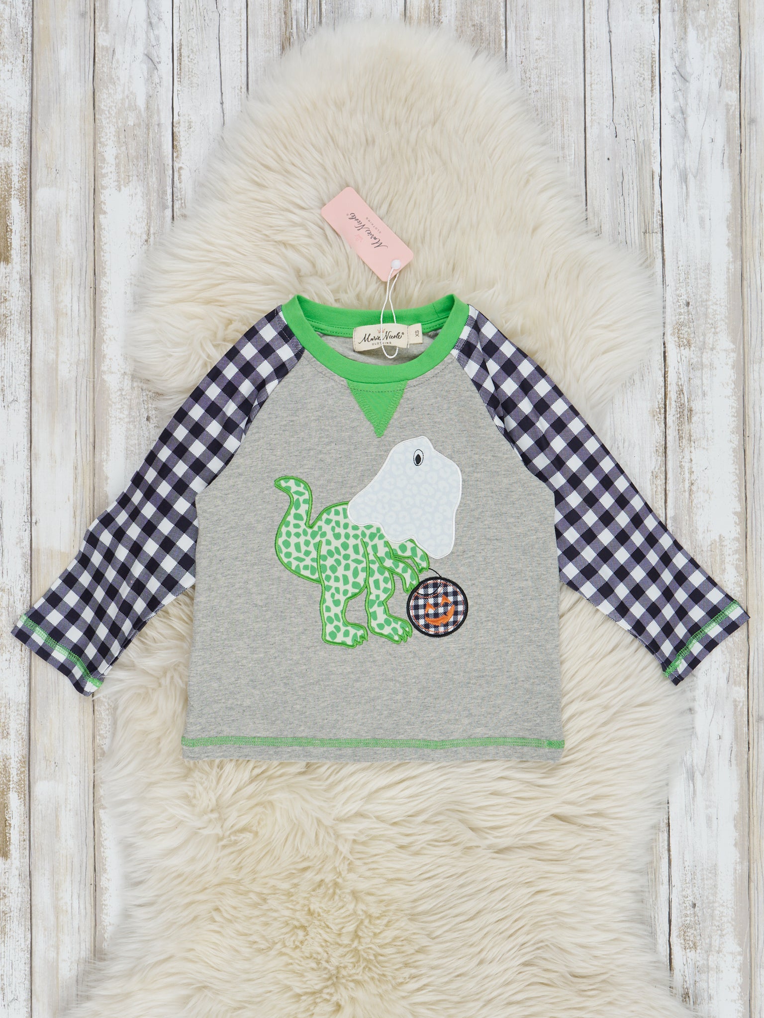 This RAWR-some shirt will launch your boys right into the spooky season! This top features an embroidered dino in a ghost costume, a contrasting green collar, and black & white plaid raglan sleeves.