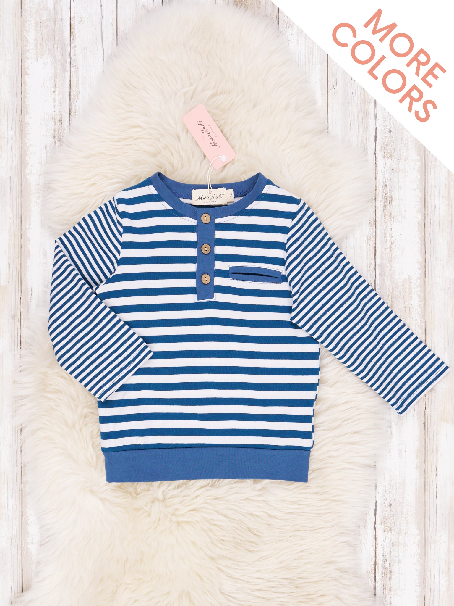 Your sweet boys will love this top! He'll be stylish and comfortable in this henley top featuring a three-button collar and alternating-size stripes. Available in Blue/White and Grey/White.