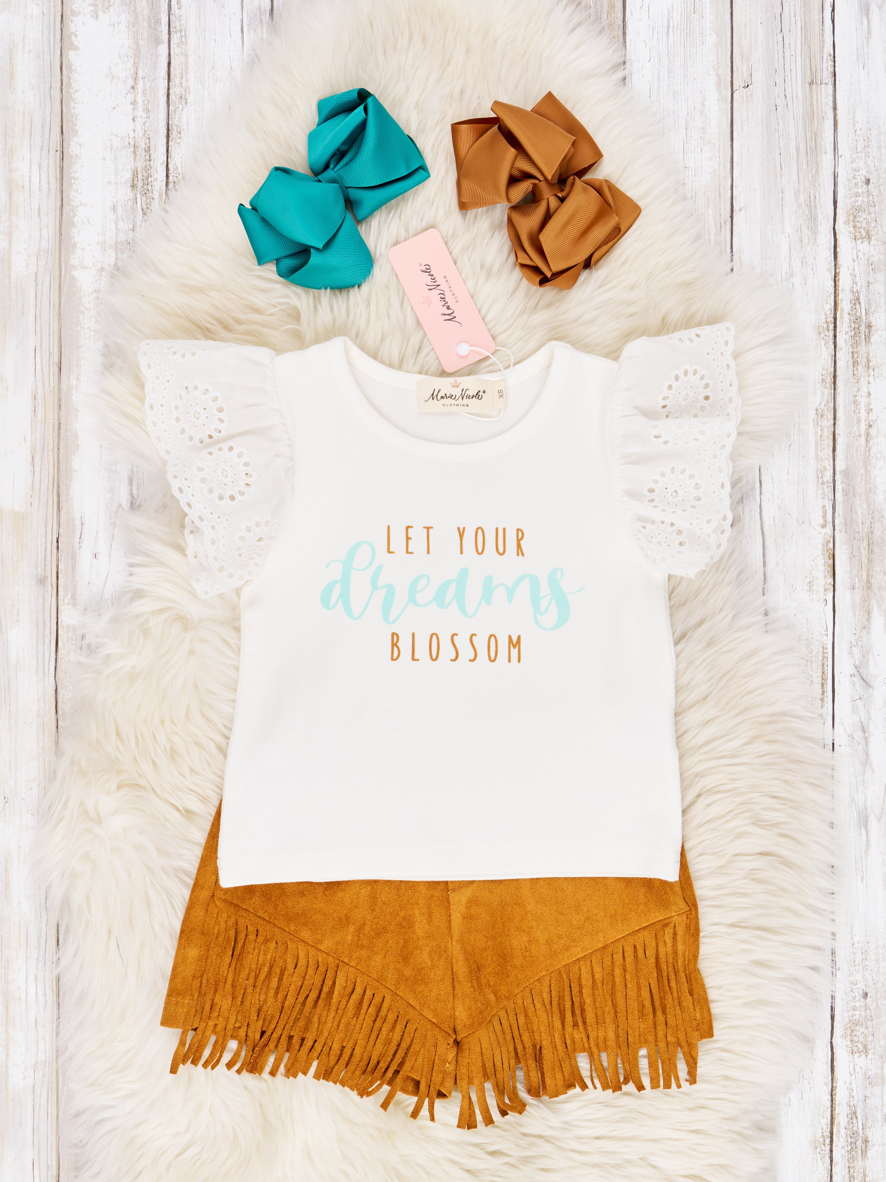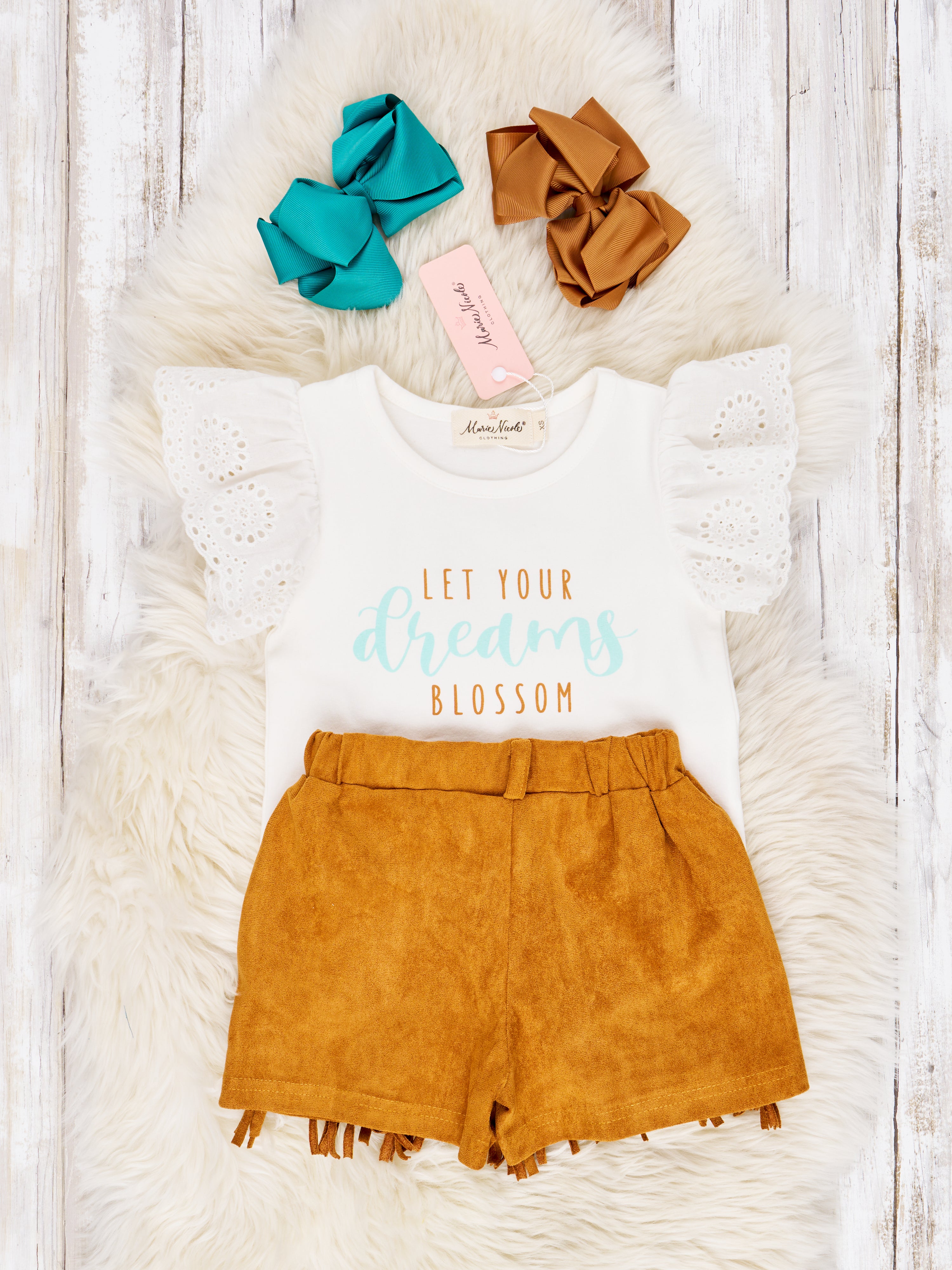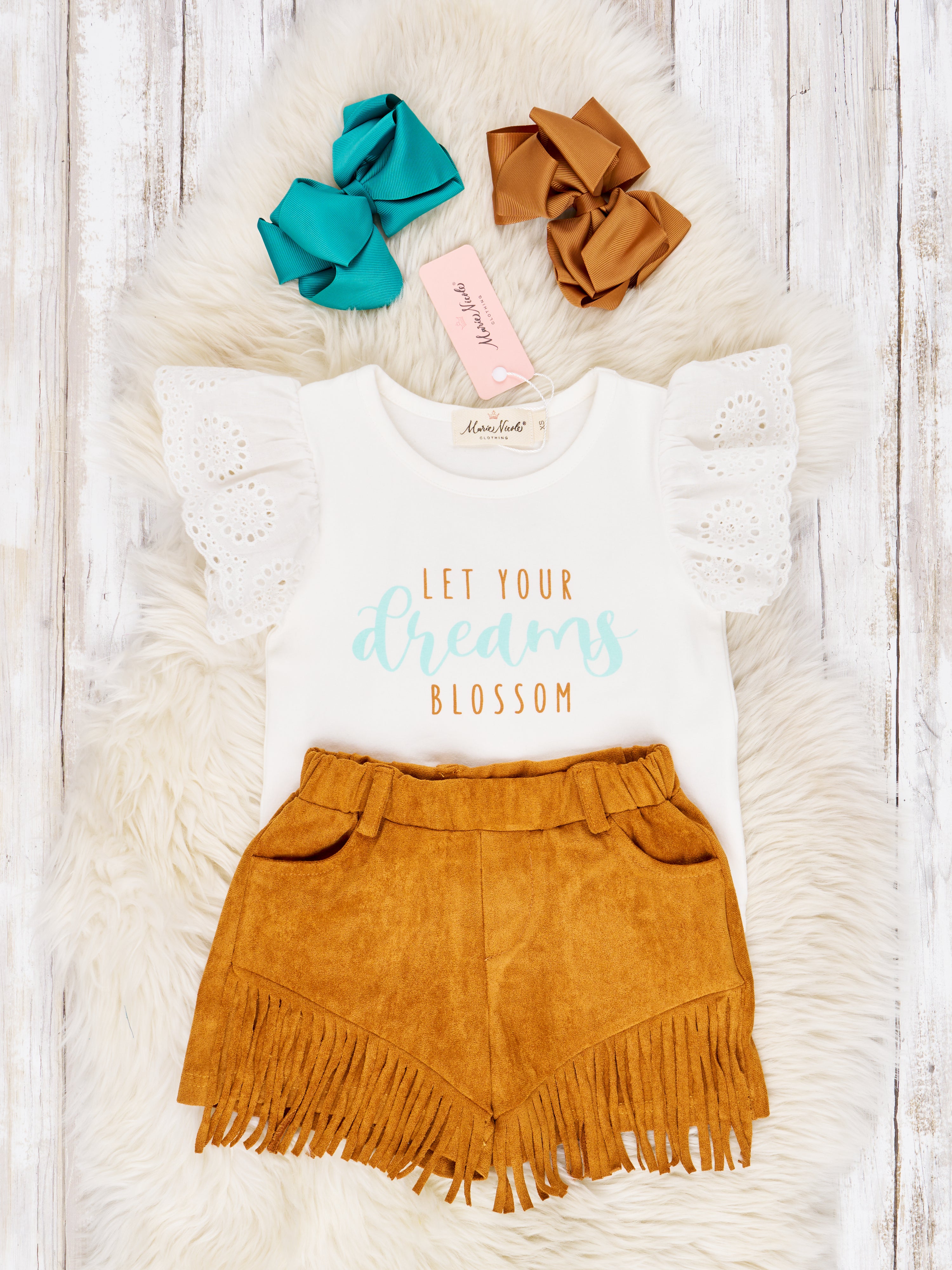 Make them feel like a wildflower in the “Dreams Blossom” Fringe Outfit! With its white lace sleeve top and cozy suede shorts, the elastic waistband ensures that they can explore with ease. And, of course, the fringe will add a fun touch and let their dreams blossom!