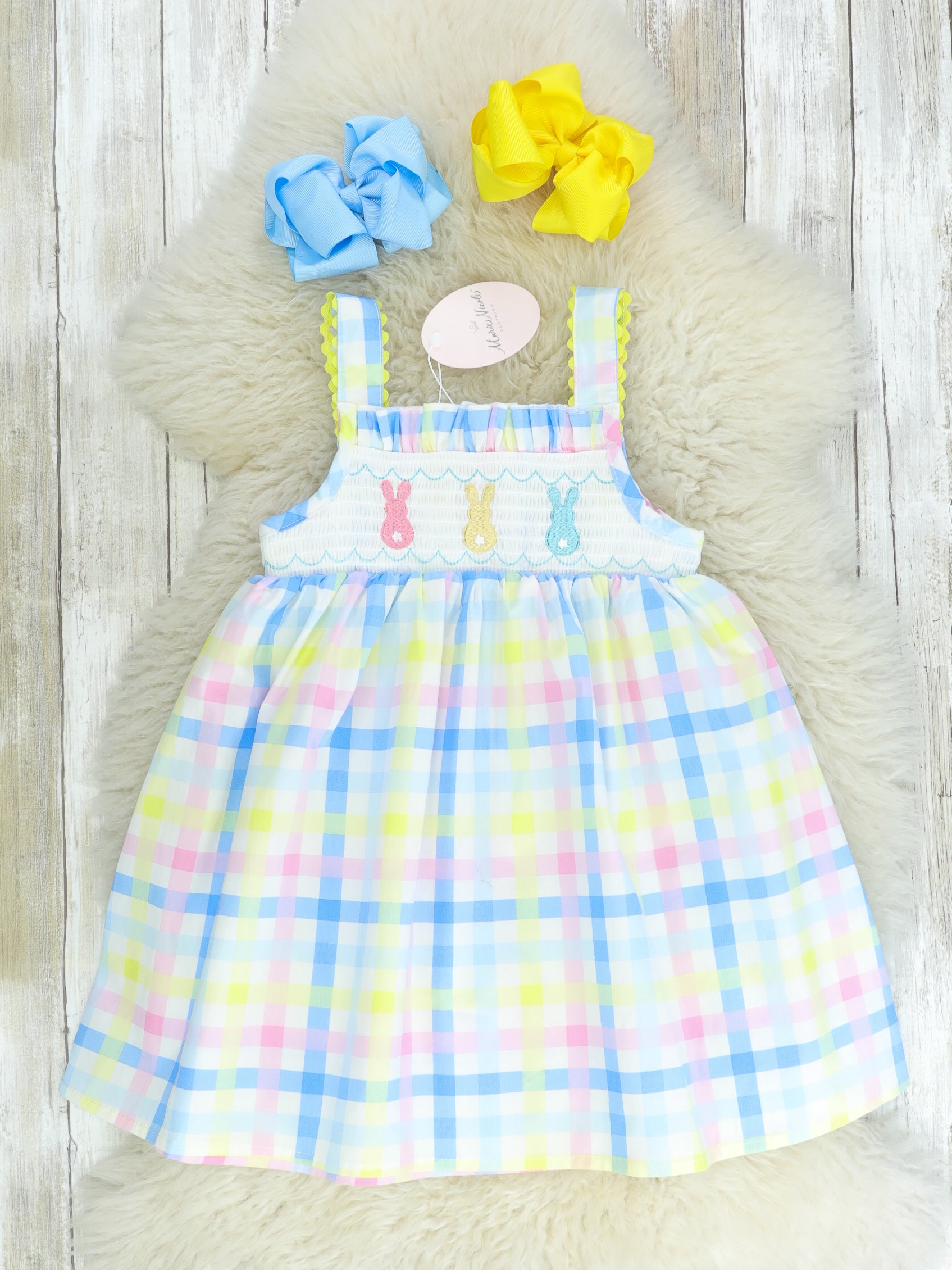 This Easter collection has the prettiest pastel Spring pallete! This dress features a plaid pastel pattern & a smocked bunny detail.