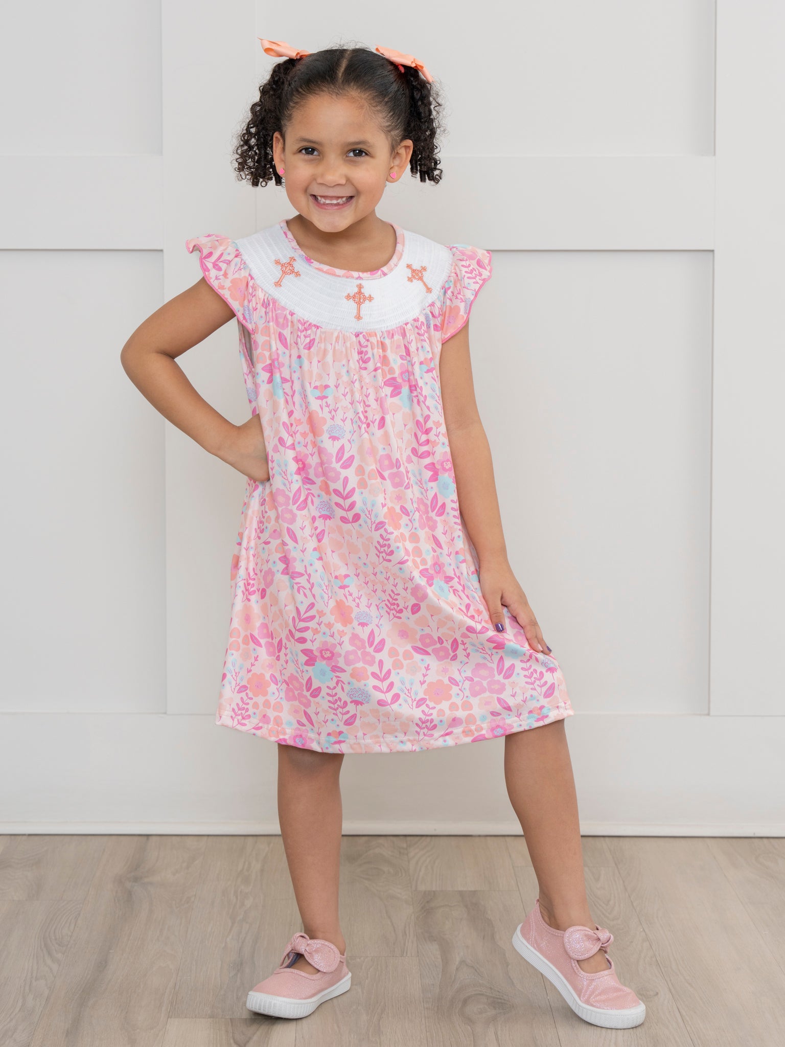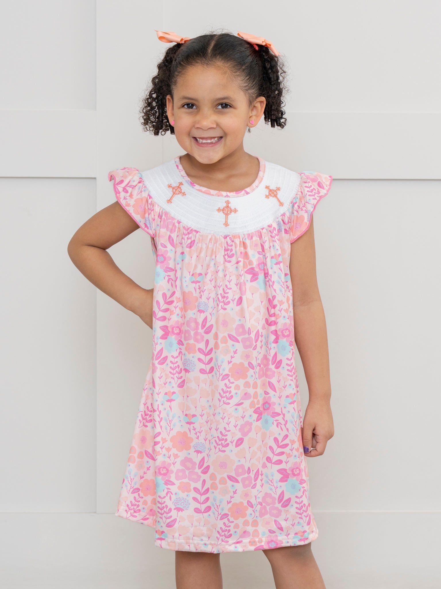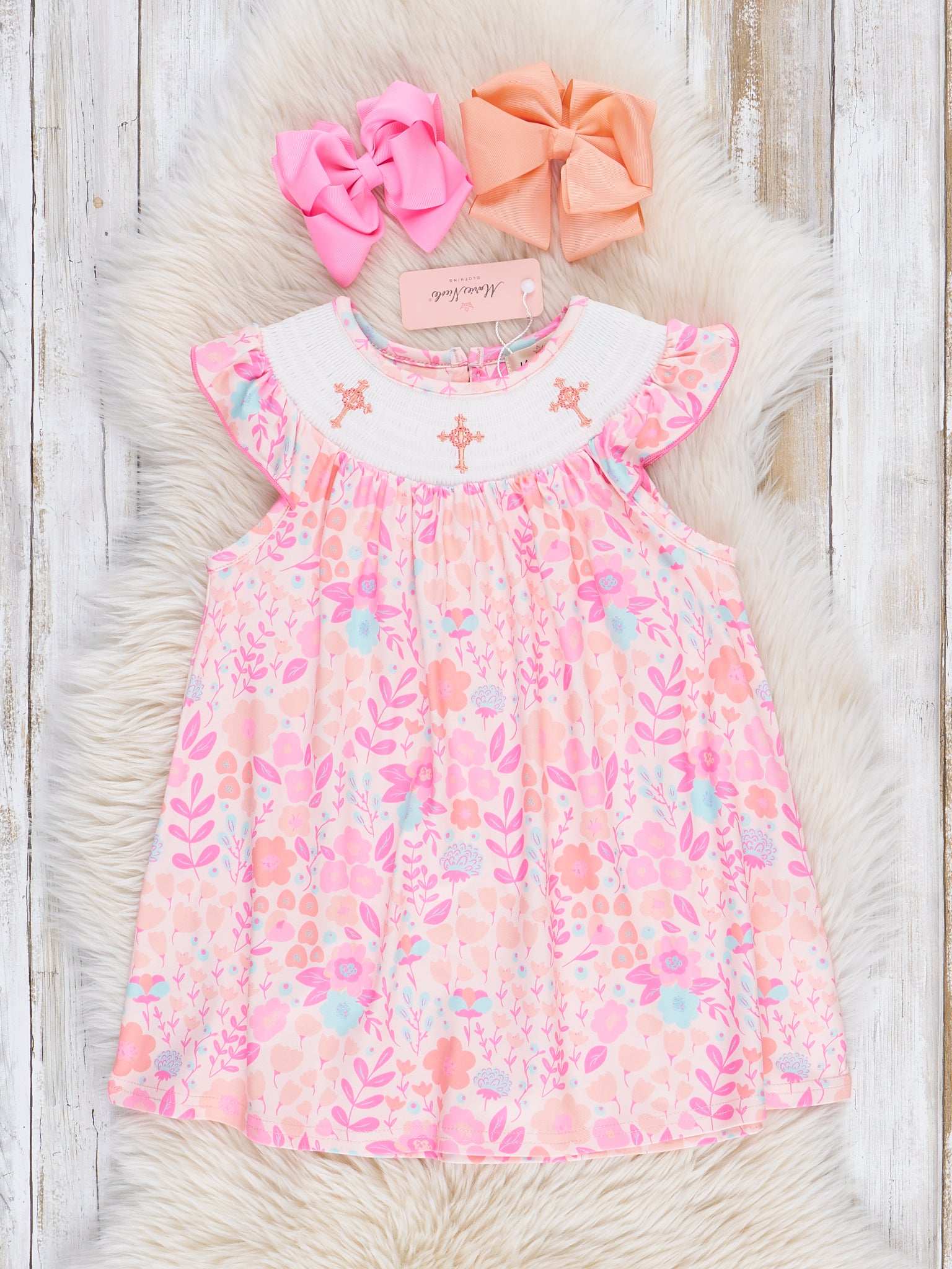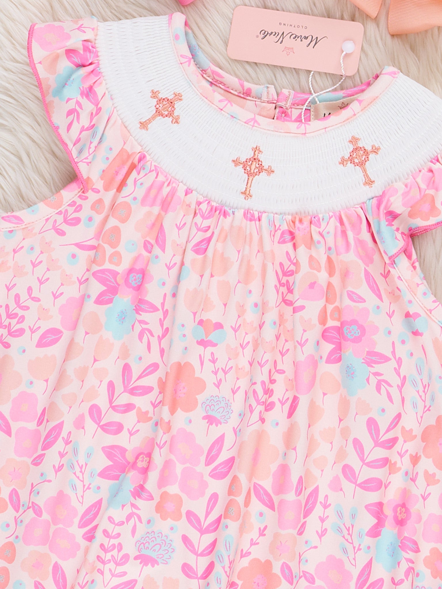 Welcome the spring season with our Easter Floral Smocked Dress! This adorable dress by Marie Nicole Clothing features a delicate embroidered cross design over smocking at the neck and a beautiful floral print bodice. Perfect for all your Easter festivities!