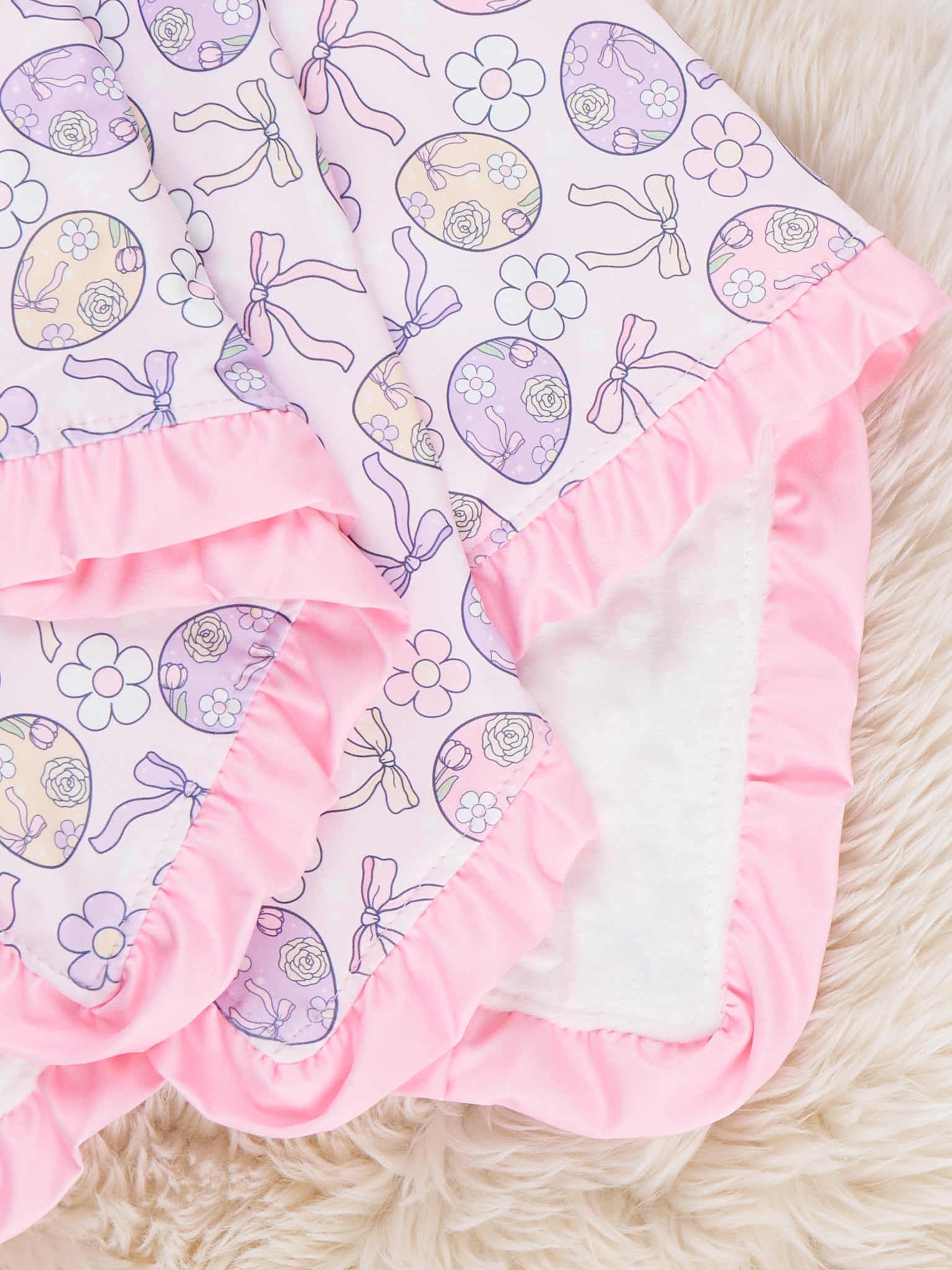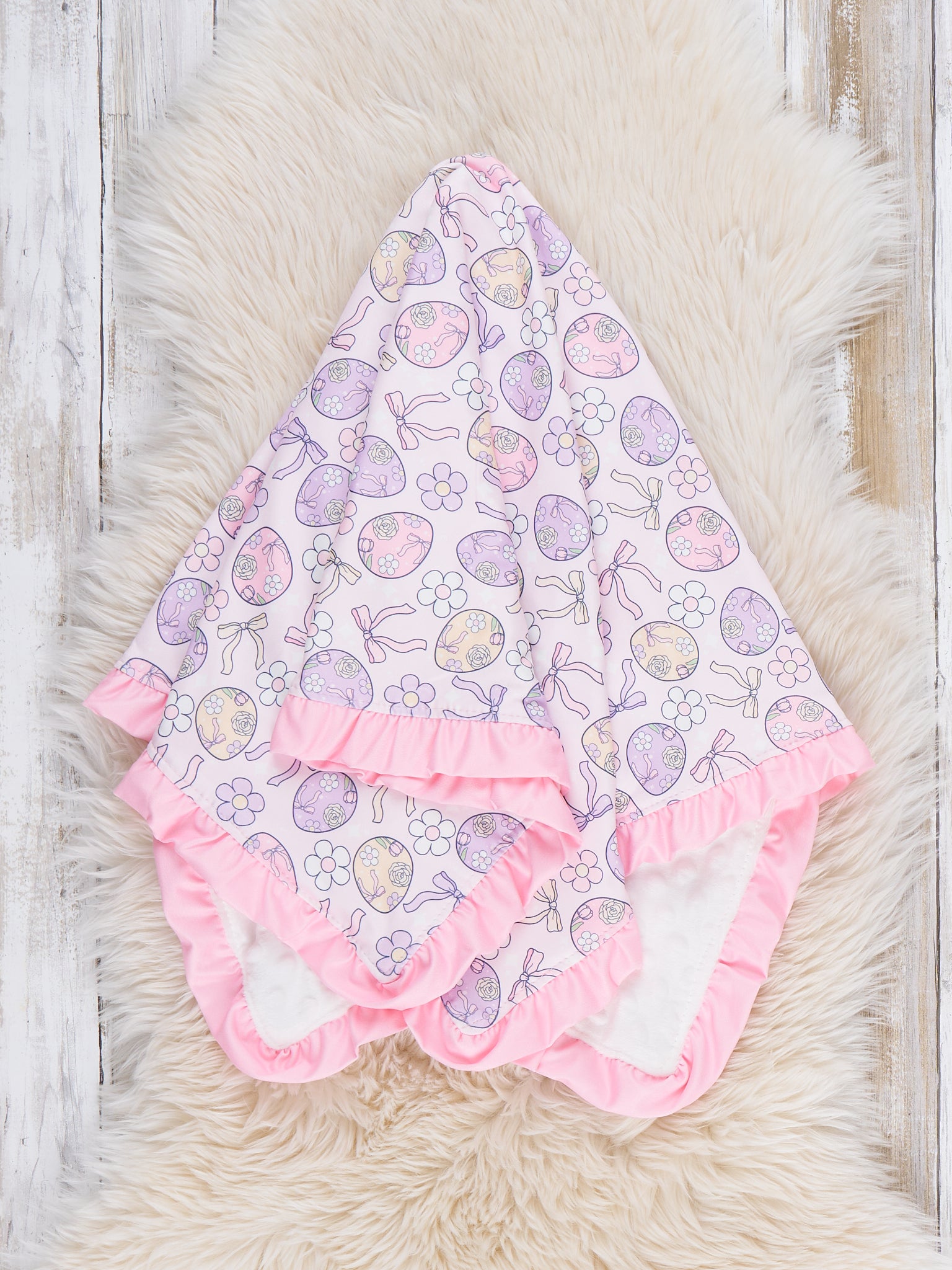 Eggs Galore Ruffle Blanket by Marie Nicole Clothing is a soft, cuddly blanket with an allover Easter egg and bunny print finished with a sweet ruffle trim. The plush backing and convenient size make it perfect for snuggles, tummy time, stroller rides, and Easter-morning photos.