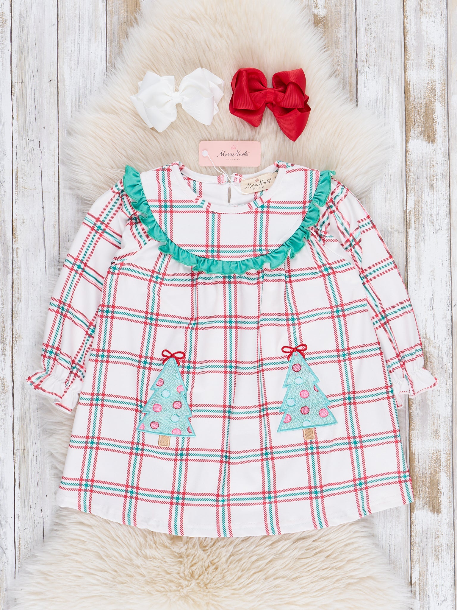 Embroidered Christmas Trees Plaid Ruffle Dress
