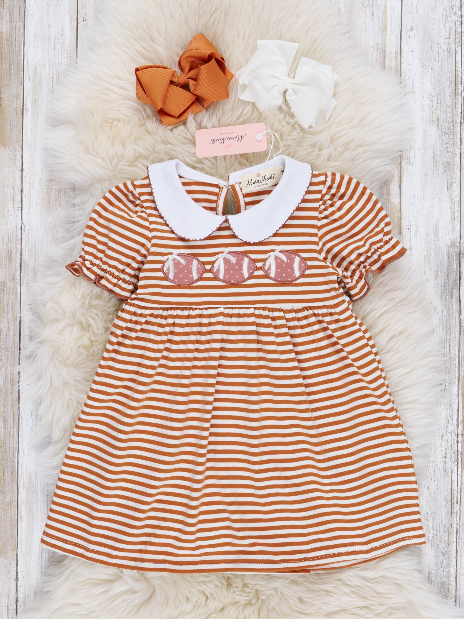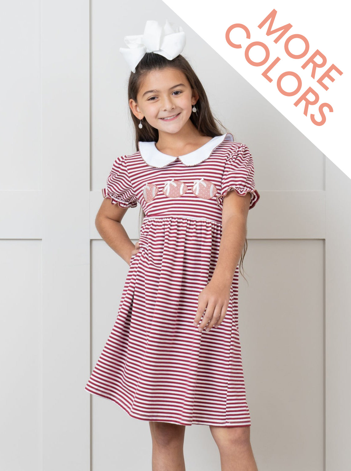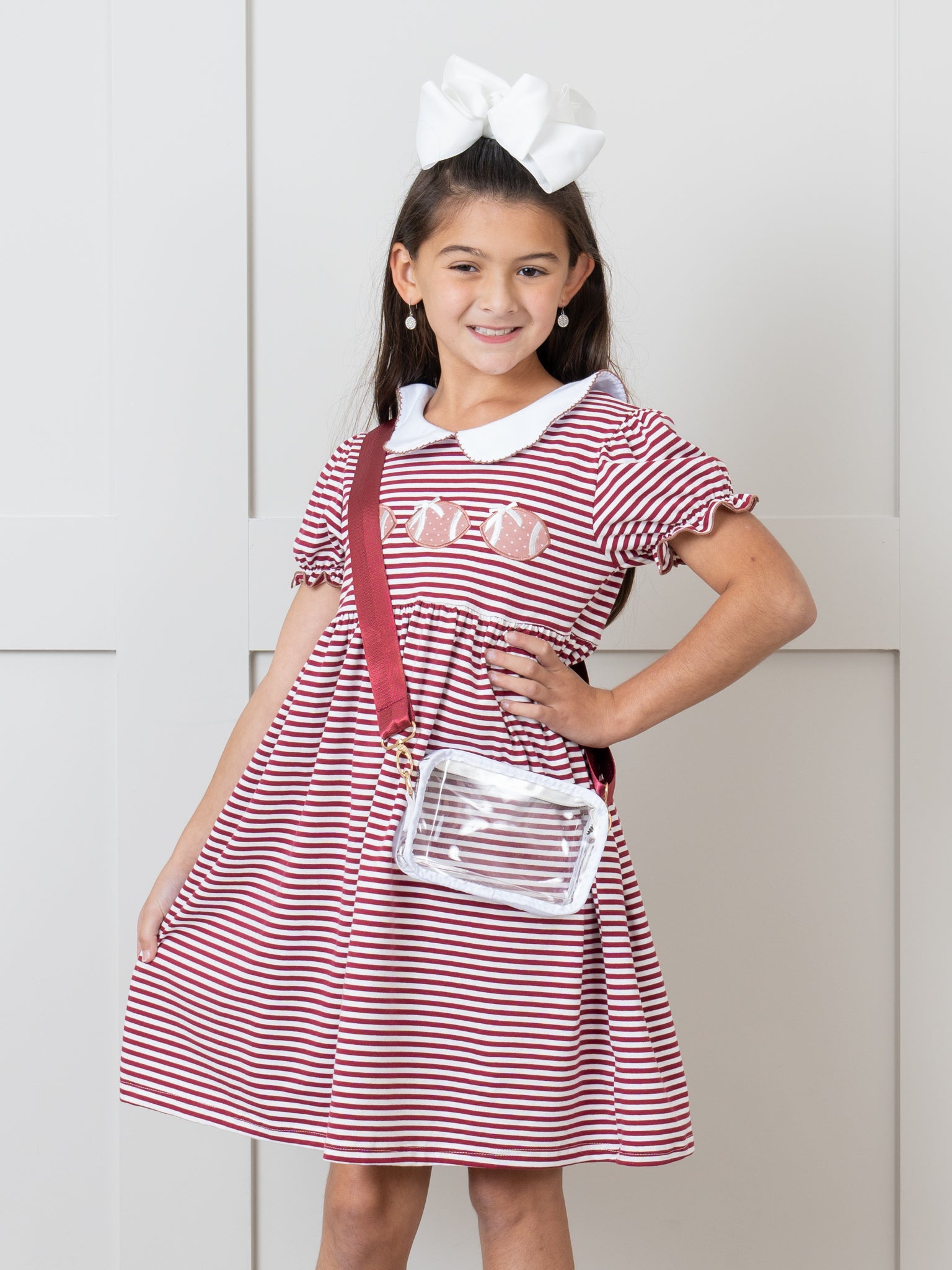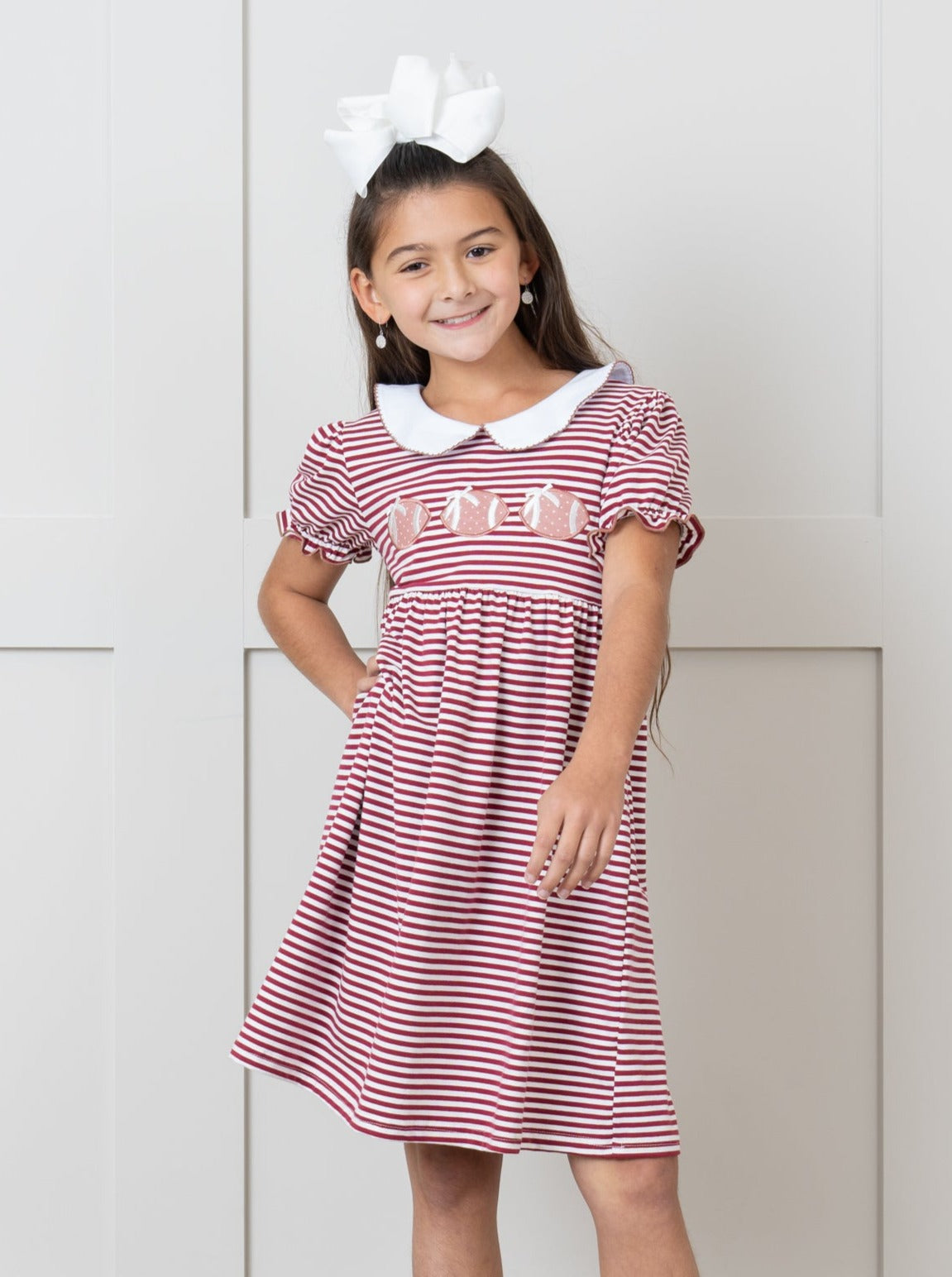 This Embroidered Football Striped sister set is a touchdown! Show off your team spirit at the next big game with this flirty and fun dress featuring a sporty combo of embroidered footballs and collegiate stripes. Now that's a winning look!