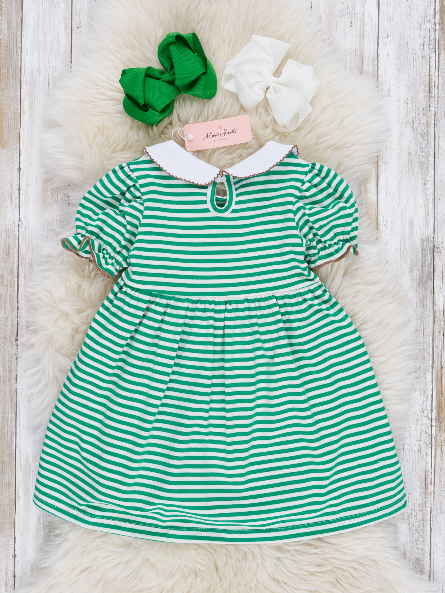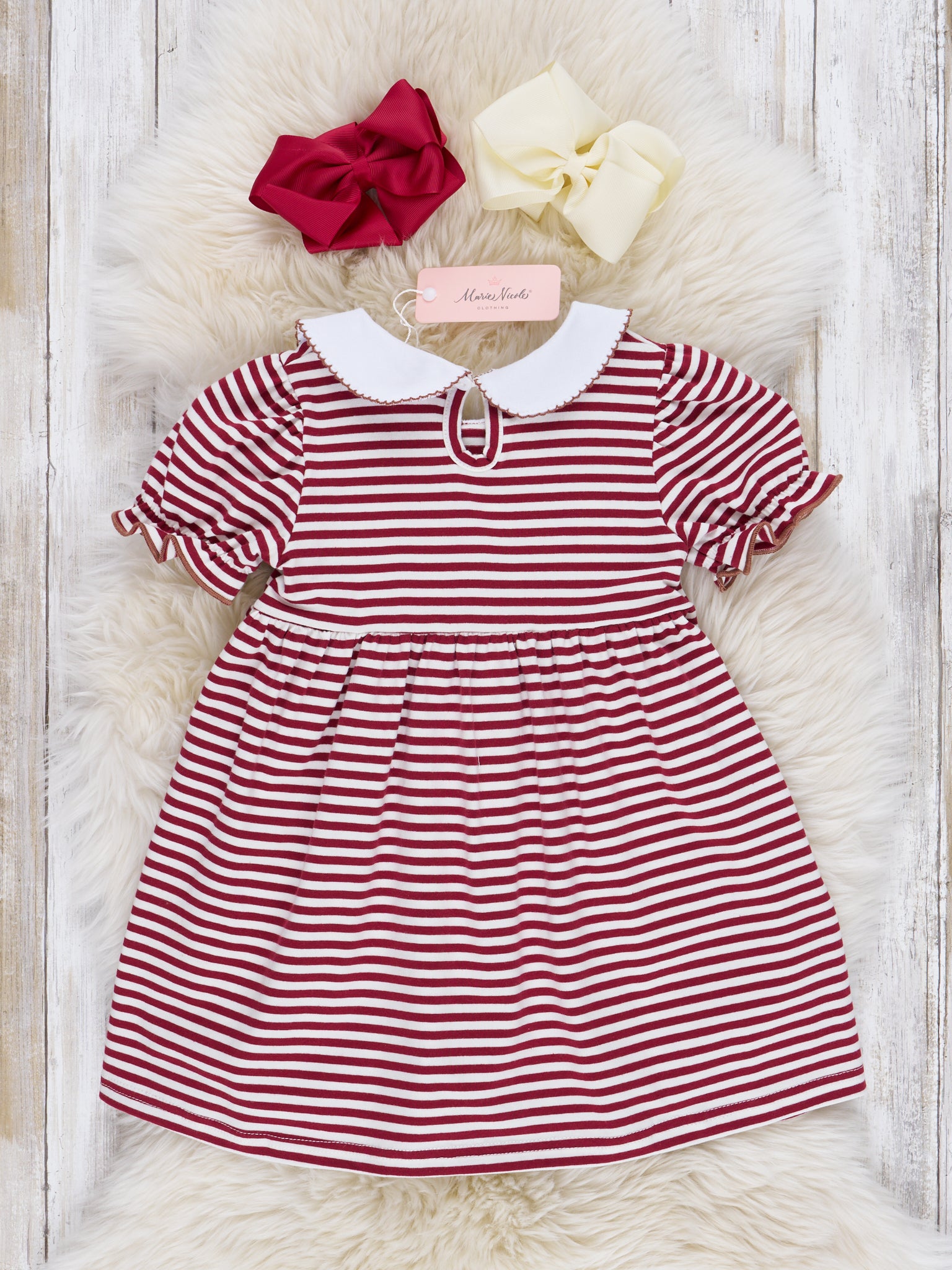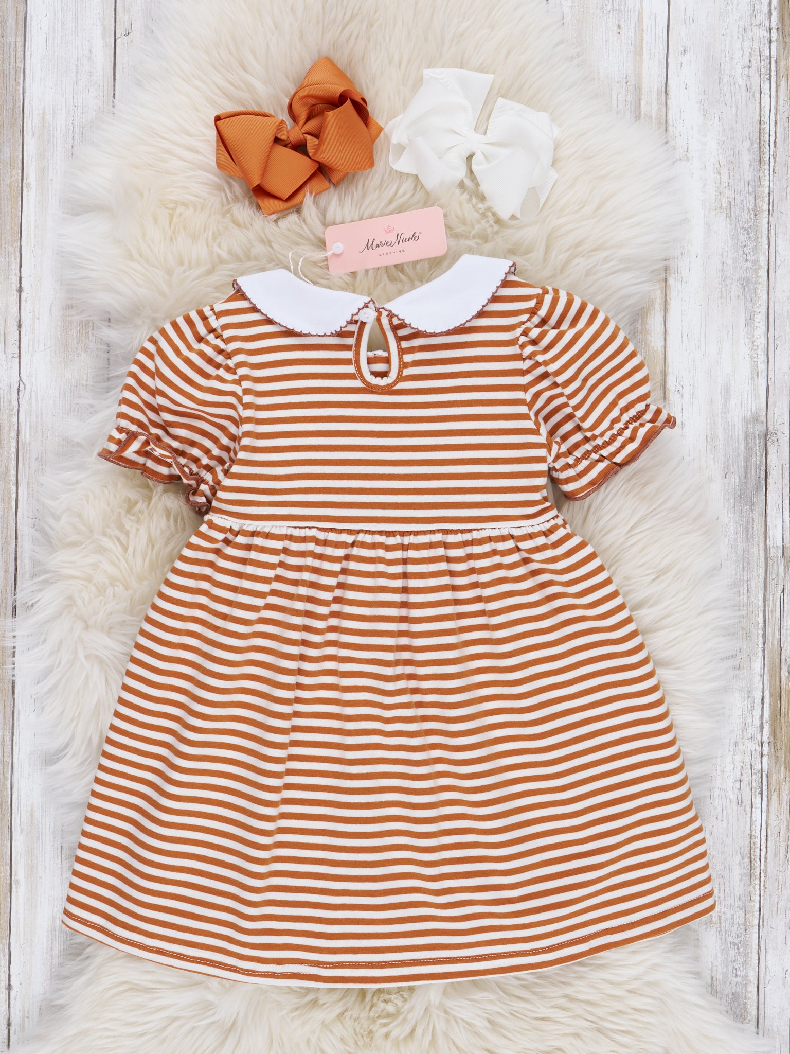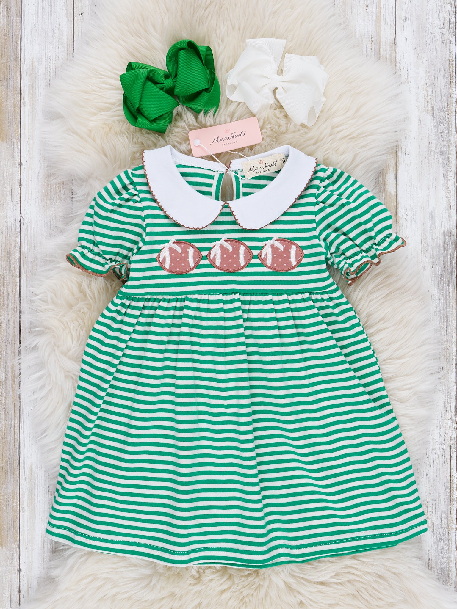 This Embroidered Football Striped sister set is a touchdown! Show off your team spirit at the next big game with this flirty and fun dress featuring a sporty combo of embroidered footballs and collegiate stripes. Now that's a winning look!