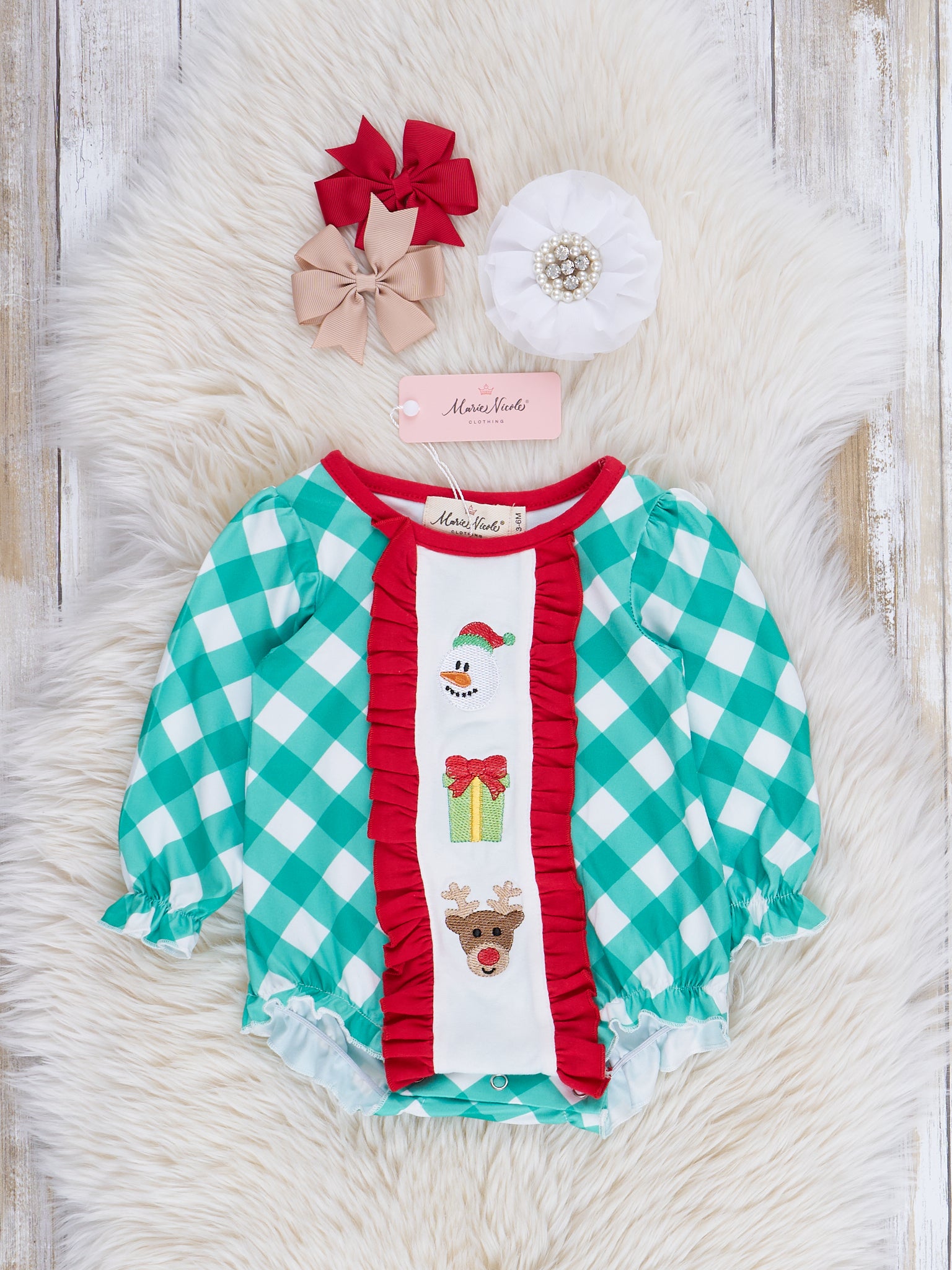 This Embroidered Holiday Gingham Ruffle Bubble will have you kicking up your heels at your next family get-together! Perfect for the holidays, this jolly number features a festive gingham pattern, red ruffles, and delicate embroidery for an extra touch of holiday cheer! Put the fun in functional this season! Shop the matching set here.