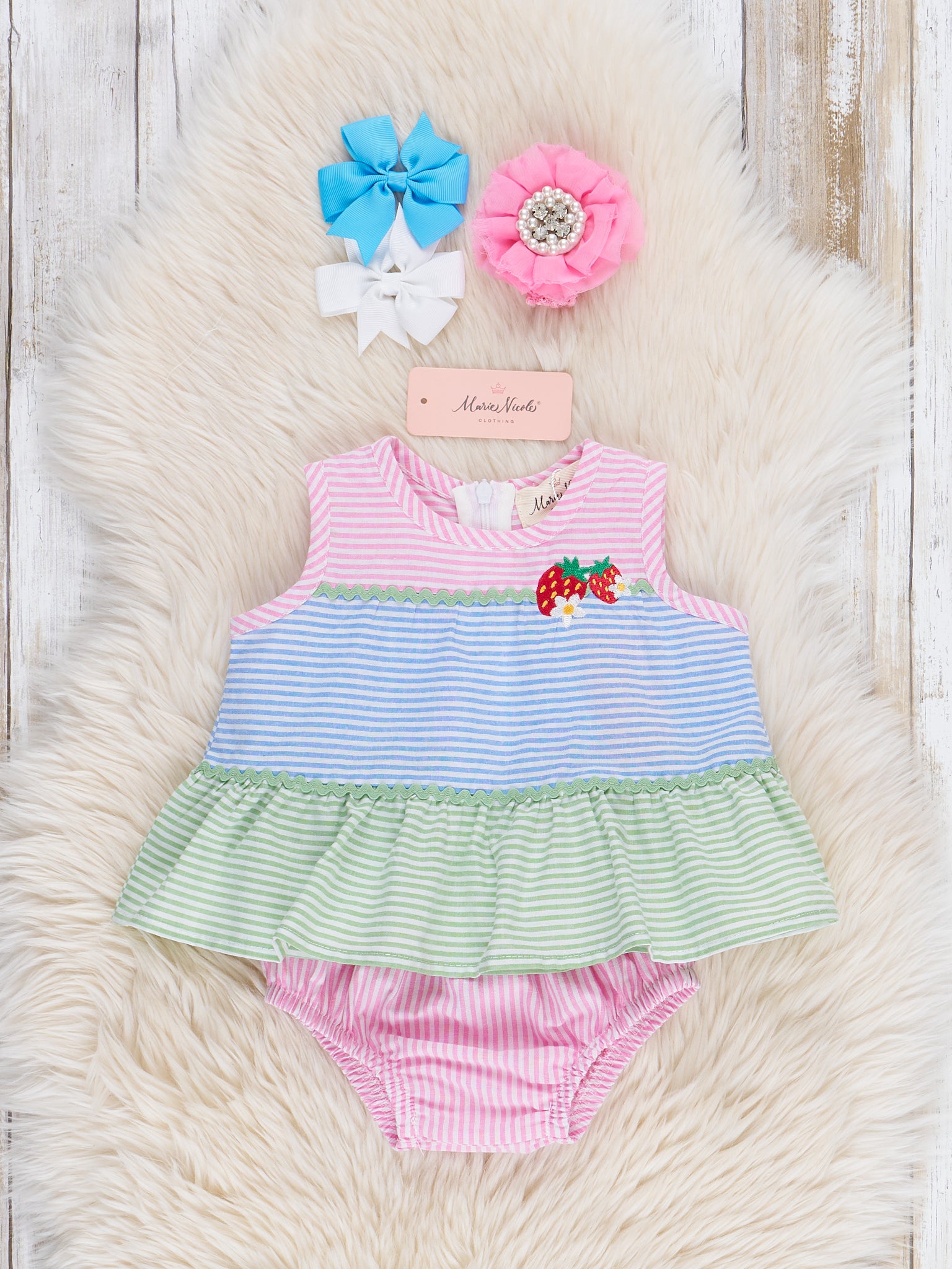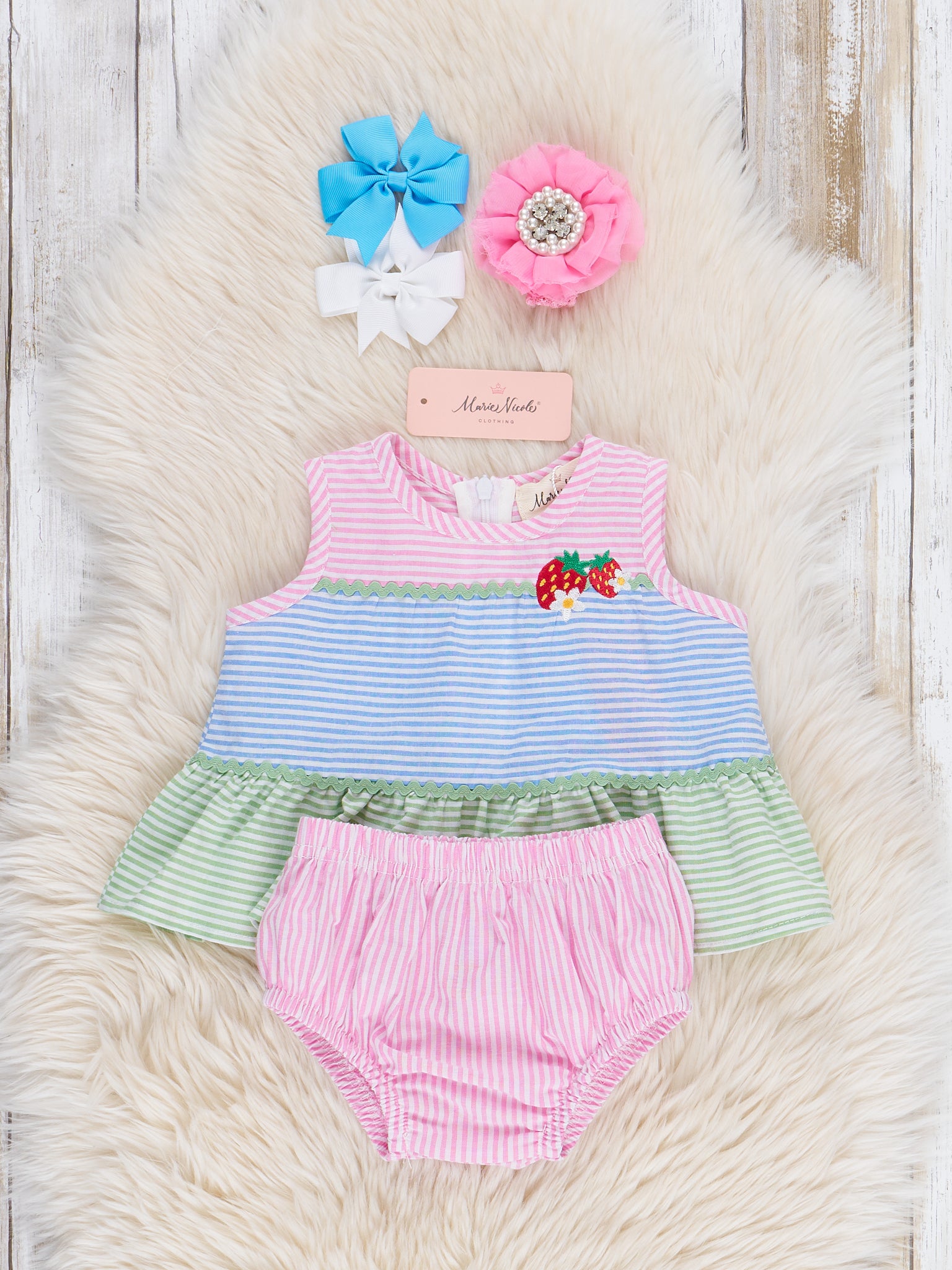 Get ready to make a stylish and playful statement with our Embroidered Strawberry Striped Bloomers Outfit by Marie Nicole Clothing. Featuring a colorful color block design in shades of pink, blue, and green, along with a charming embroidered strawberry, paired with pink striped bloomers to keep your little one looking cute and comfortable all day long!