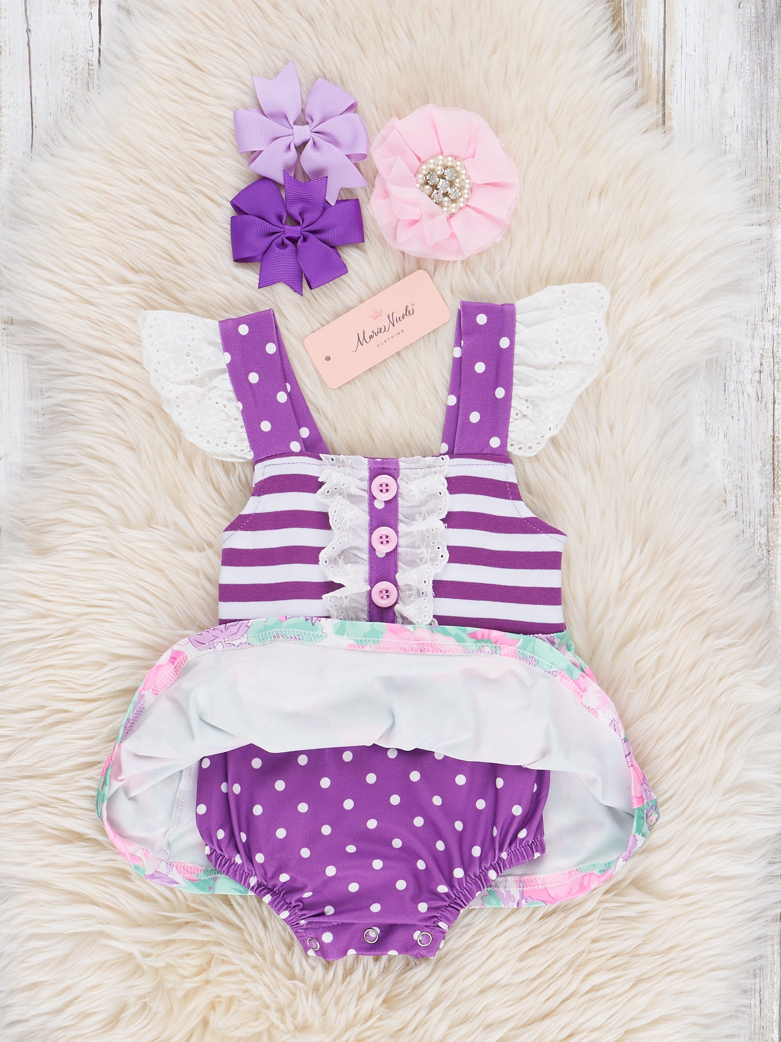 Your little one will be blooming with style in our Eyelet Flutter Sleeve Garden Ruffle Bubble! The mixed purple prints, eyelet trim, and floral peplum overlay add a touch of whimsy to this girls bubble. From Marie Nicole Clothing, this piece is perfect for your little fashionista. Pair with our sister set for double the fun!