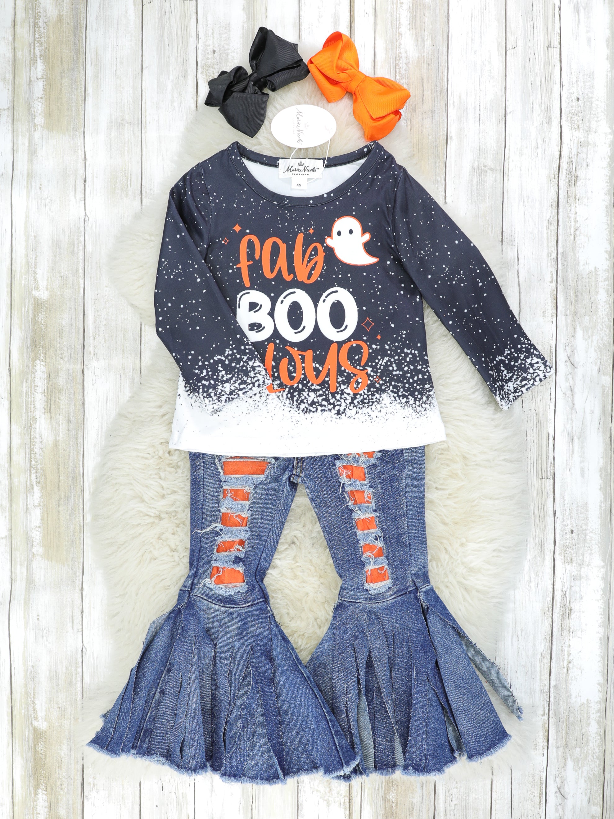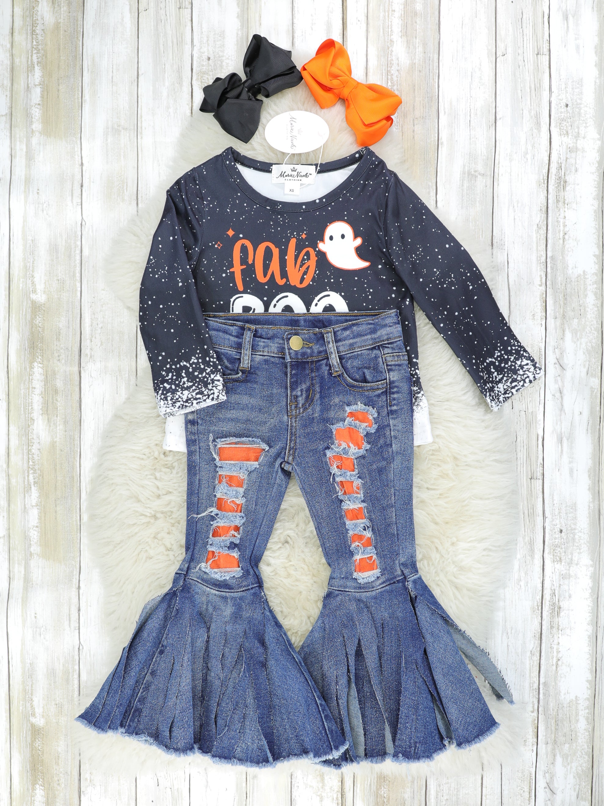 The sassiest outfit for your trendsetter ghouls! This outfit features a distressed bleach top with a faBOOlous ghost & distressed denim bell bottoms with orange patches.