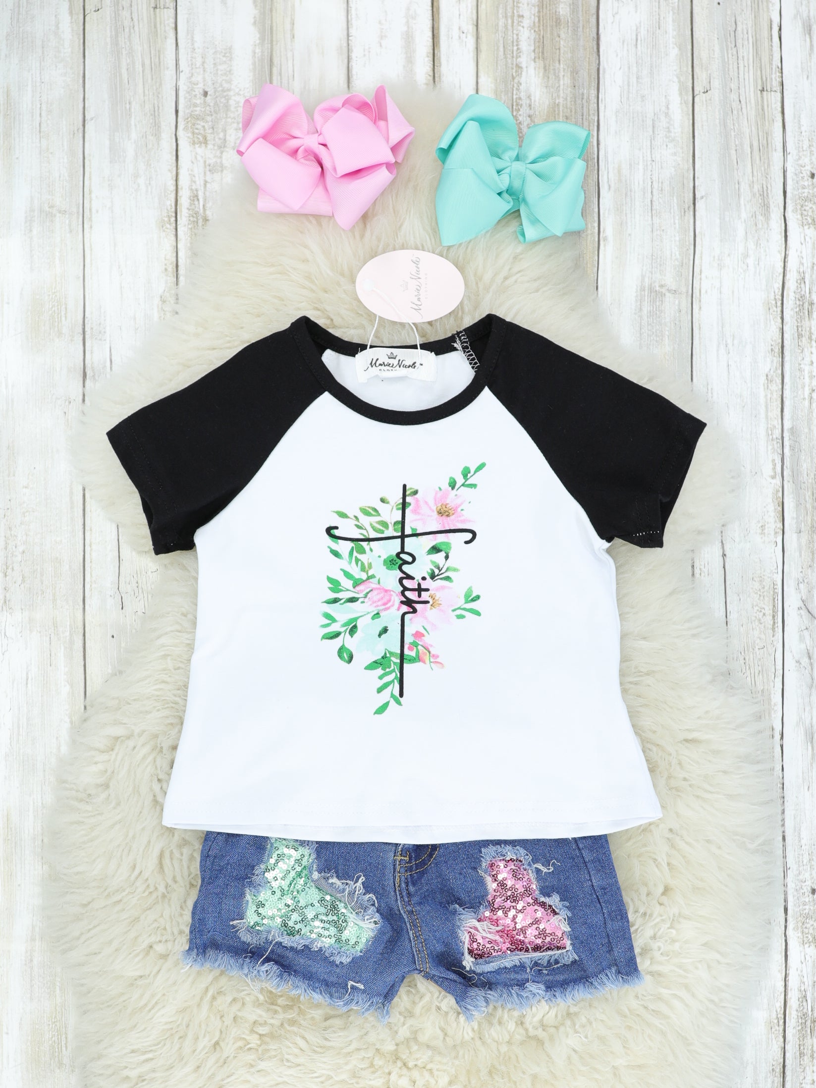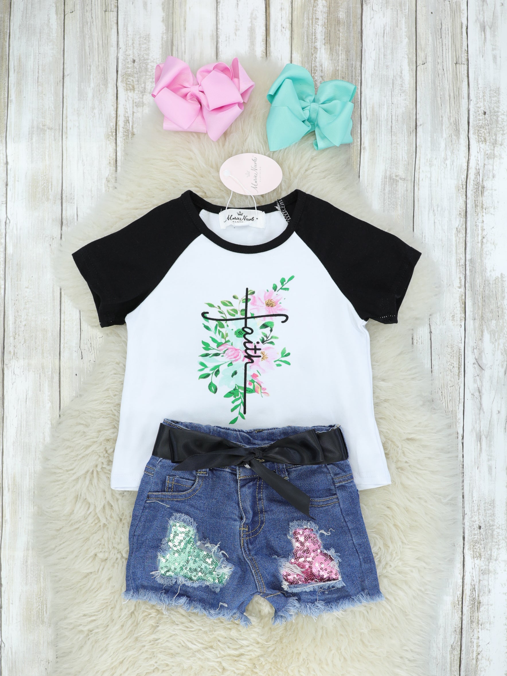 Have Faith and everything else will fall into place! This raglan top features a floral detail with a 'Faith' graphic and adorable sequin distressed shorts in mint and pink.