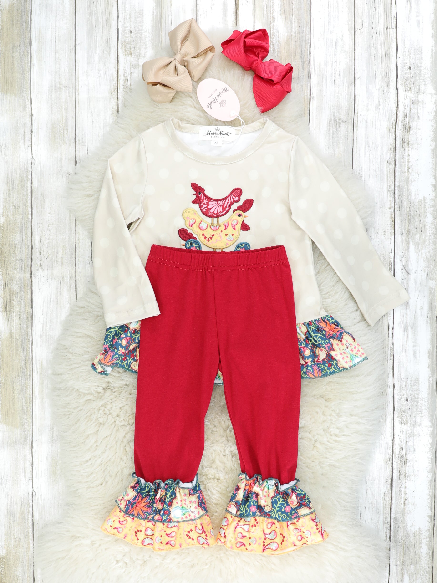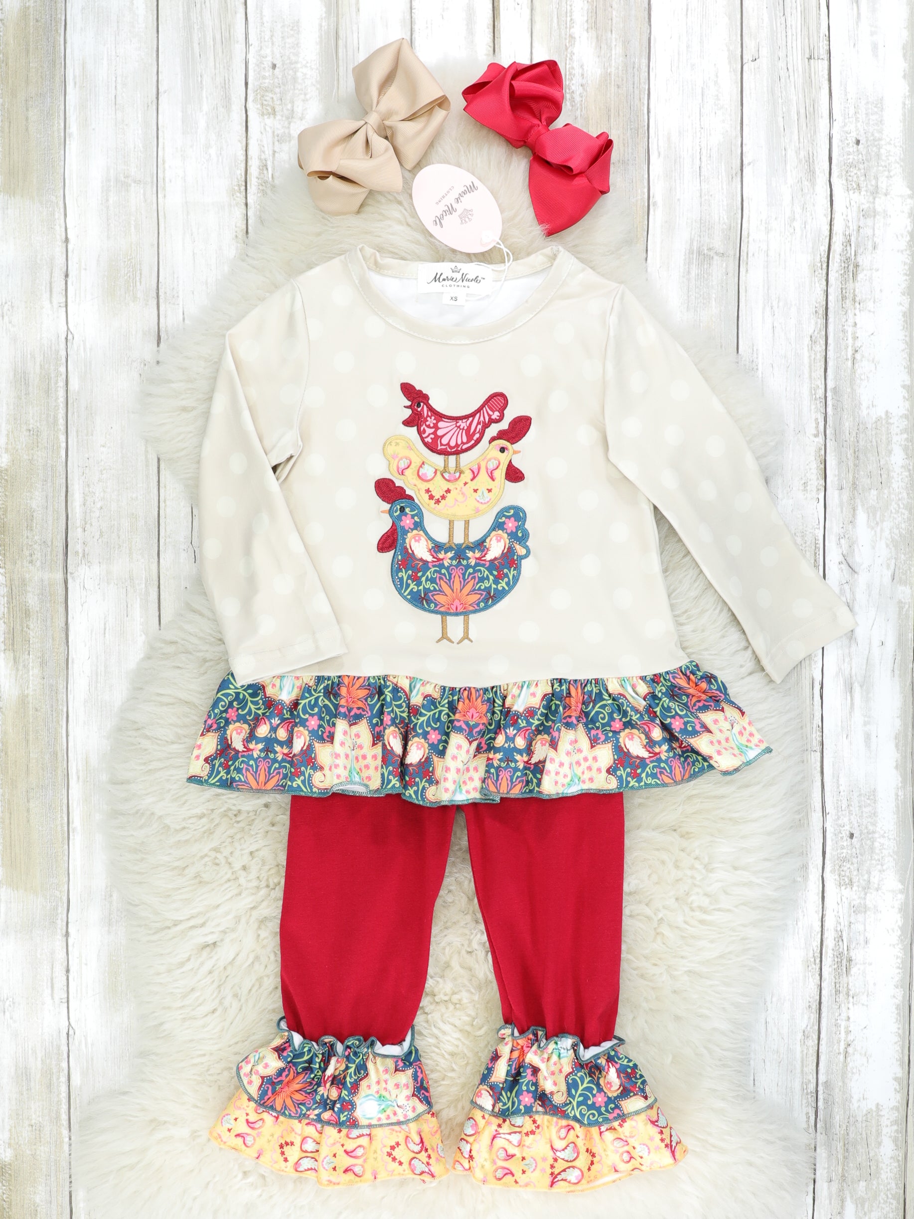 This EGGStraordinary sister set is perfect for your chicks! This outfit features a polka dot tunic with chicken appliqués, ruffle details, & maroon pants with ruffles at the ankles.