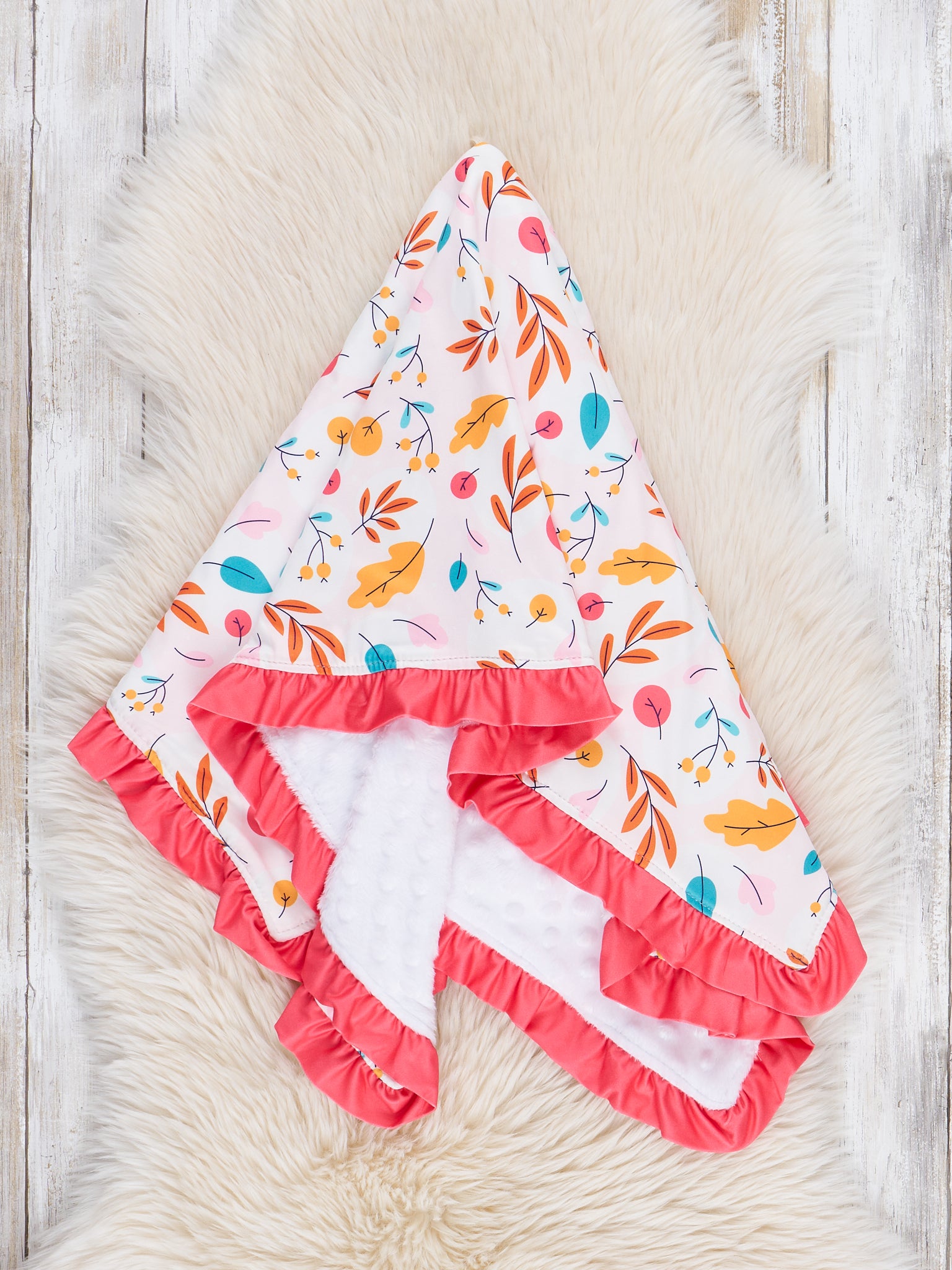 The Fall Vibes Ruffle Leaves Minky Blanket is a soft and snuggly must-have for the season. Featuring a beautiful autumn leaf print and finished with delicate ruffle trim, this blanket from Marie Nicole Clothing wraps your little one in cozy comfort and fall charm. Made from ultra-soft minky fabric, it’s perfect for stroller rides, cuddle time, or adding a seasonal touch to any nursery.
