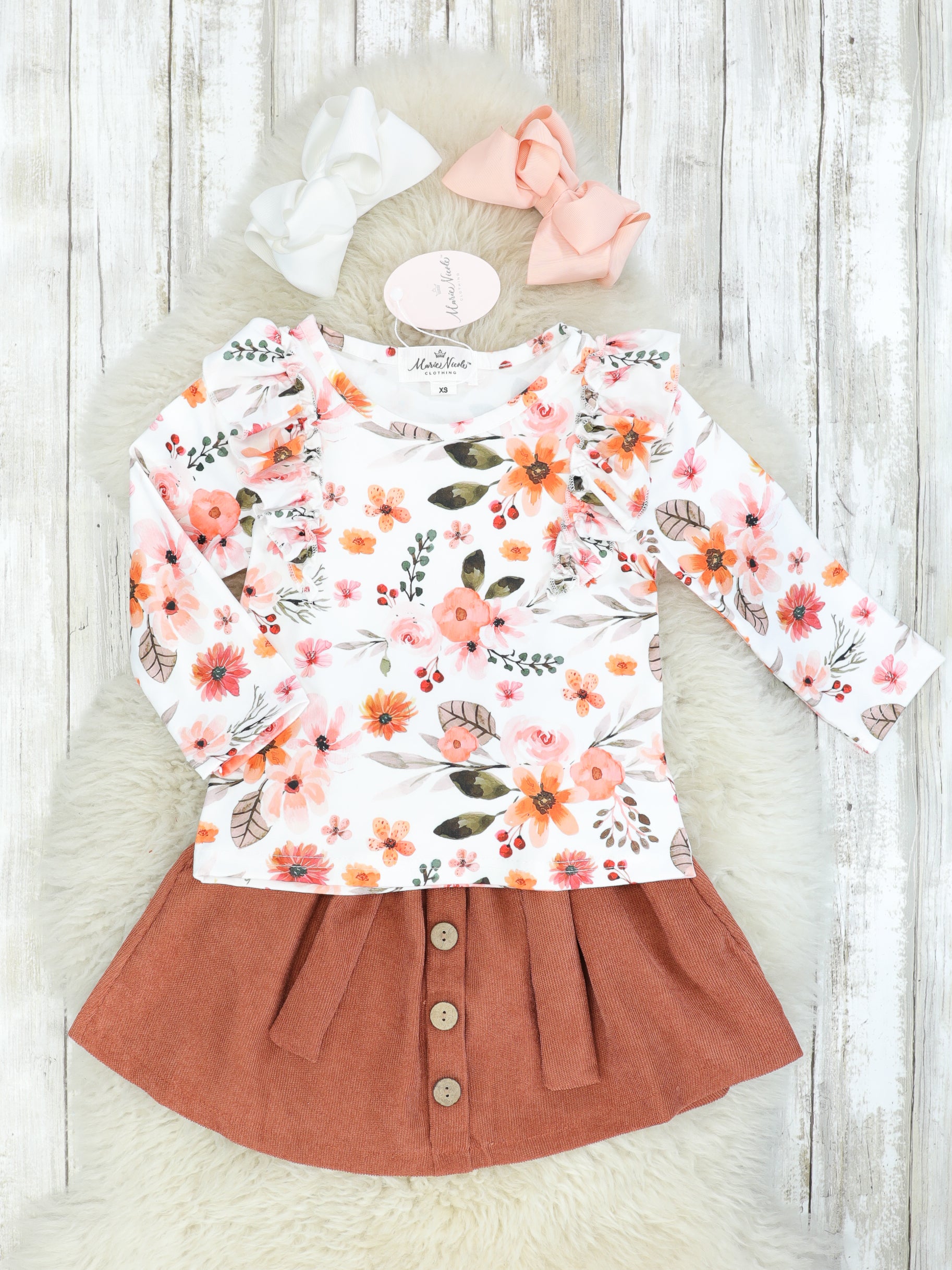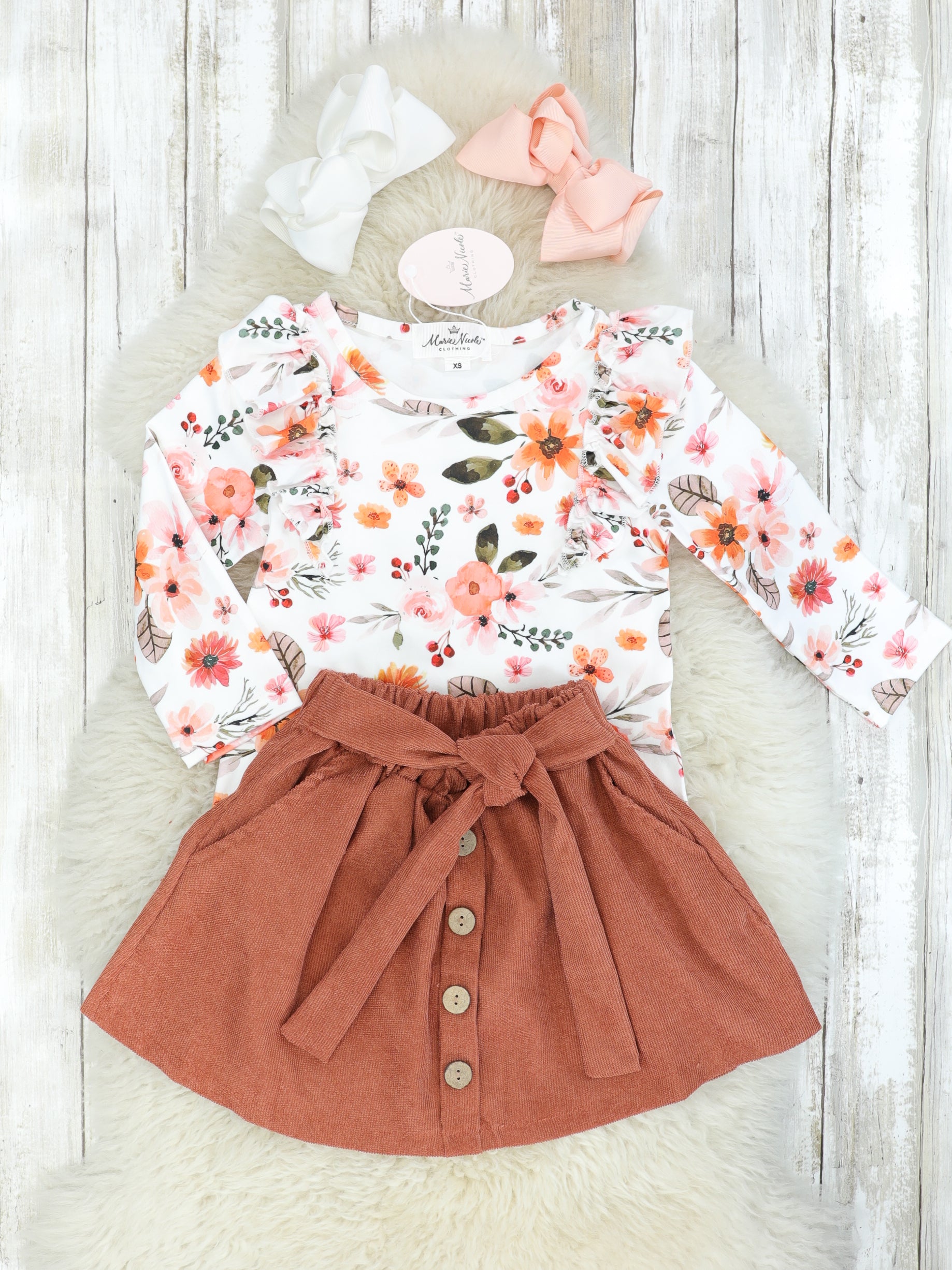 Fall Watercolor Floral Ruffle Top & Rusty Brown Skirt
