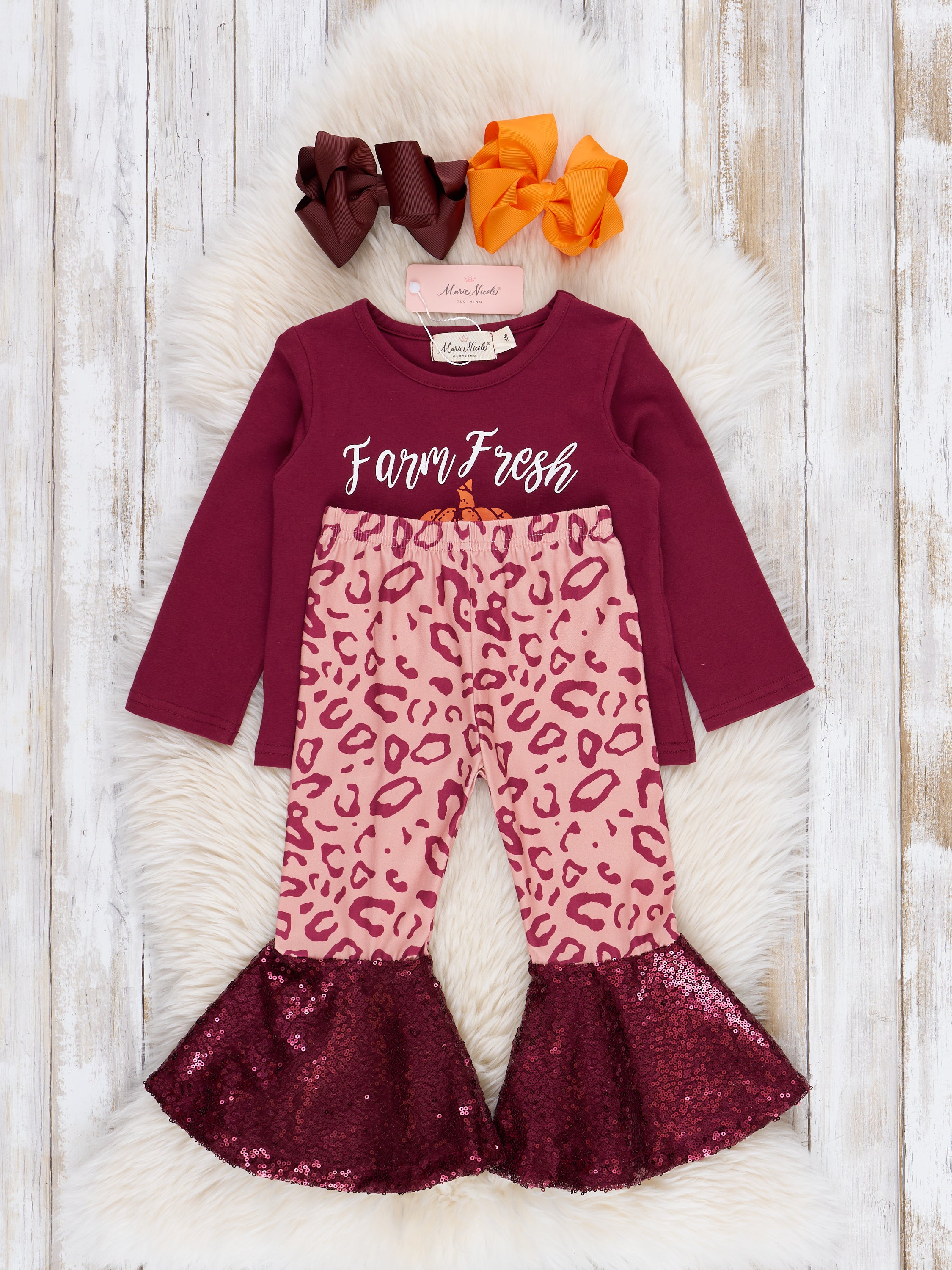 Get ready to strut your stuff in this quirky and stylish girls outfit! Featuring a burgundy long sleeve top with the playful phrase "farm fresh pumpkins" and leopard print leggings that lead to sequin bell bottoms. Perfect for your little fashionista's fall wardrobe!