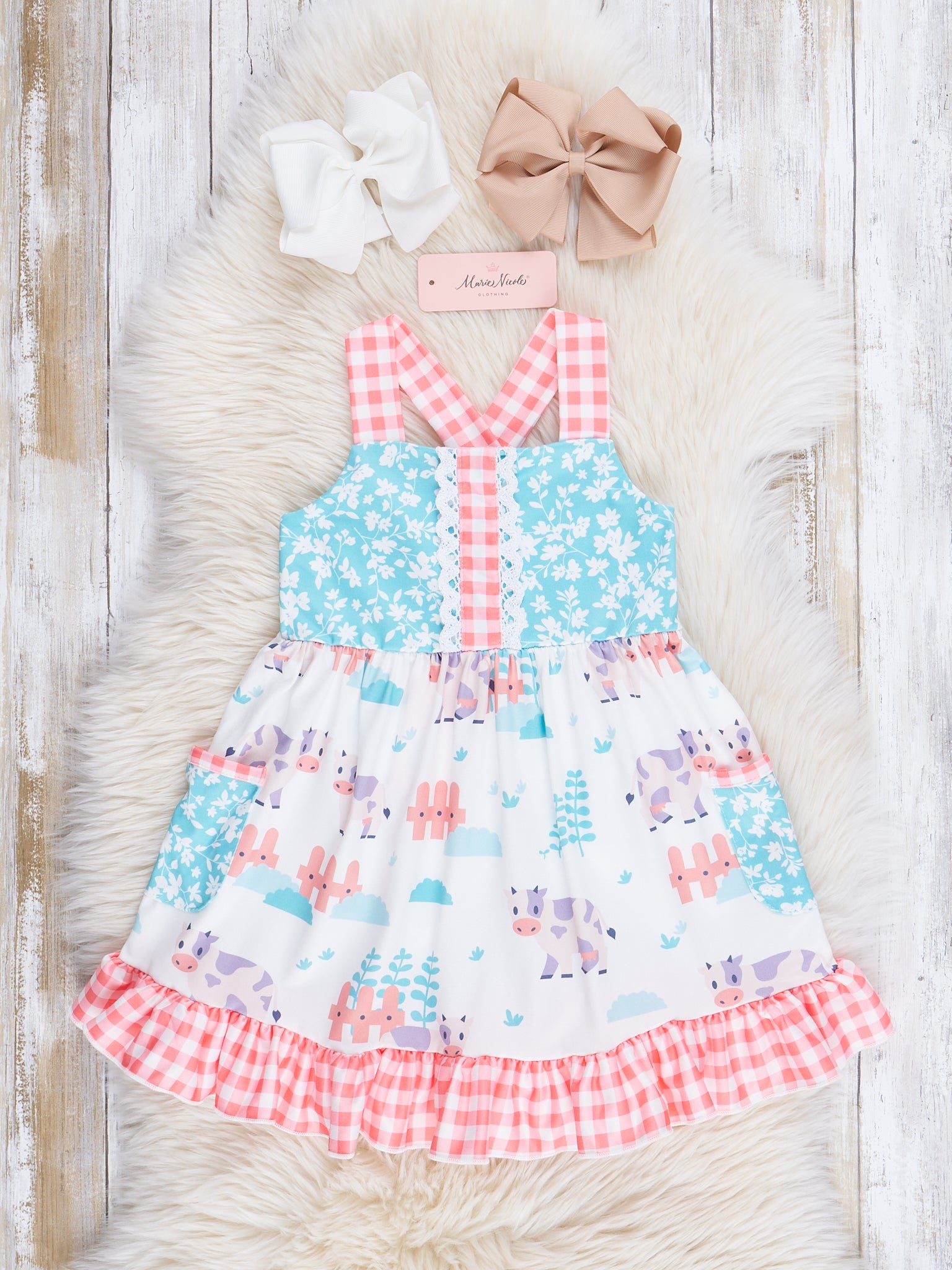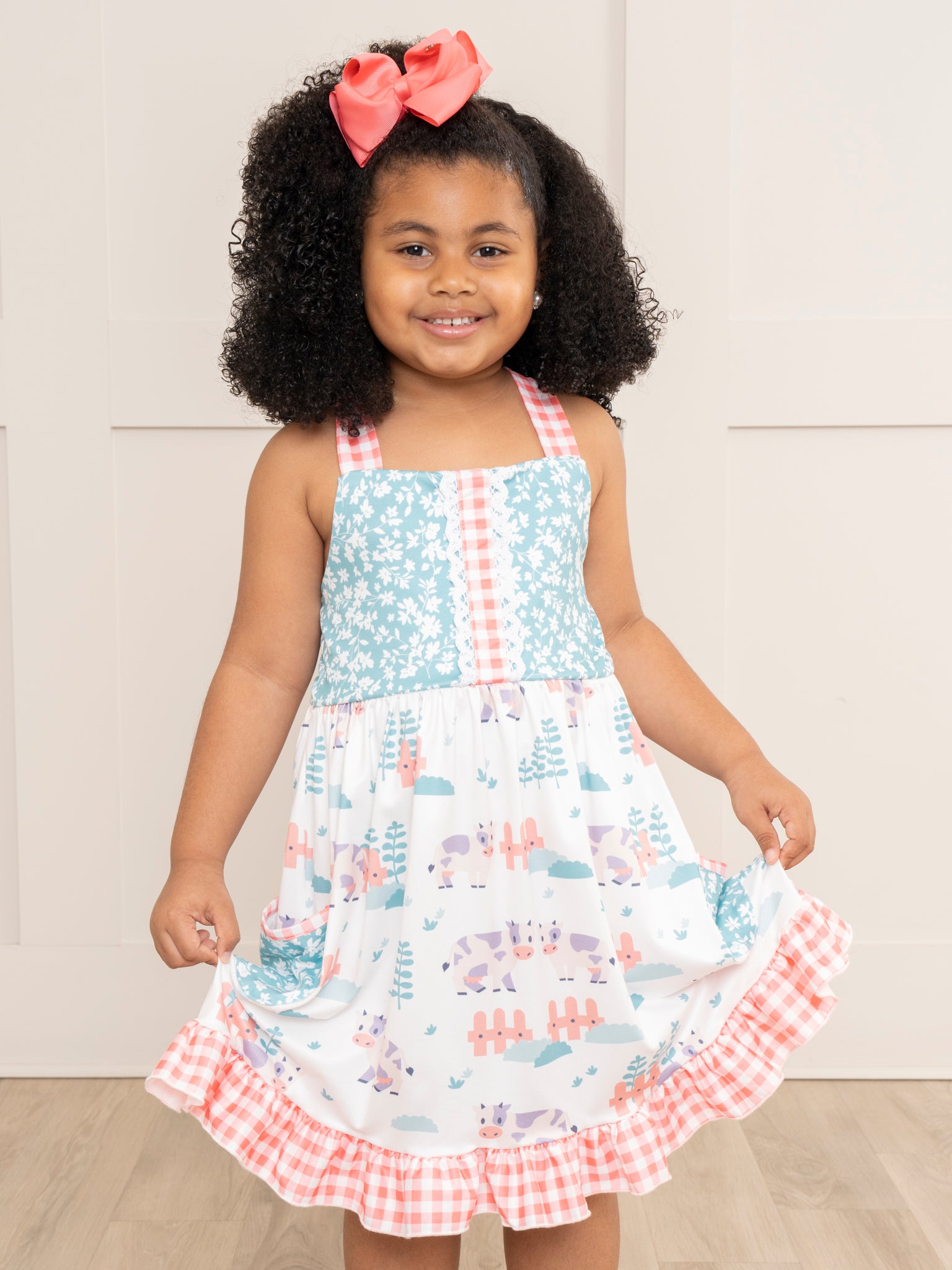 This charming dress combines country charm with floral flair. The red gingham trim accents a colorful floral bodice & cute farm friends printed skirt. Complete with a playful ruffle hem, this dress is perfect for the free-spirited fashionista. Yeehaw! Shop the complete sister set!