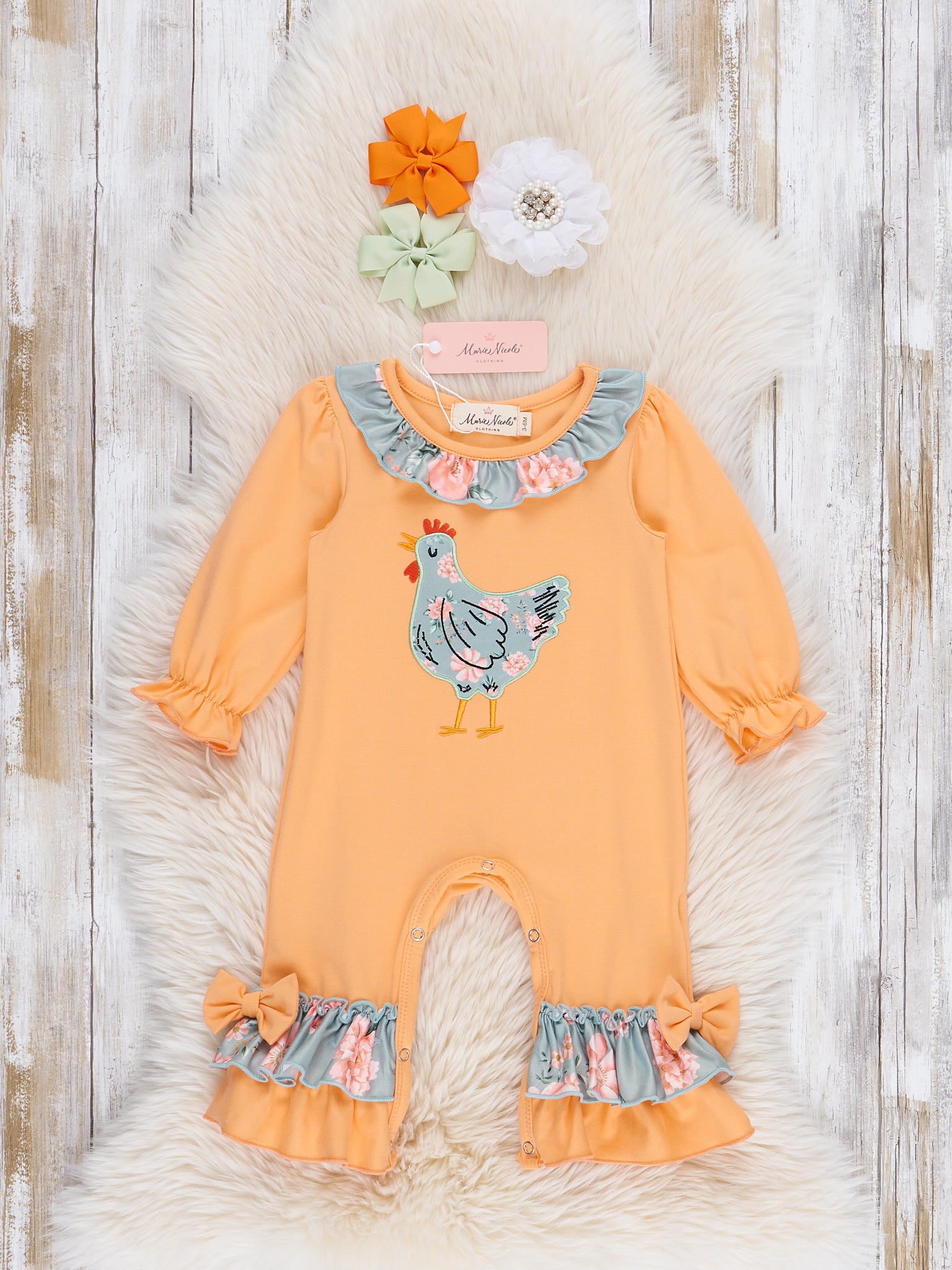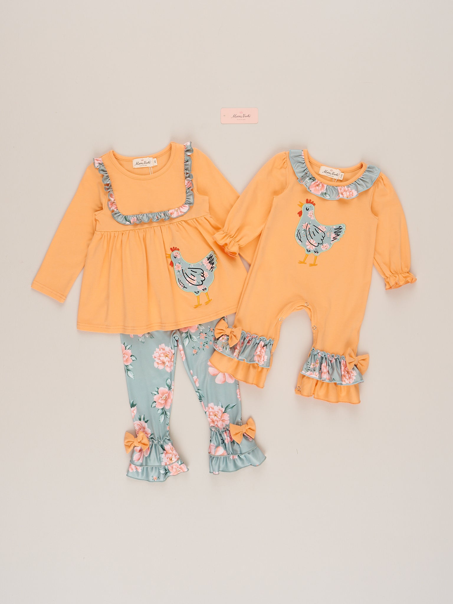 The Farmhouse Floral Chick Romper is a charming and playful set perfect for little ones who love all things farm and flowers. Featuring a sweet floral print paired with adorable chick embroidery, this romper from Marie Nicole Clothing blends rustic charm with everyday comfort. Soft, breathable, and easy to wear, it’s ideal for playdates, family outings, or any day she wants to show off her farmhouse flair.