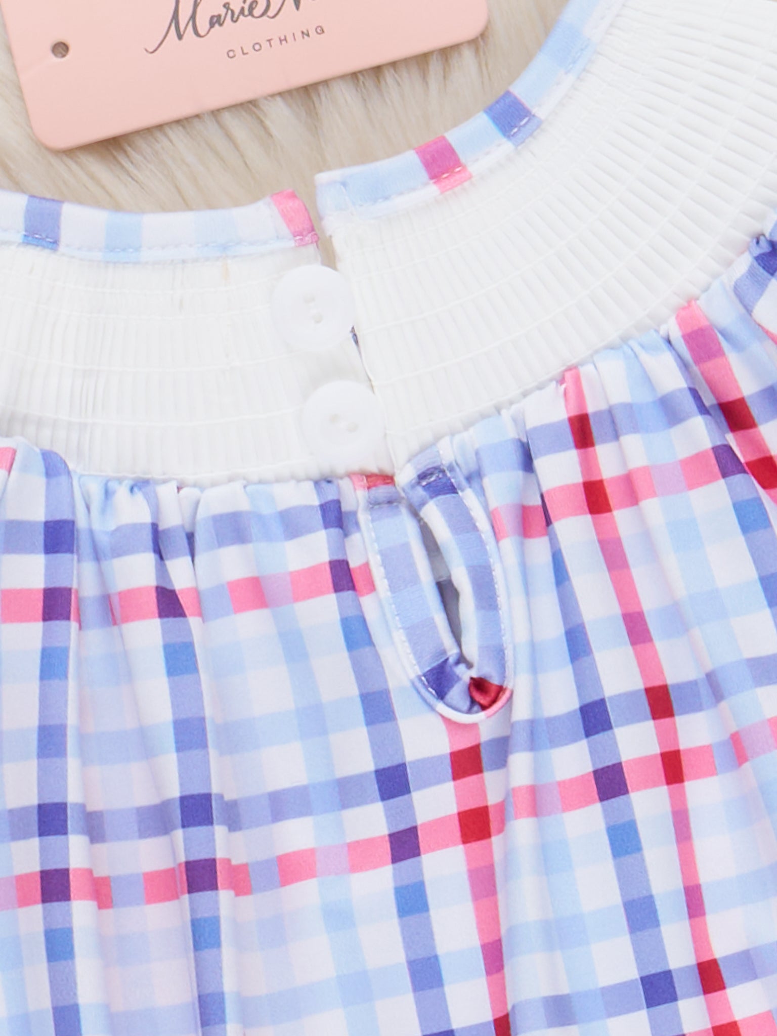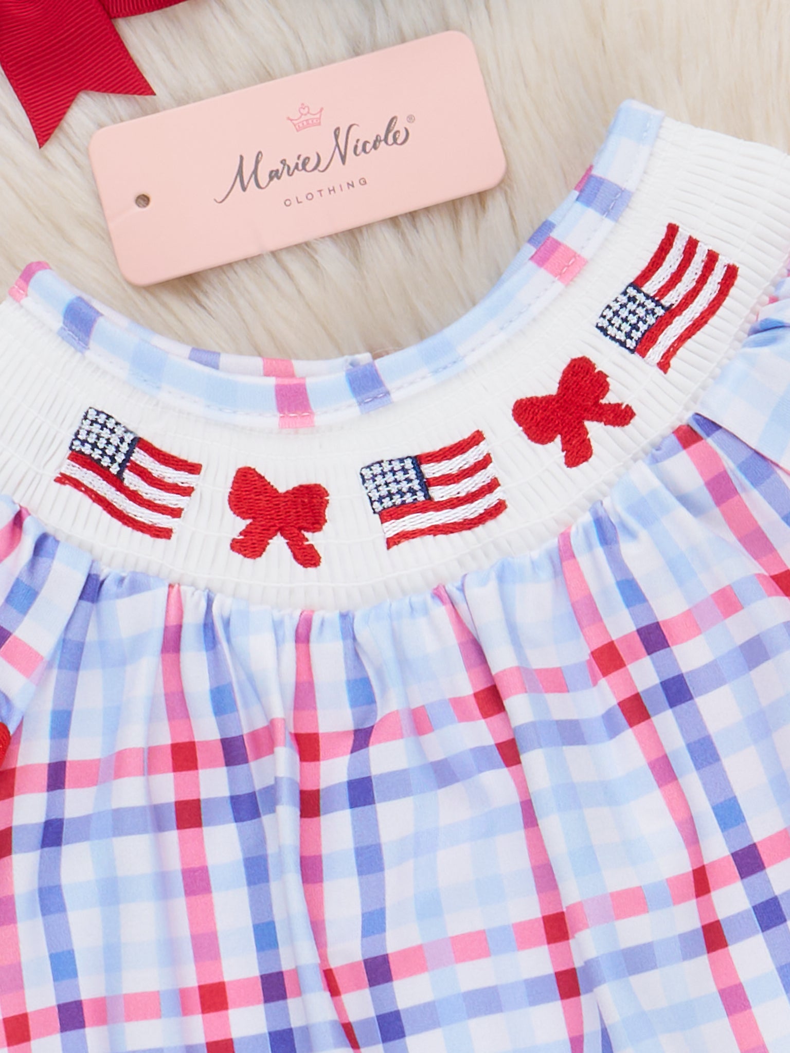 Get ready to parade in style with our Flag Parade Plaid Flutter Bubble! This girls bubble is perfect for any patriotic occasion, featuring embroidered waving flags & bows on a smocked collar, trendy plaid print, and red trim flutter sleeves. Don't forget to complete the sibling set with Marie Nicole Clothing! Perfect for showing off your love for your country with a touch of playful flair.