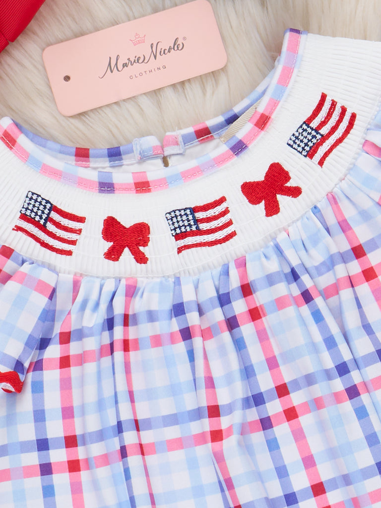 Get ready to parade in style with our Flag Parade Plaid Flutter Dress! This girls dressis perfect for any patriotic occasion, featuring embroidered waving flags & bows on a smocked collar, trendy plaid print, and red trim flutter sleeves. Don't forget to complete the sibling set with Marie Nicole Clothing! Perfect for showing off your love for your country with a touch of playful flair.