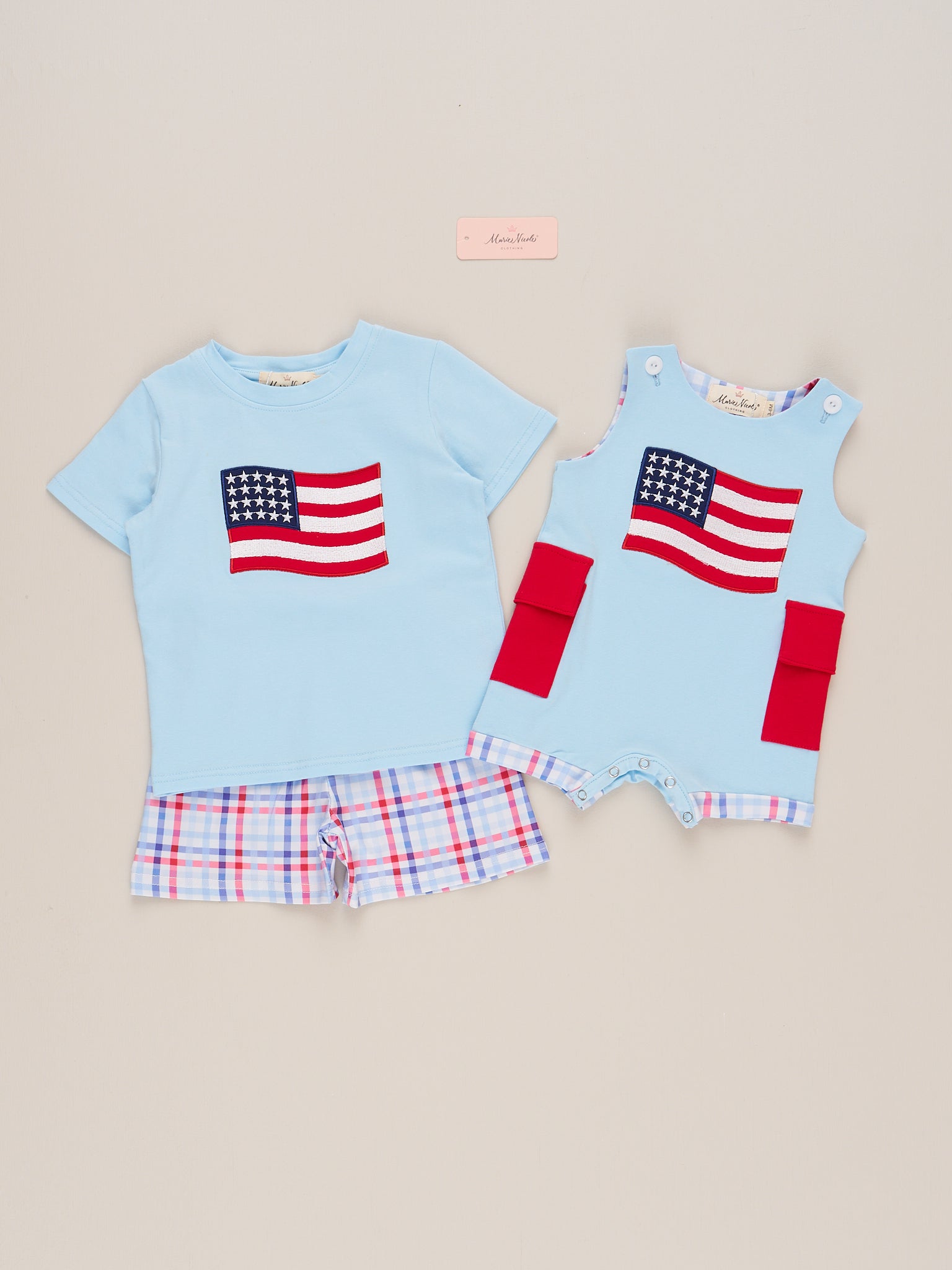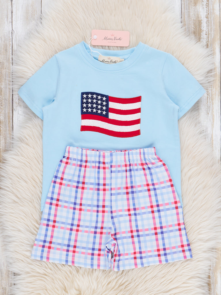Get ready to parade in style with our Flag Parade Plaid Outfit! This boys outfit is perfect for any patriotic occasion, featuring an embroidered waving flag and trendy plaid shorts. Don't forget to complete the sibling set with Marie Nicole Clothing! Perfect for showing off your love for your country with a touch of playful flair.