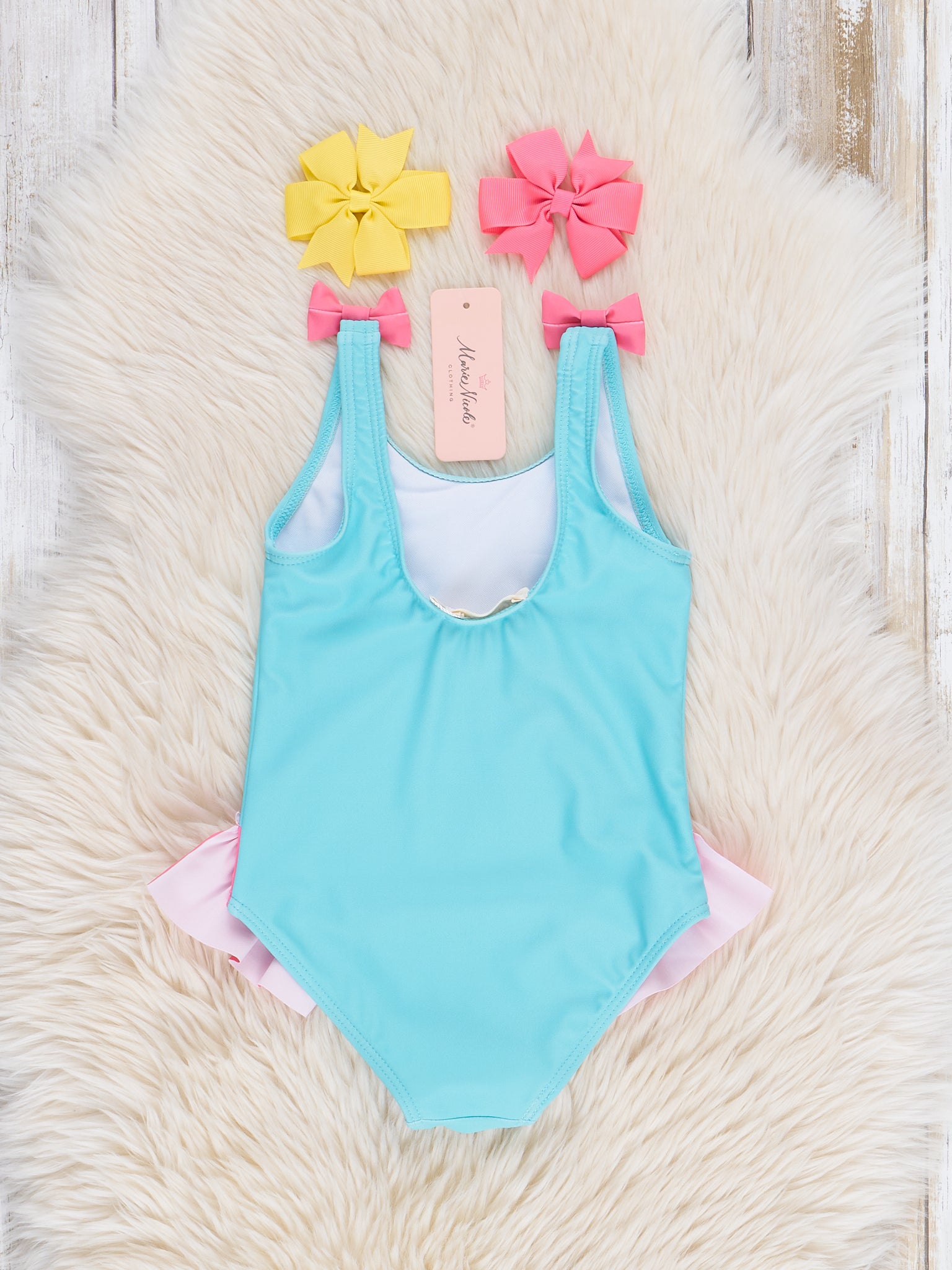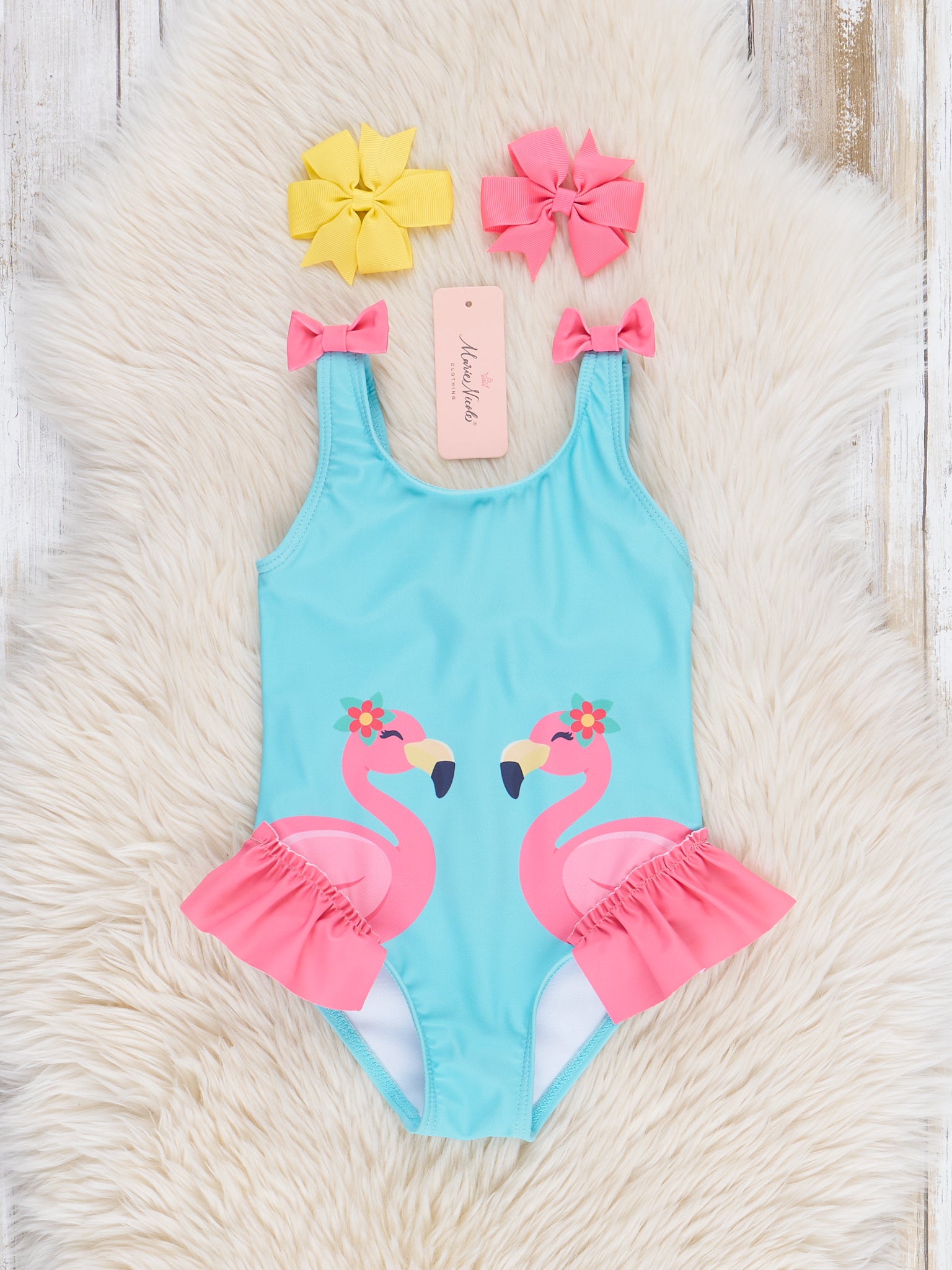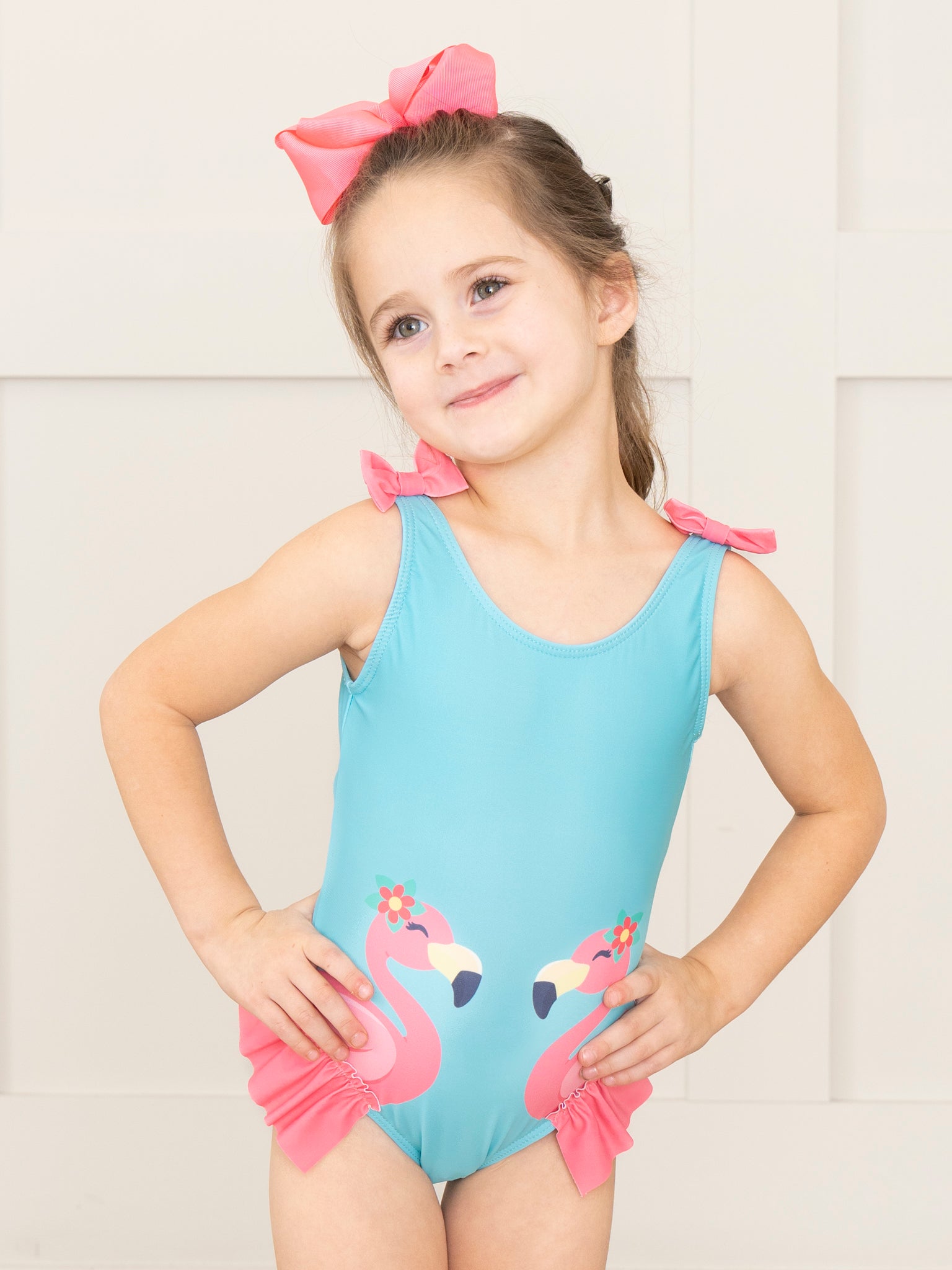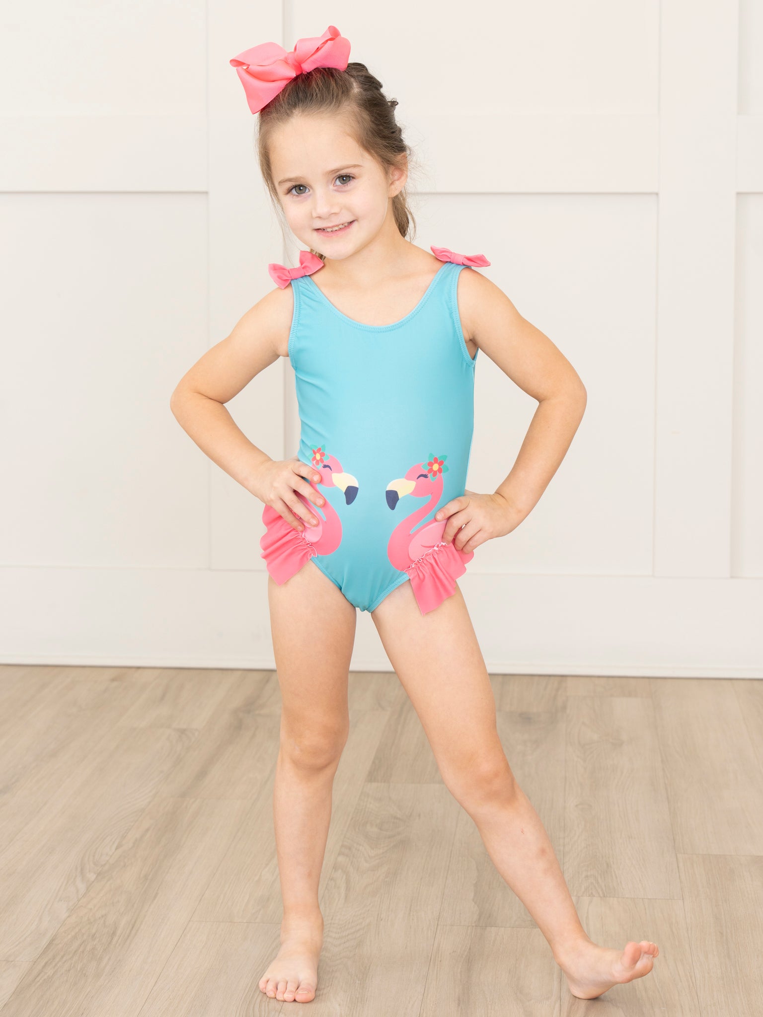 Get ready to make a splash with our Flamingo Feathers Ruffle Swimsuit! Perfect for summer days at the pool or beach, this girls swimsuit features a playful flamingo design with adorable ruffle feathers and ocean blue bodice. The pink bow strap details add a fun and stylish touch. From Marie Nicole Clothing.