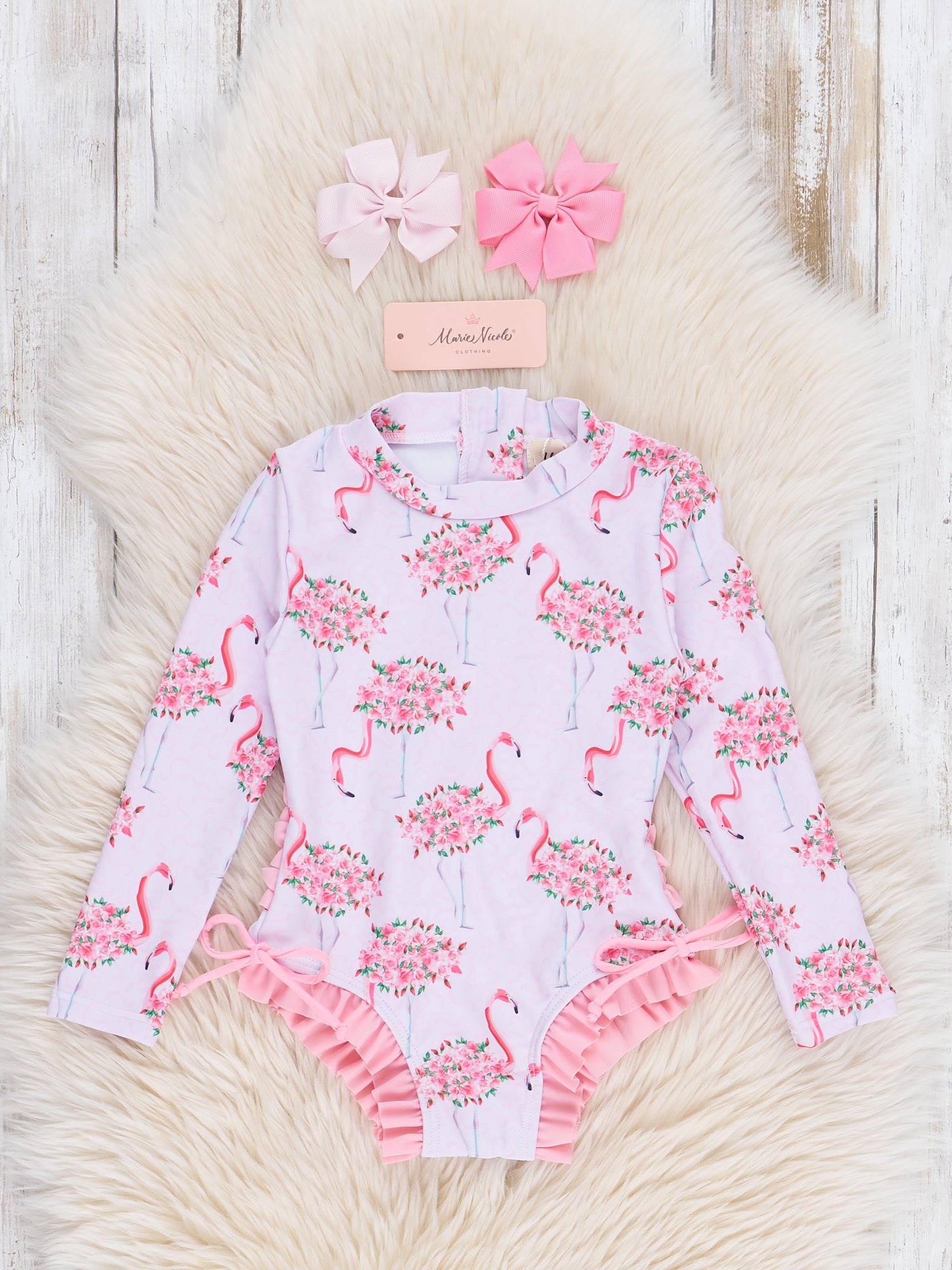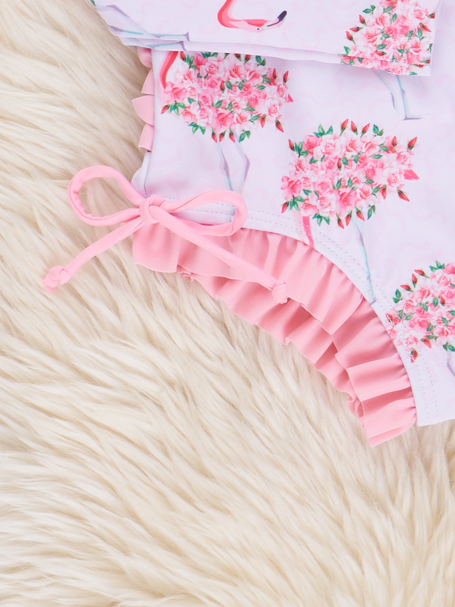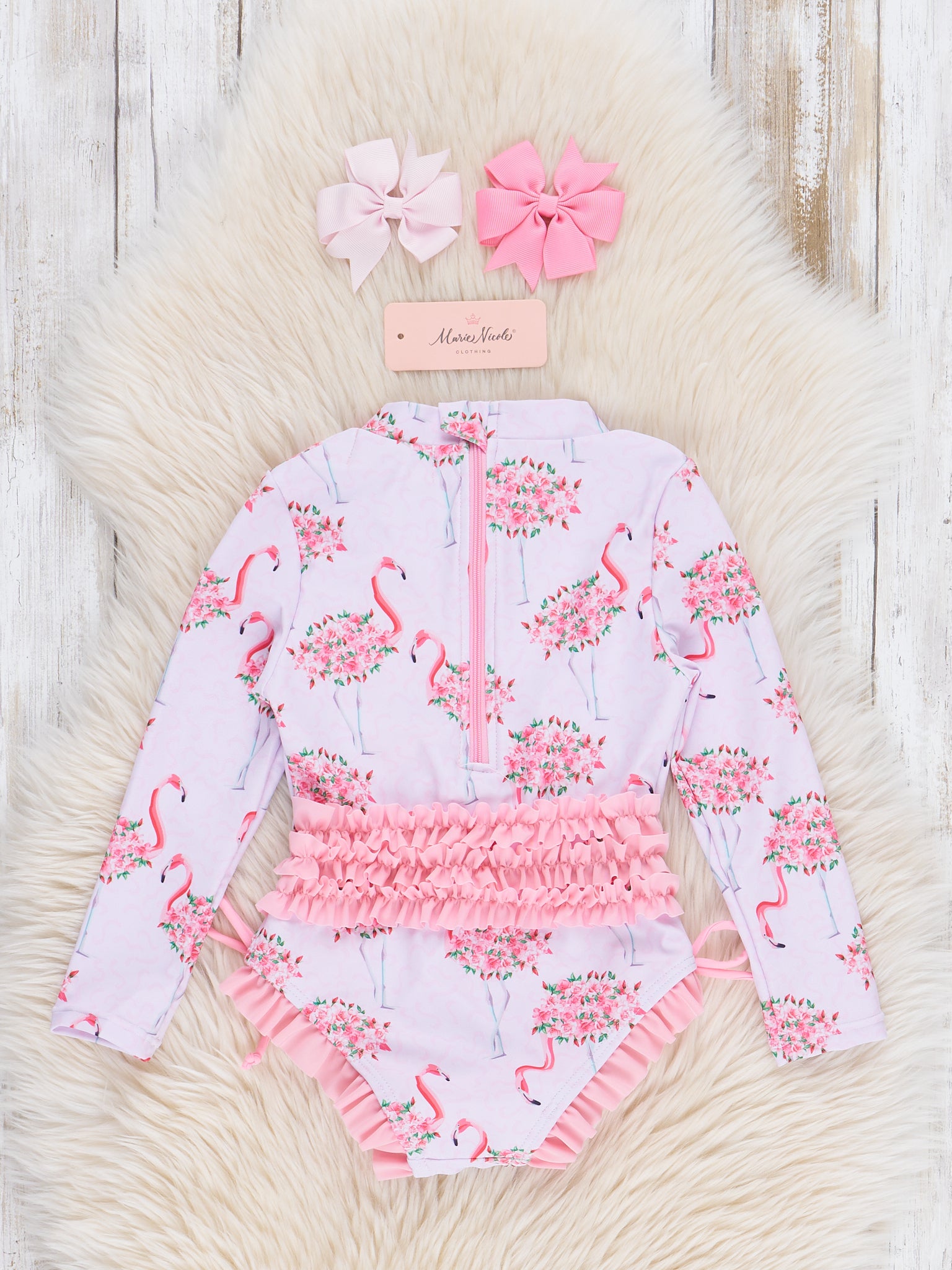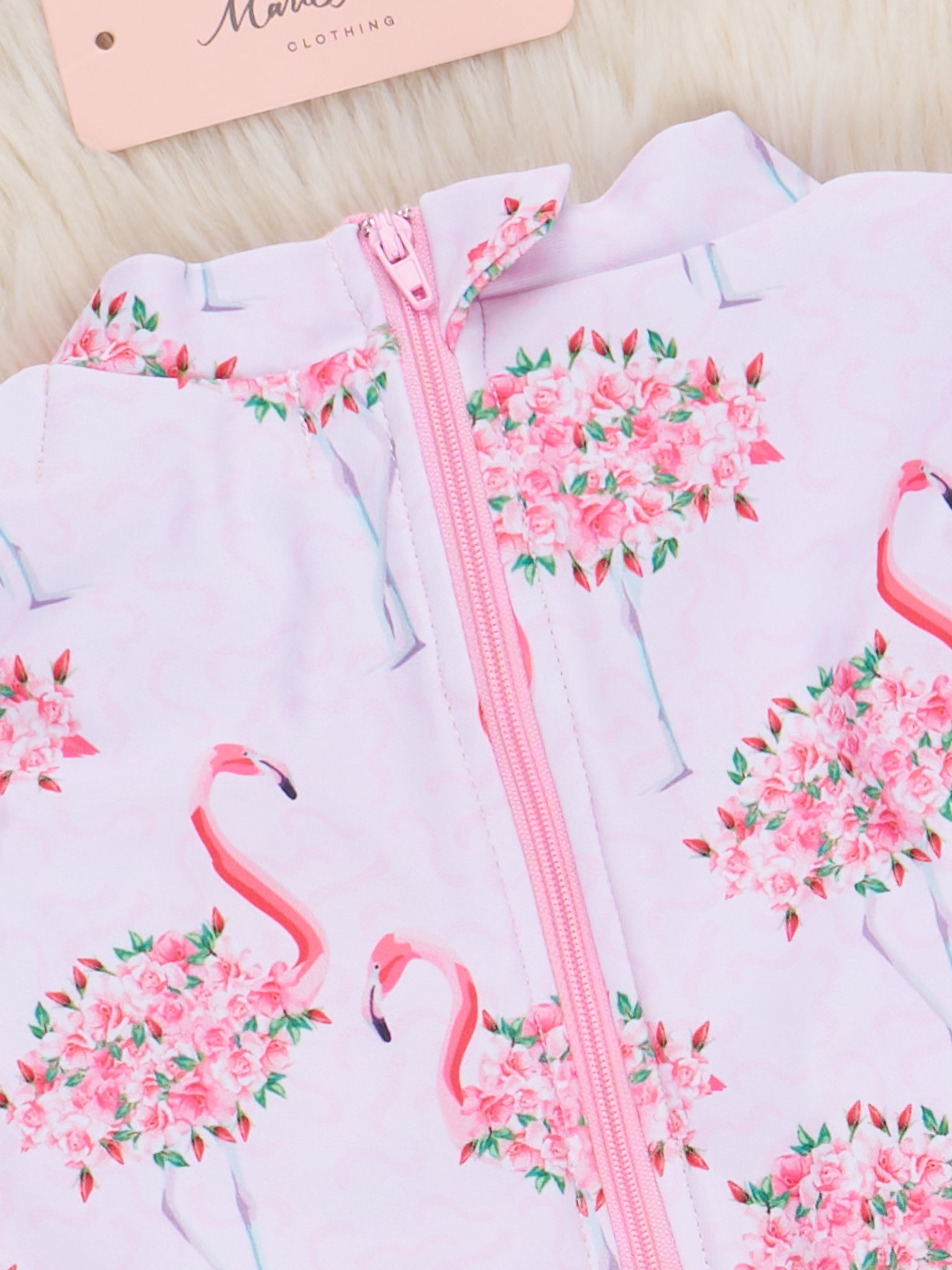 The Flamingo Parade Ruffle Rashguard by Marie Nicole Clothing is a vibrant and fun rashguard perfect for sunny days at the beach or pool. Featuring a playful flamingo print and cute ruffles along the edges and on the back, this rashguard offers both style and protection.
