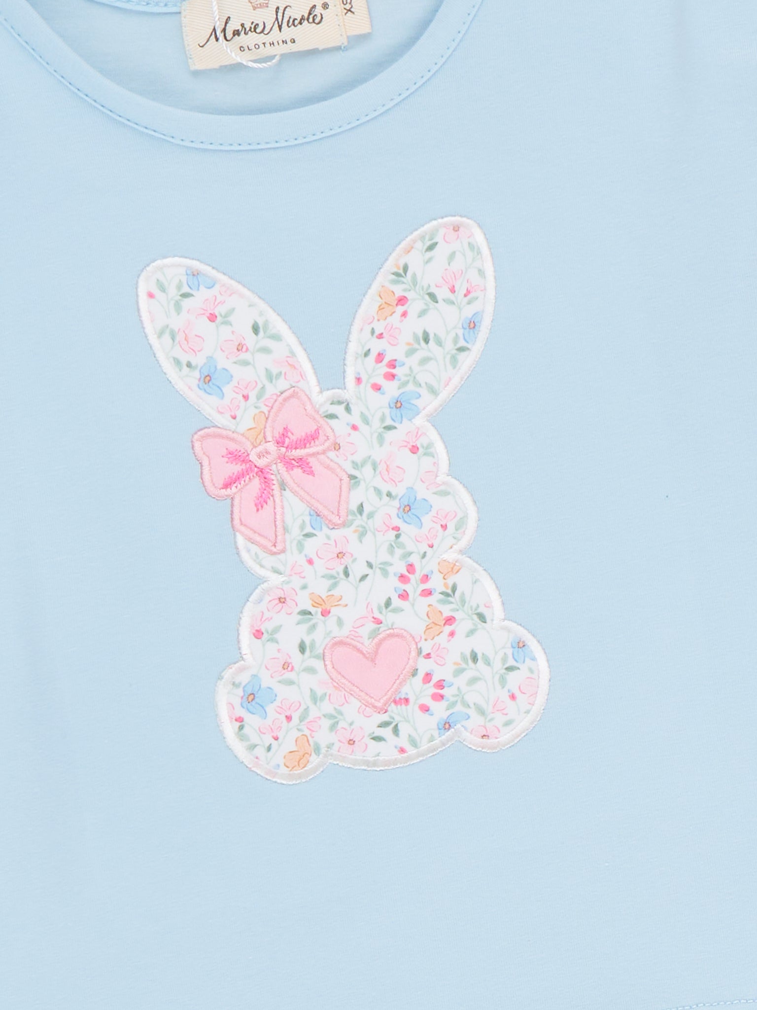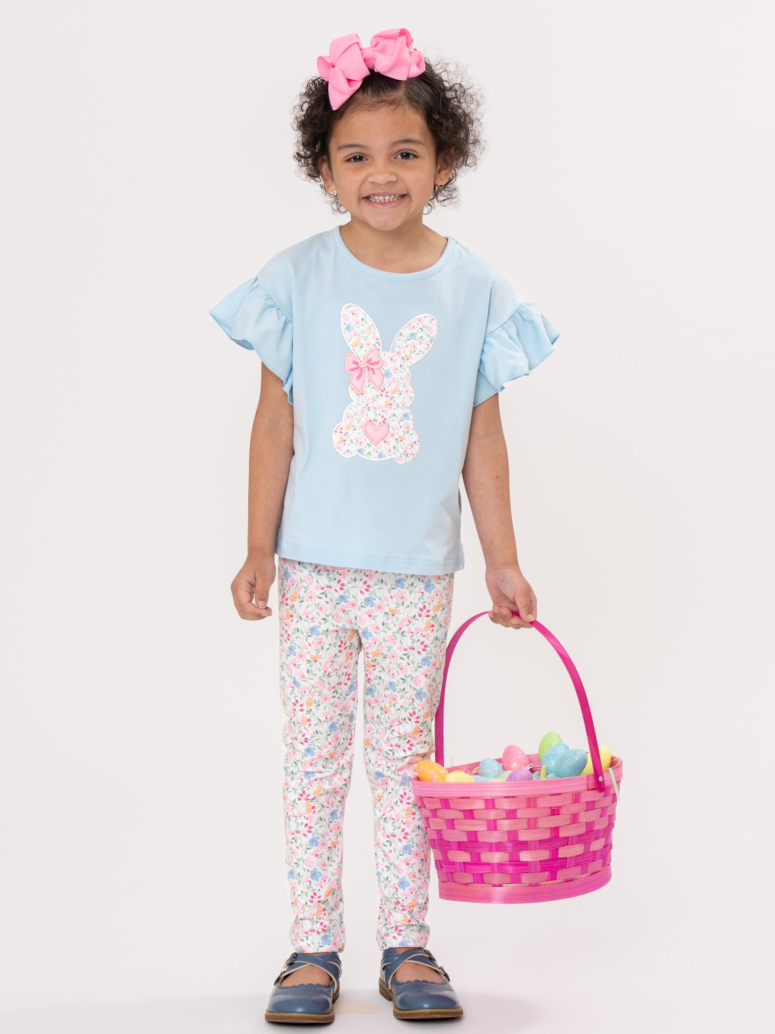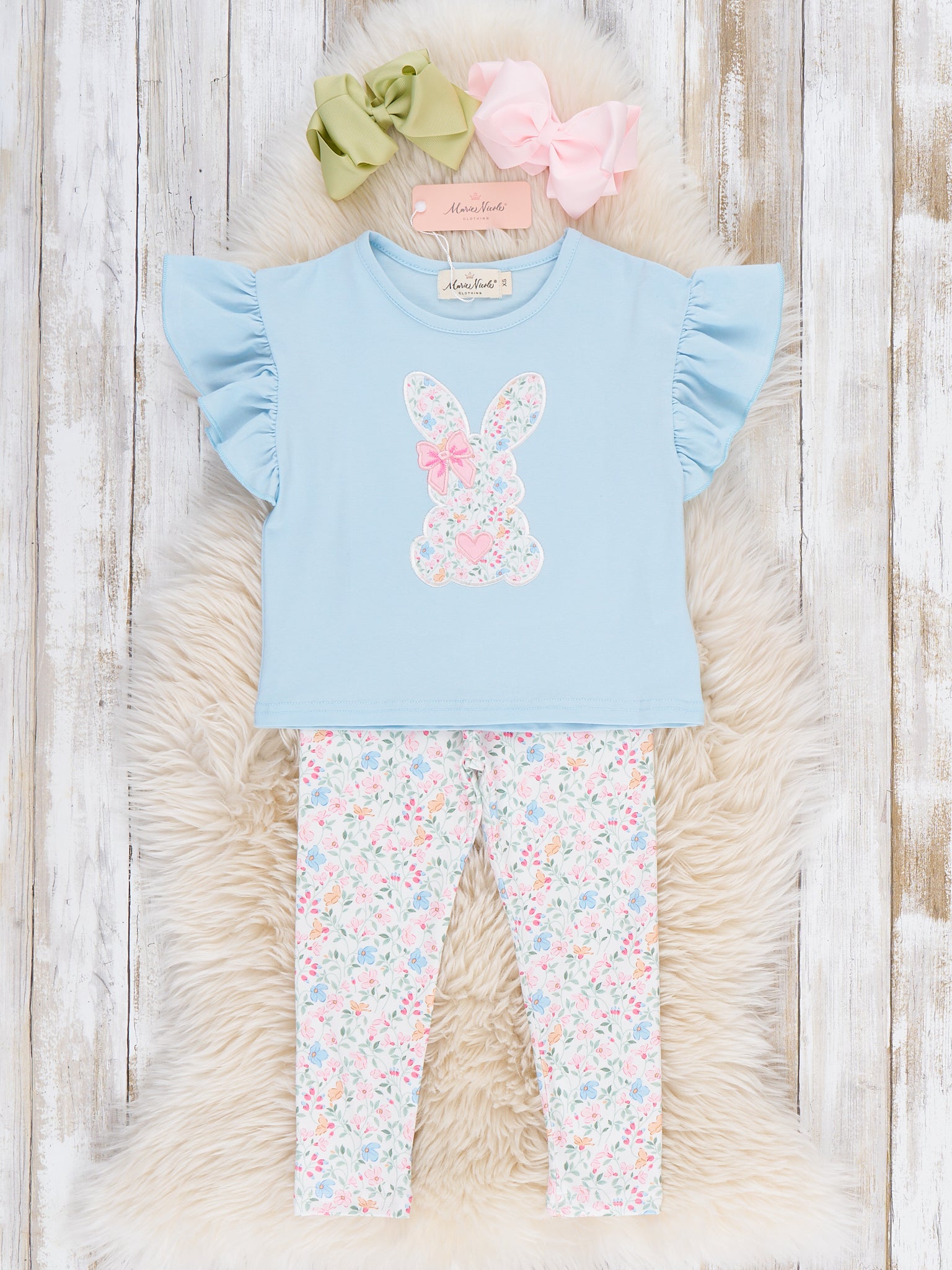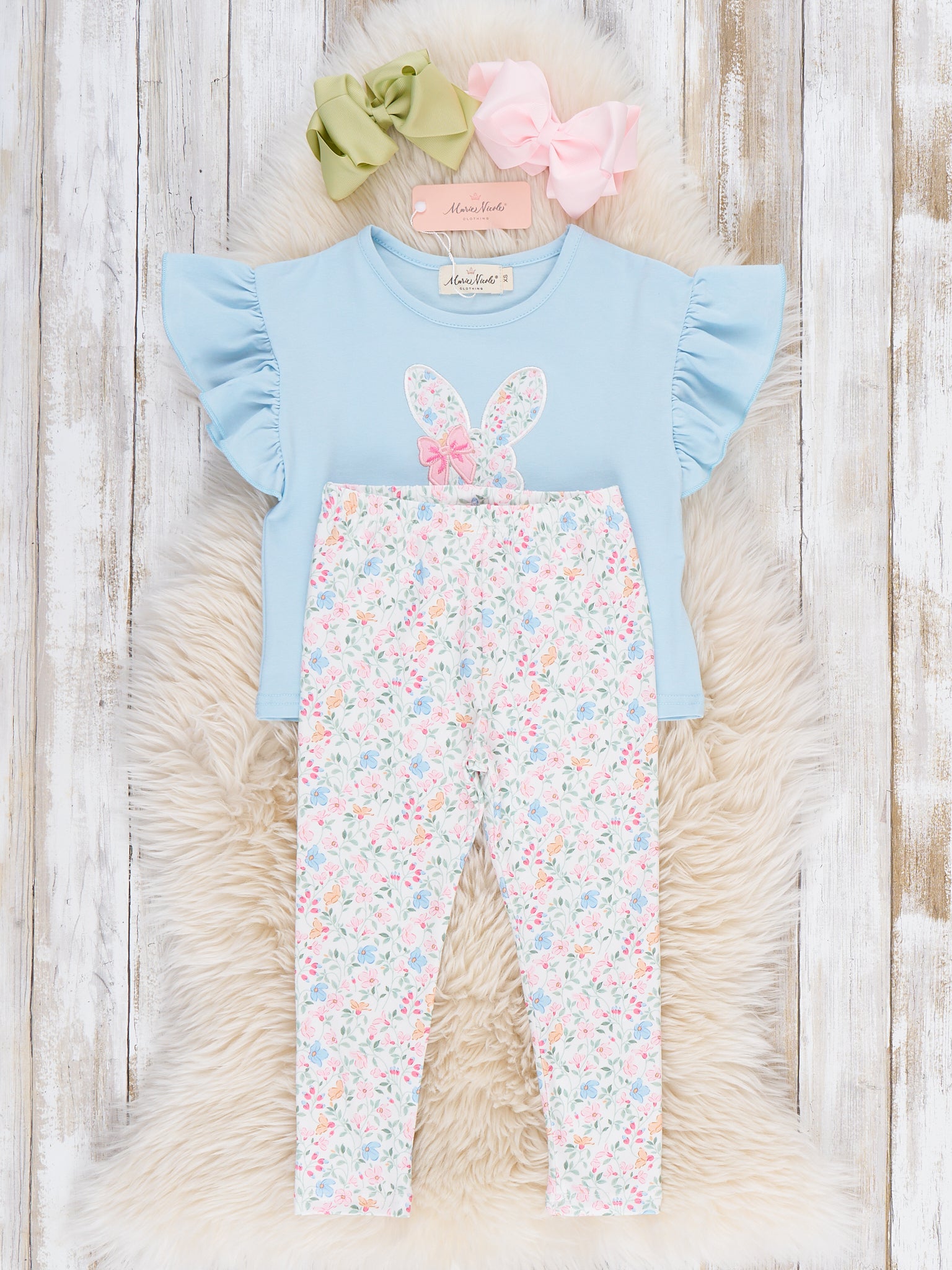 The Floral Ears Flutter Embroidered Outfit by Marie Nicole Clothing pairs a flutter-sleeve top featuring a floral bunny applique with coordinating allover floral leggings. Soft, stretchy fabrics keep little ones comfy for all-day play, while the slim leggings slide easily into boots or sandals. Perfect for spring outings, school parties, and picture-ready bunny fun with a touch of garden sweetness.