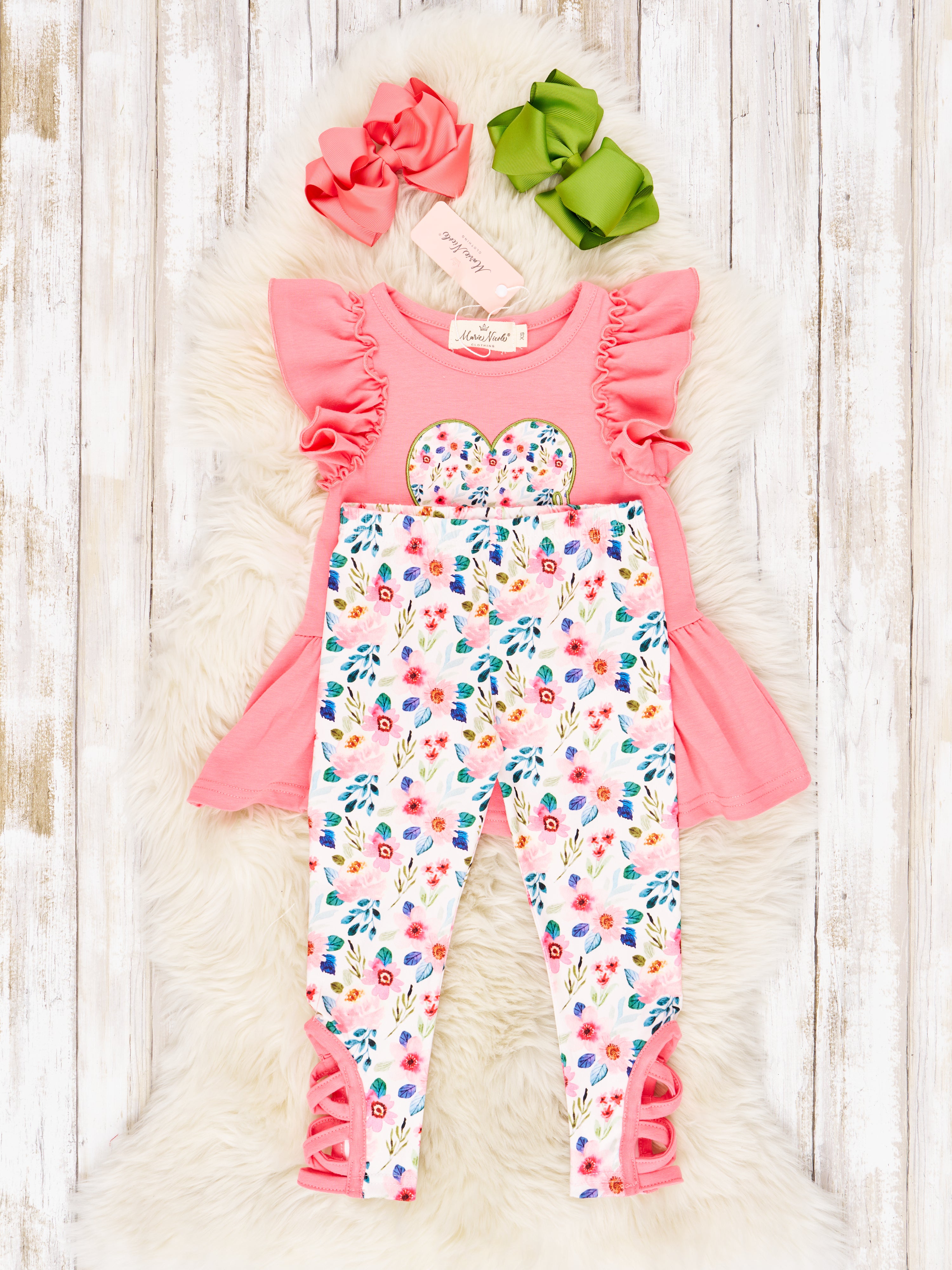 Your little one will look absolutely adorable in this Floral Heart Ruffle Outfit! Featuring a pink peplum top with an adorable heart appliqué, and a pair of floral pants, this set will make your kiddo the most stylish on the playground.