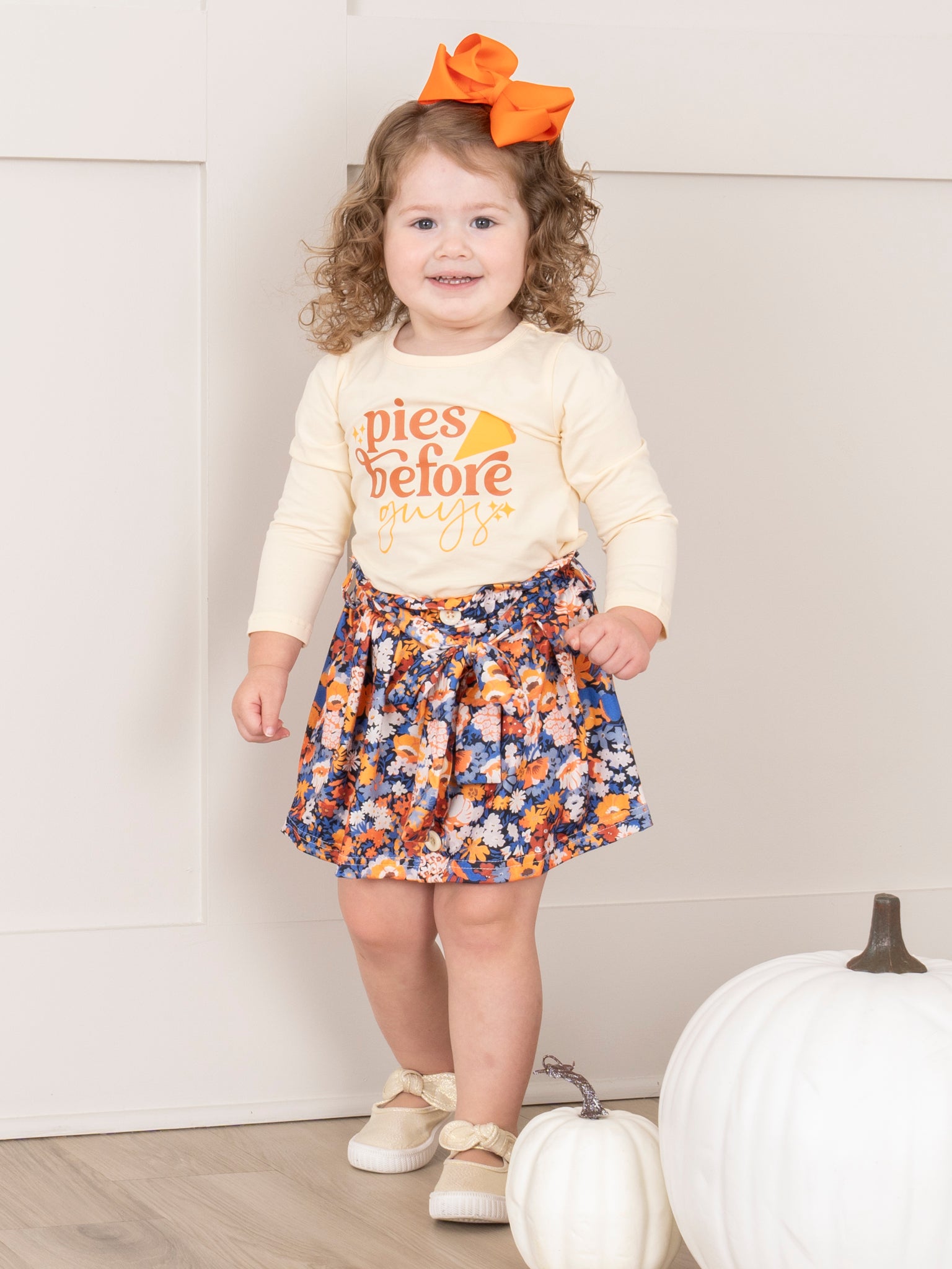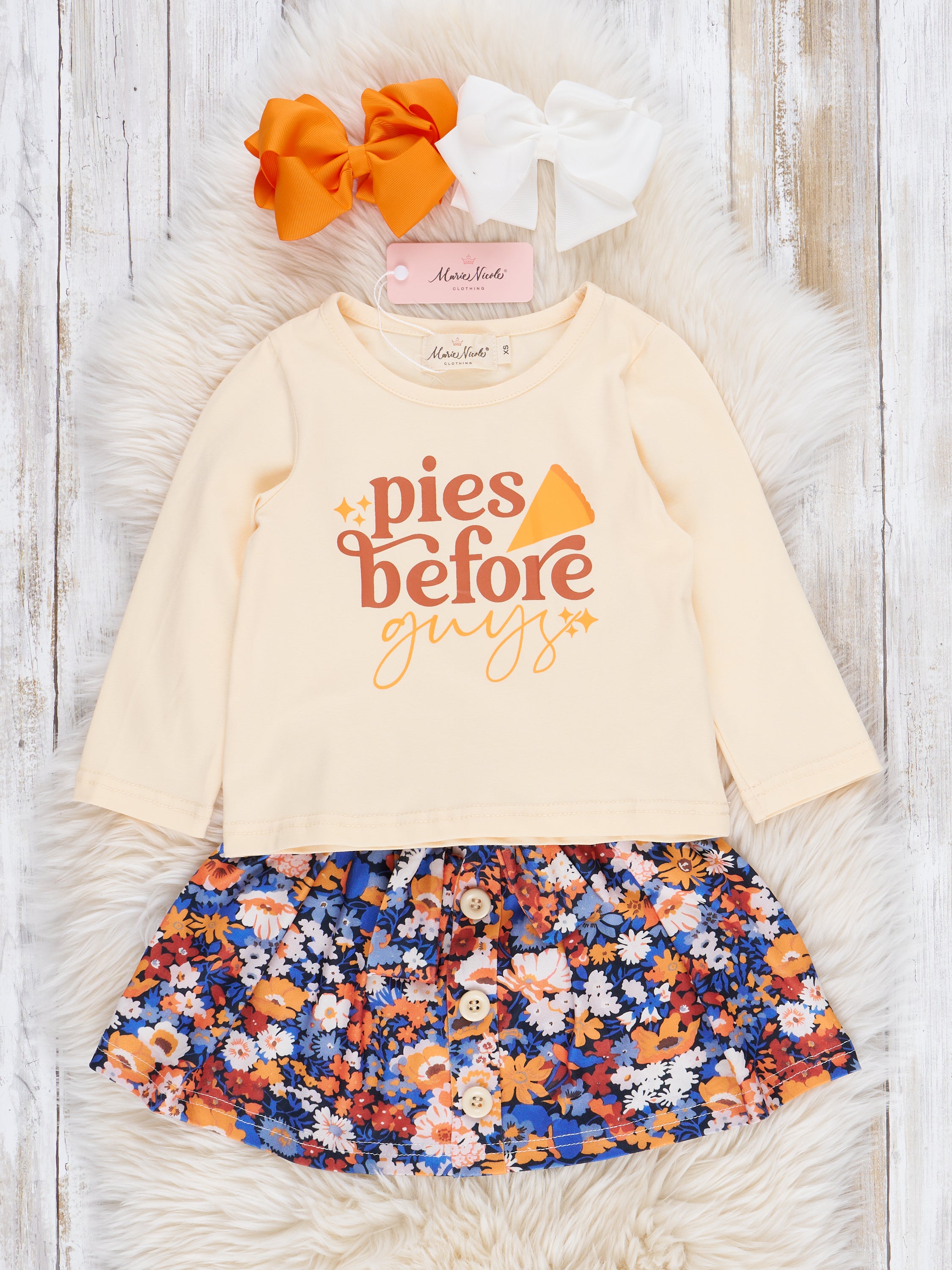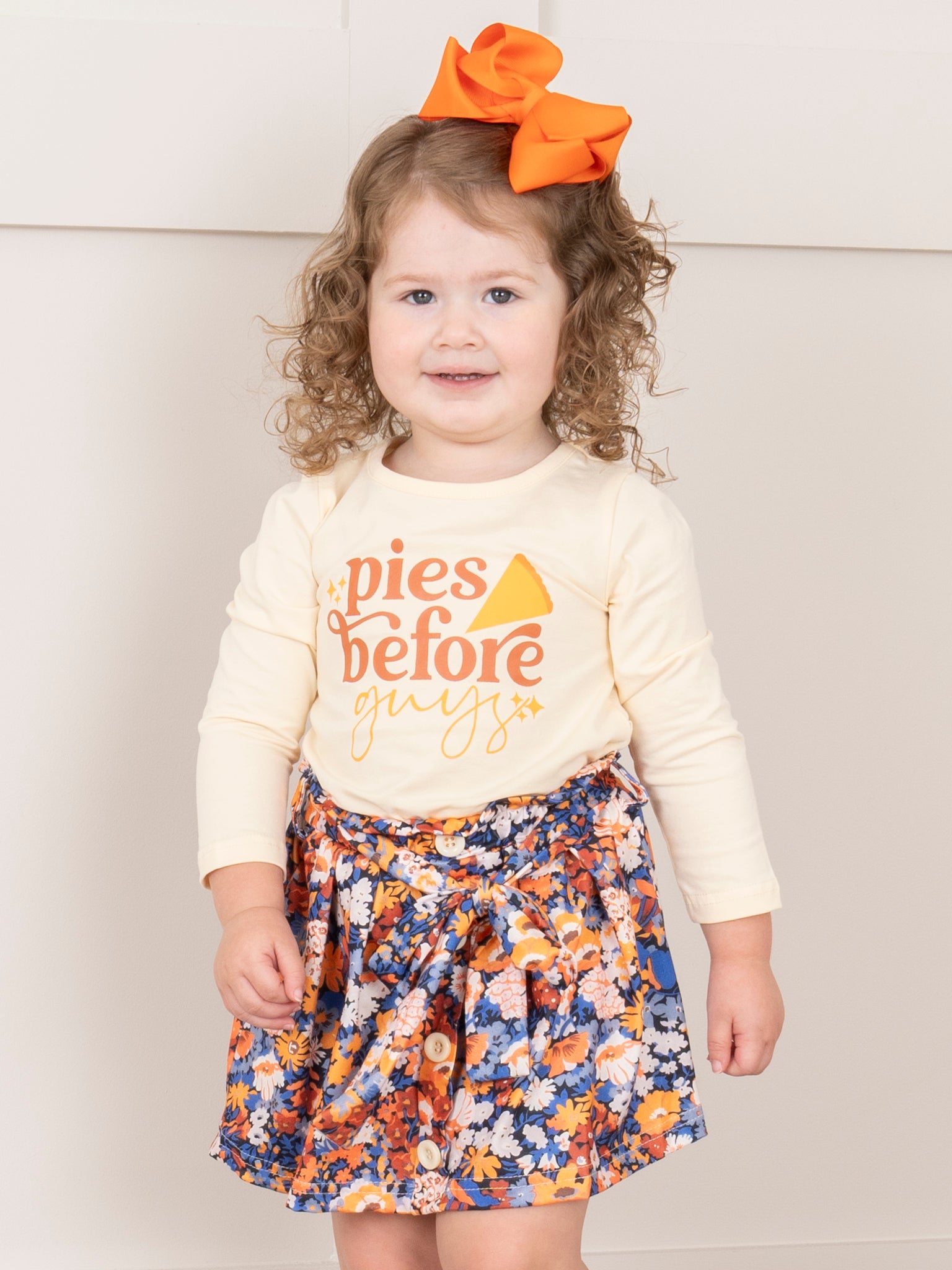 Get ready to rule the autumn fashion scene with this playful "Pies Before Guys" outfit! Featuring a charming floral skirt, this girls' ensemble is perfect for Thanksgiving and beyond. Leave your worries behind and let this quirky outfit remind you to prioritize the sweeter things in life. No boys allowed!