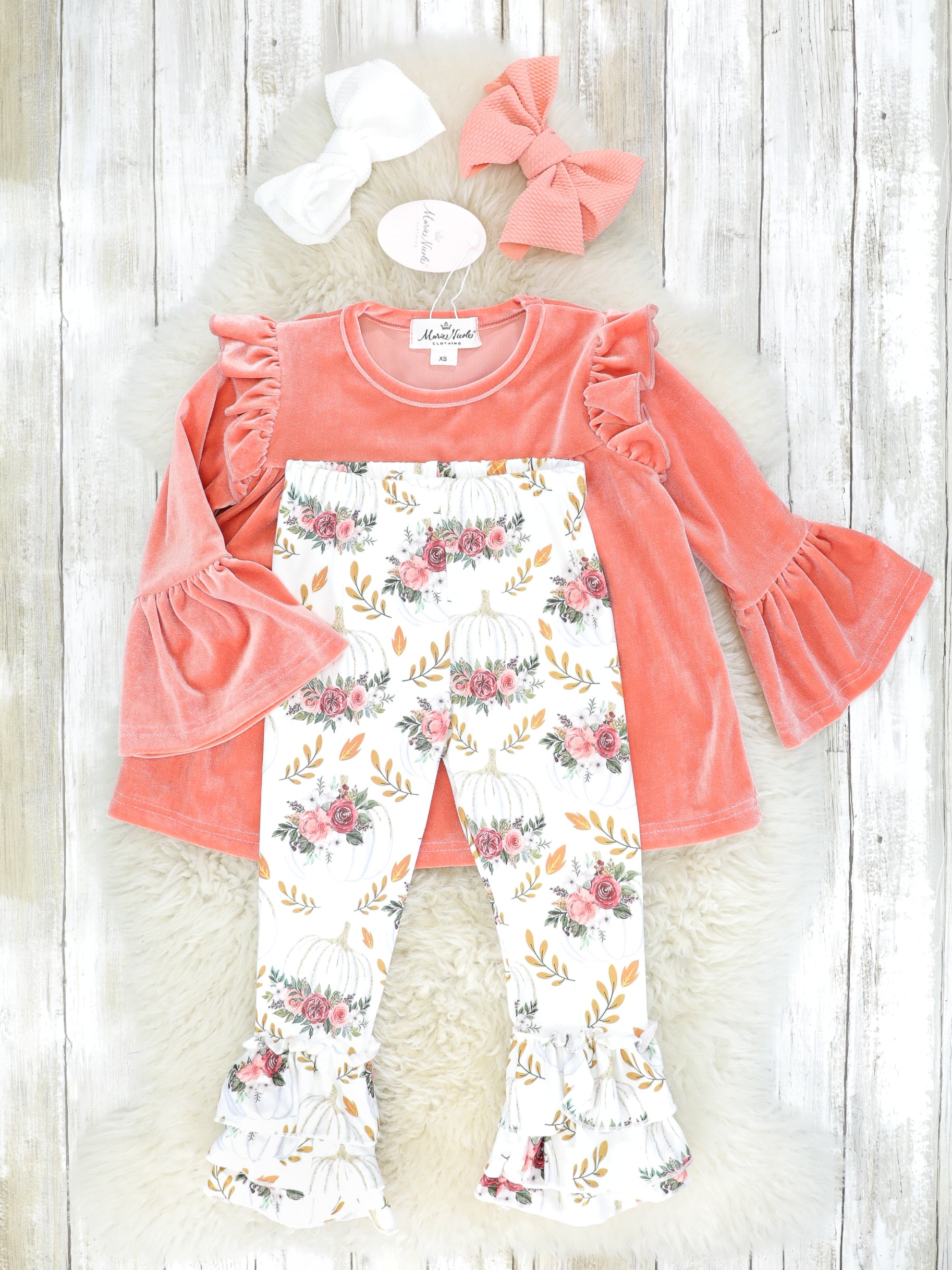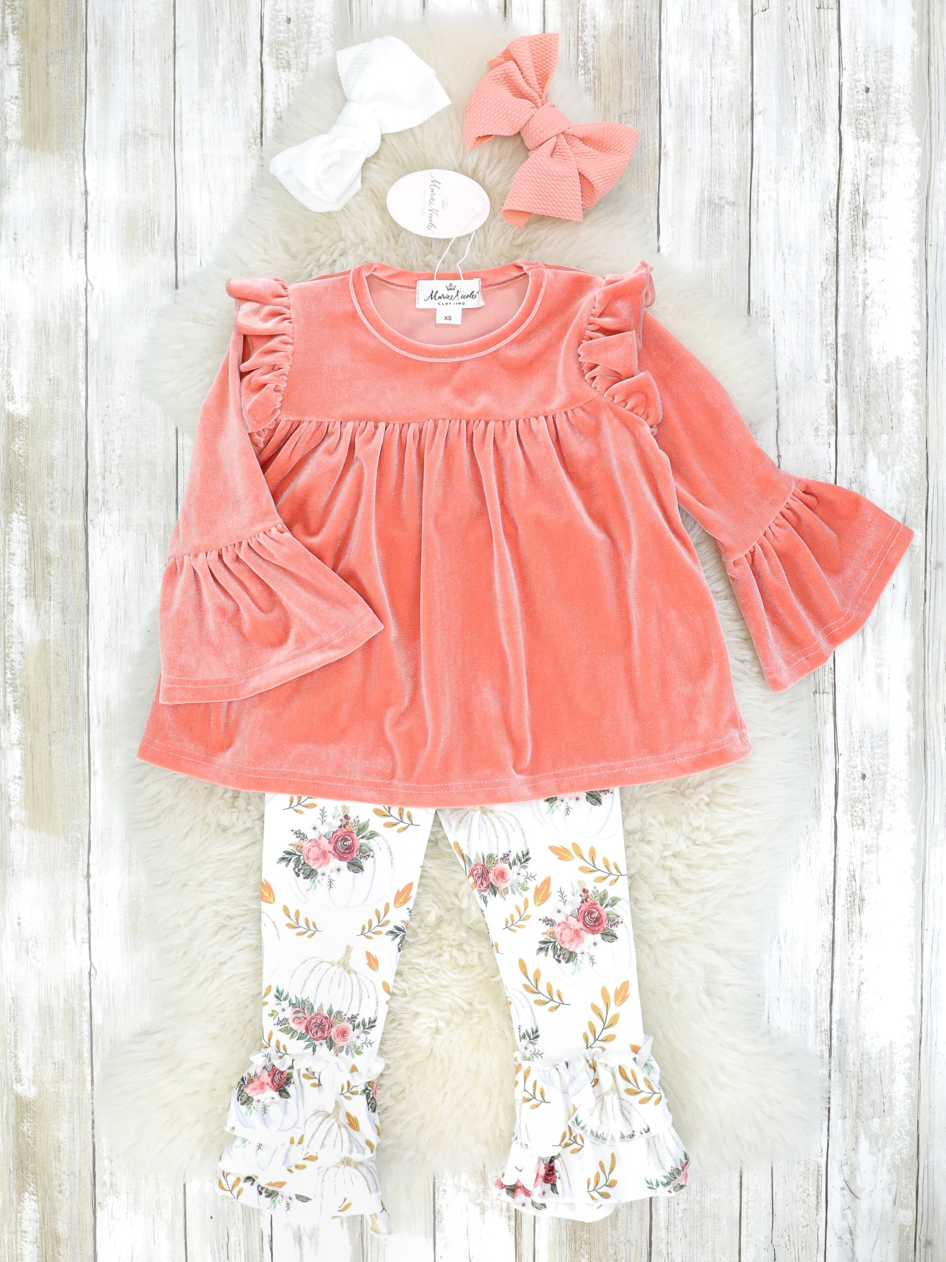 We have the best velvet sets to keep your girls warm & in style! This outfit features a blush velvet tunic with flutter trim, bell sleeves, & a stunning floral pumpkin design bottoms with ruffles at the ankles.