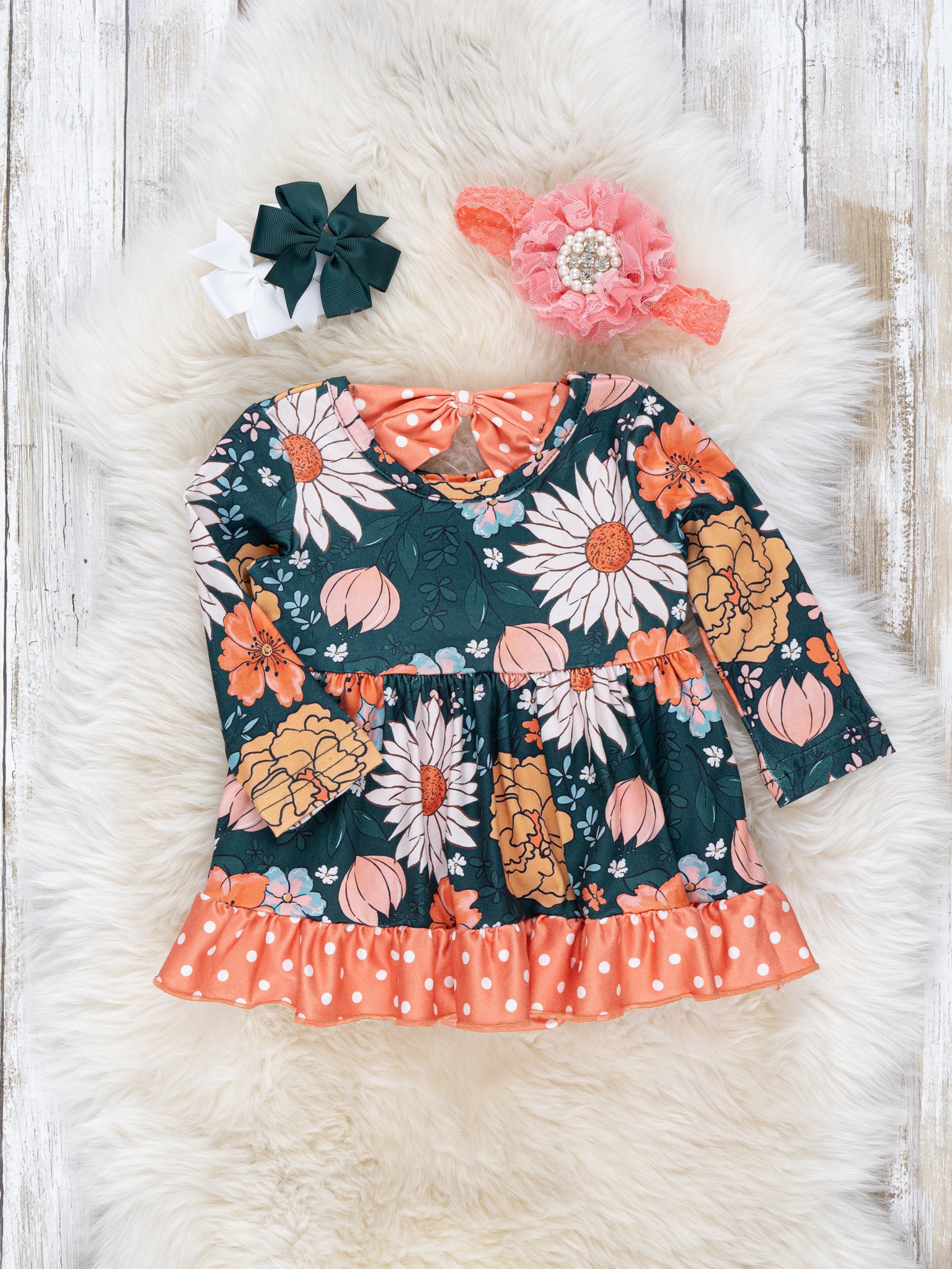 Flower power! This floral romper features a coral polka dot ruffle hem & criss-cross back with a scoop neck and long sleeves. Shop the matching dress here!